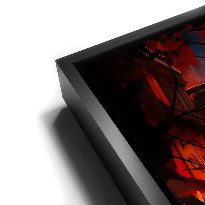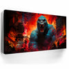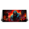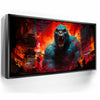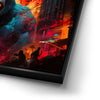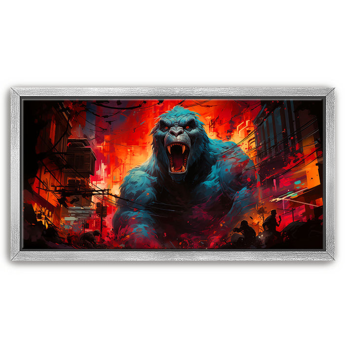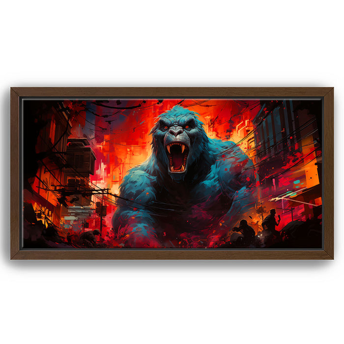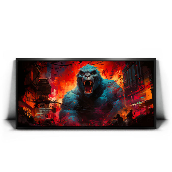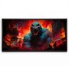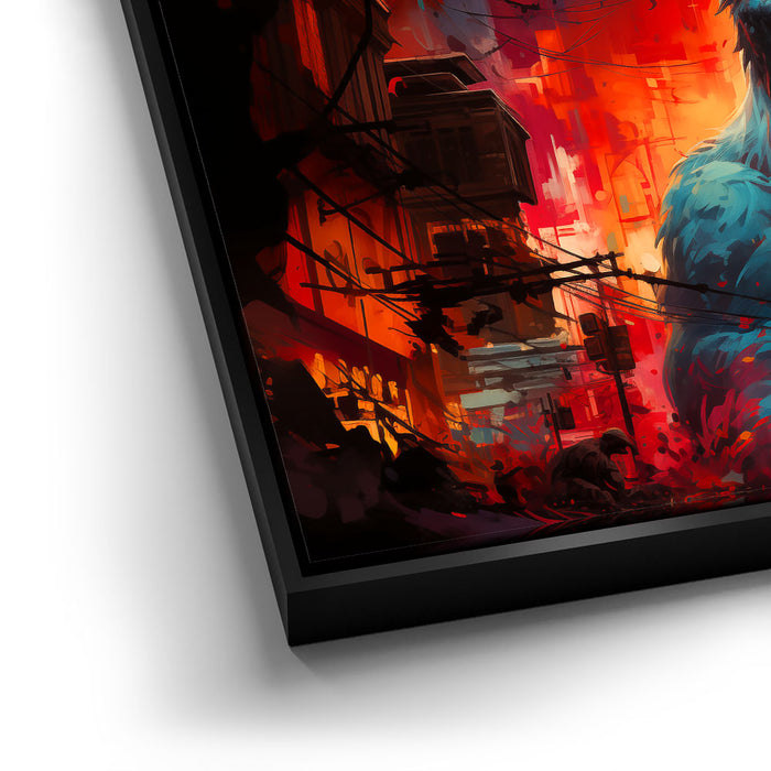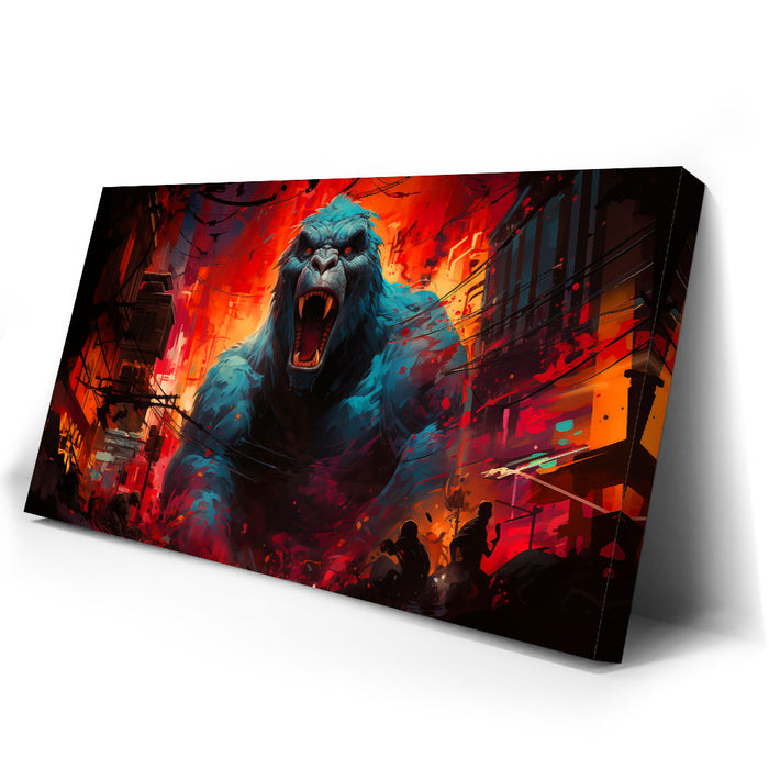 "Rampage" by Sean Pearce is a bold abstract wall art piece that captures the chaos and fury of wild animals on a destructive path. Featuring a monstrous gorilla-like beast reminiscent of Godzilla and George from classic creature films, this artwork blends fire, rage, and urban destruction into a vivid, explosive scene.
