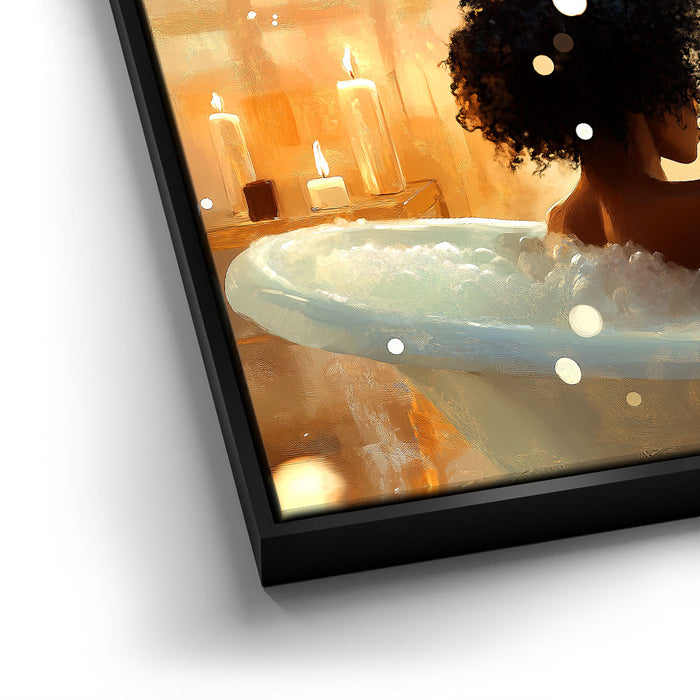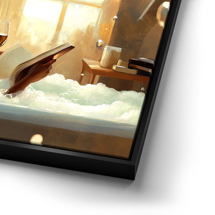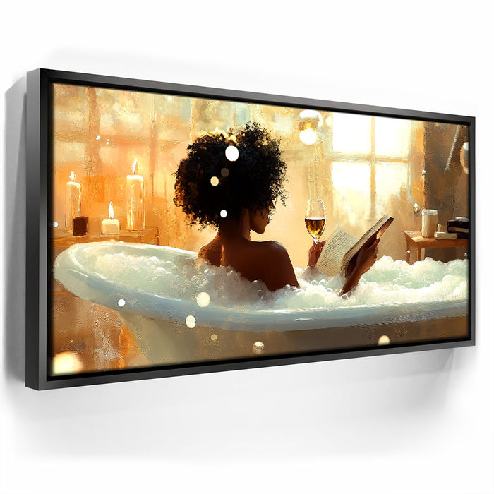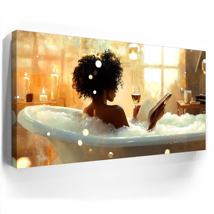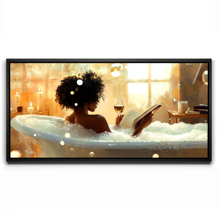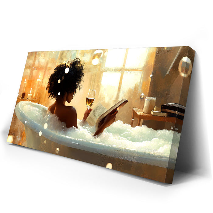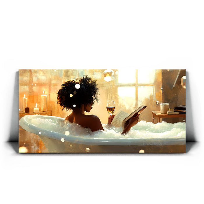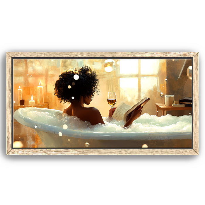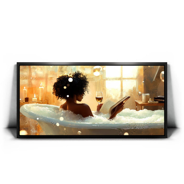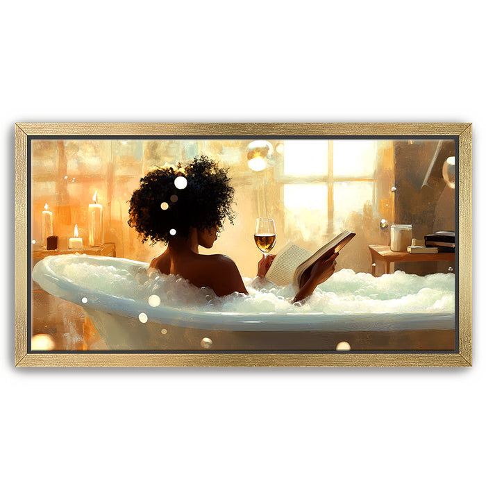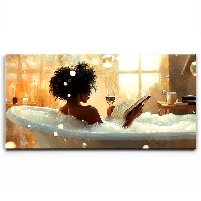 "Read Between the Wines" by Kandise King captures the serene essence of self-care and relaxation. This enchanting artwork features a woman soaking in a bubble-filled bathtub, a glass of wine in one hand and a book in the other, bathed in the soft glow of candlelight and golden sunlight. The scene evokes peace, luxury, and the bliss of unwinding in a tranquil moment of solitude.