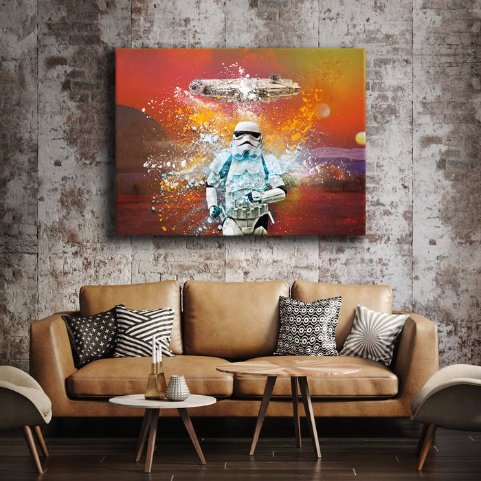 With references to classic moments from "A New Hope," "Empire Strikes Back," and "Return of the Jedi," this graphic art pays homage to legendary Star Wars icons like the Millennium Falcon, the Death Star, and the journey of the Jedi. This piece is a must-have for fans of the galaxy far, far away, offering a striking visual reminder of the Star Wars saga’s unforgettable legacy.