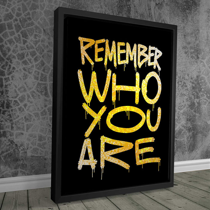 "Remember Who You Are - Paint Drip" is a powerful, motivational piece that uses bold typography and dripping paint effects to inspire self-reflection and positivity. With uplifting words and a striking "paint drip" style, this artwork serves as a reminder to stay true to oneself, embracing identity and purpose. The gold and textured design adds a dynamic, eye-catching element, perfect for creating a motivating atmosphere in any space.