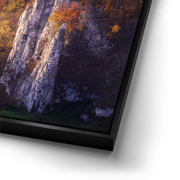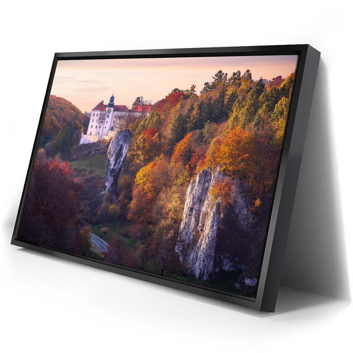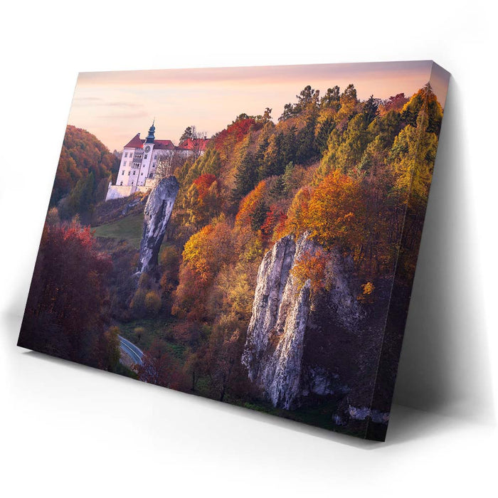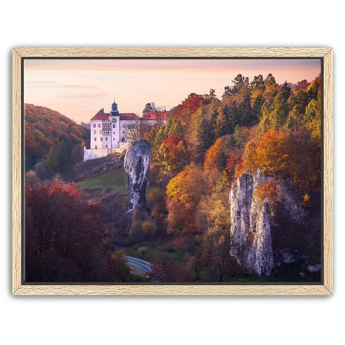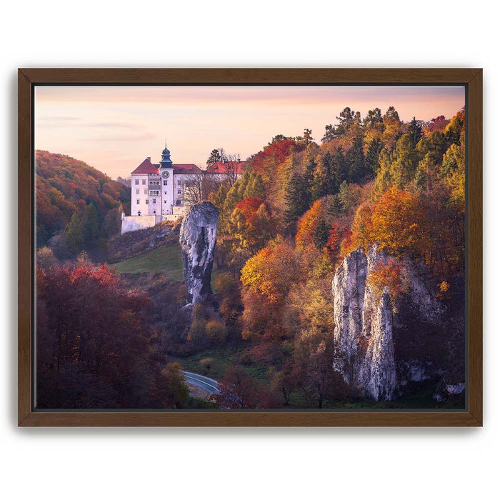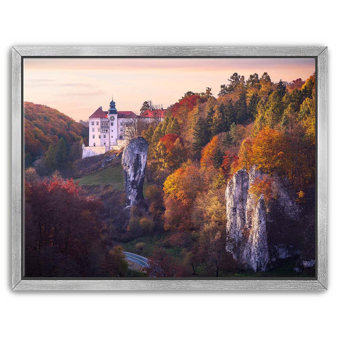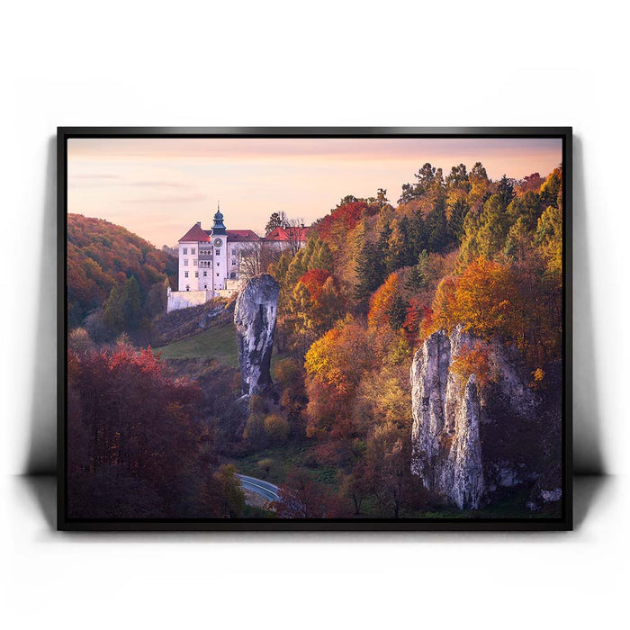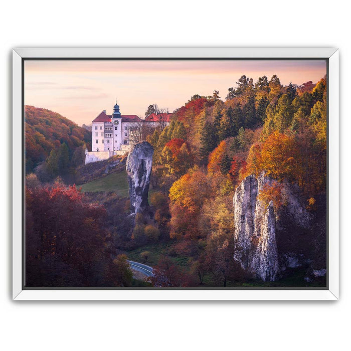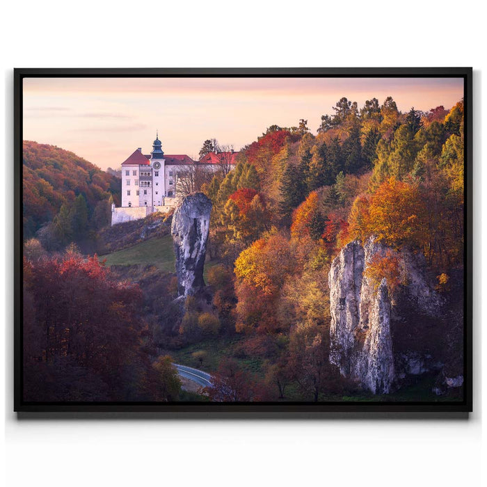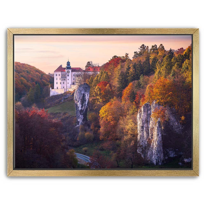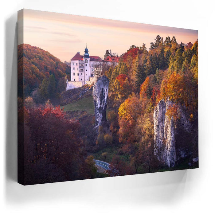"Renaissance Castle" by Marcin Zajac captures the timeless beauty of a historic castle nestled within a vibrant autumn landscape. Surrounded by a forest painted in shades of gold, orange, and red, the castle stands as a testament to the elegance of Renaissance architecture. The dramatic rock formations in the foreground add depth and contrast, blending natural splendor with architectural majesty.