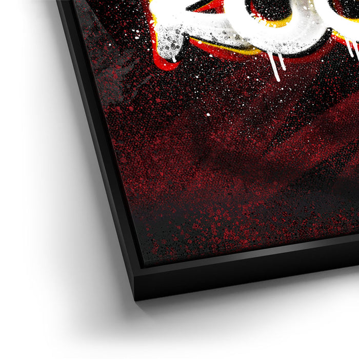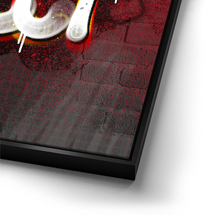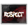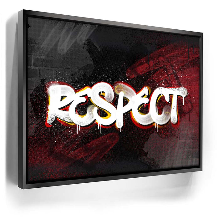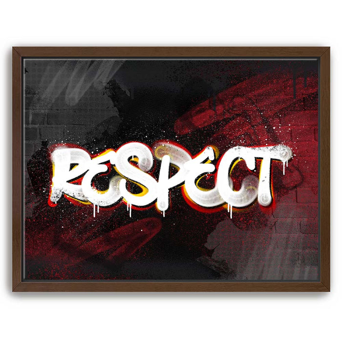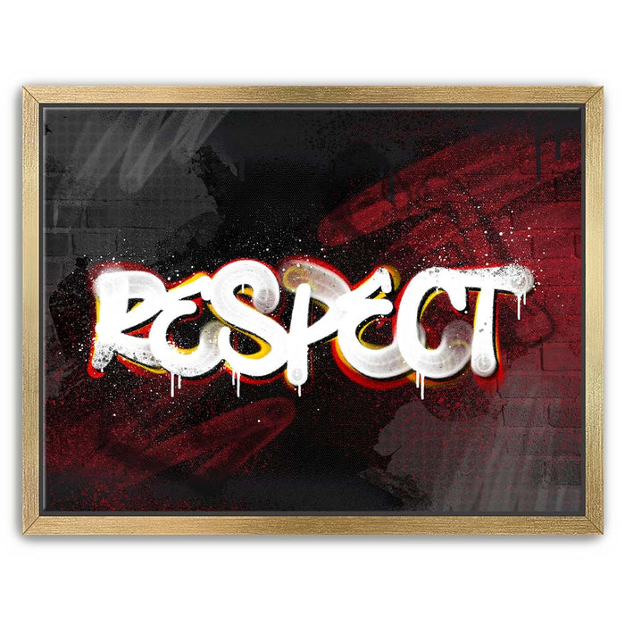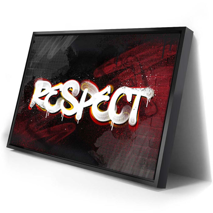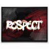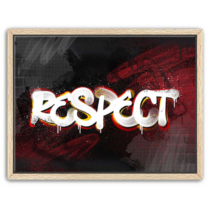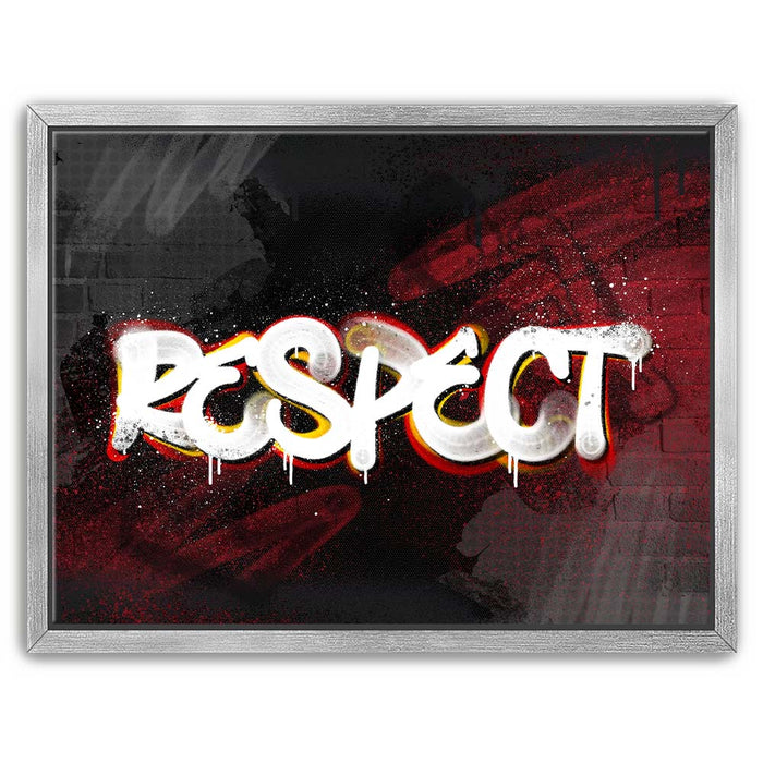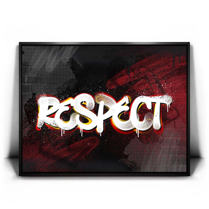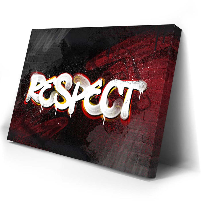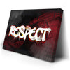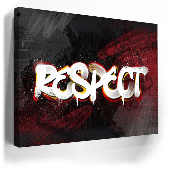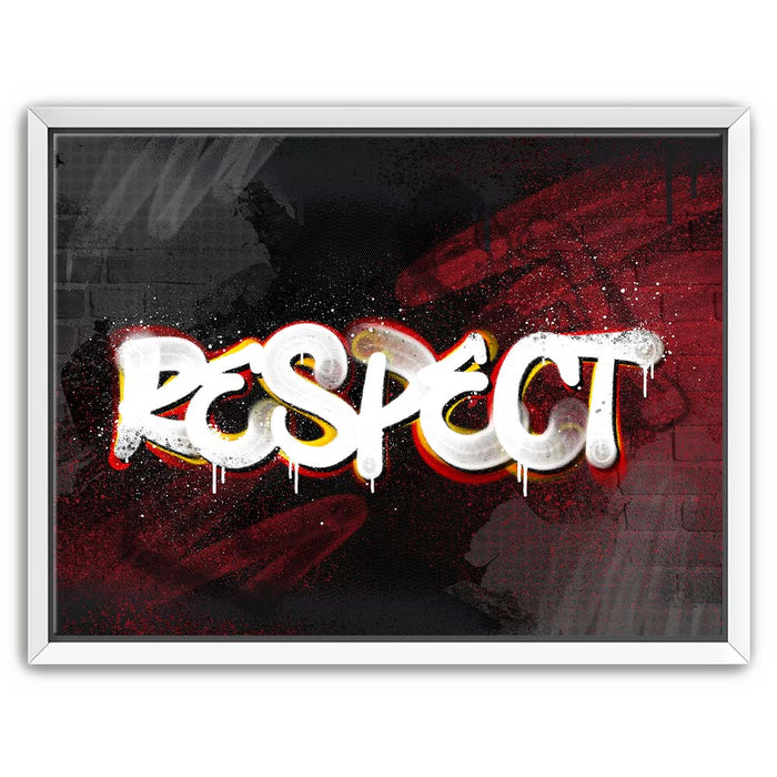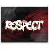 The artwork "Respect - Graffiti" is a bold and dynamic piece inspired by urban street art. The word "RESPECT" is prominently displayed in striking graffiti style, with bright white lettering accented by red and yellow shadows that give it a vibrant, three-dimensional effect.