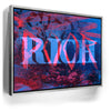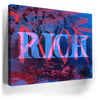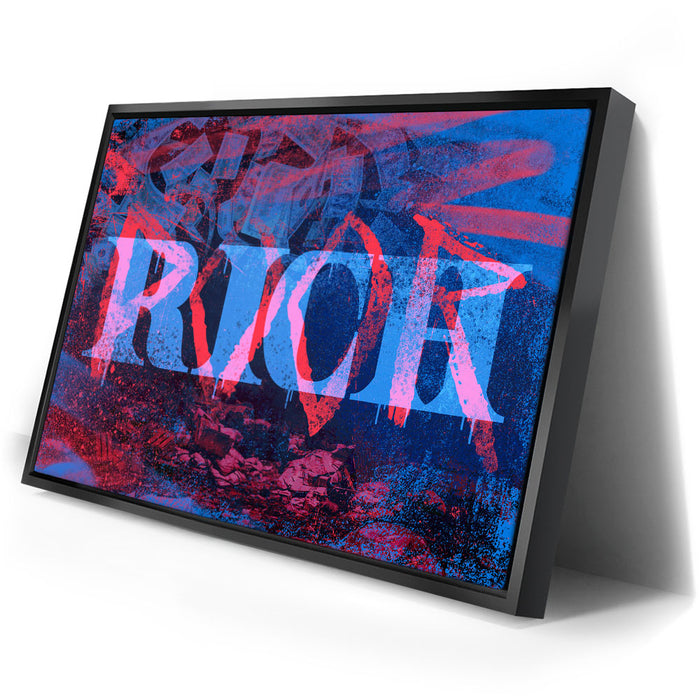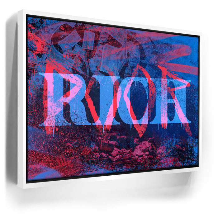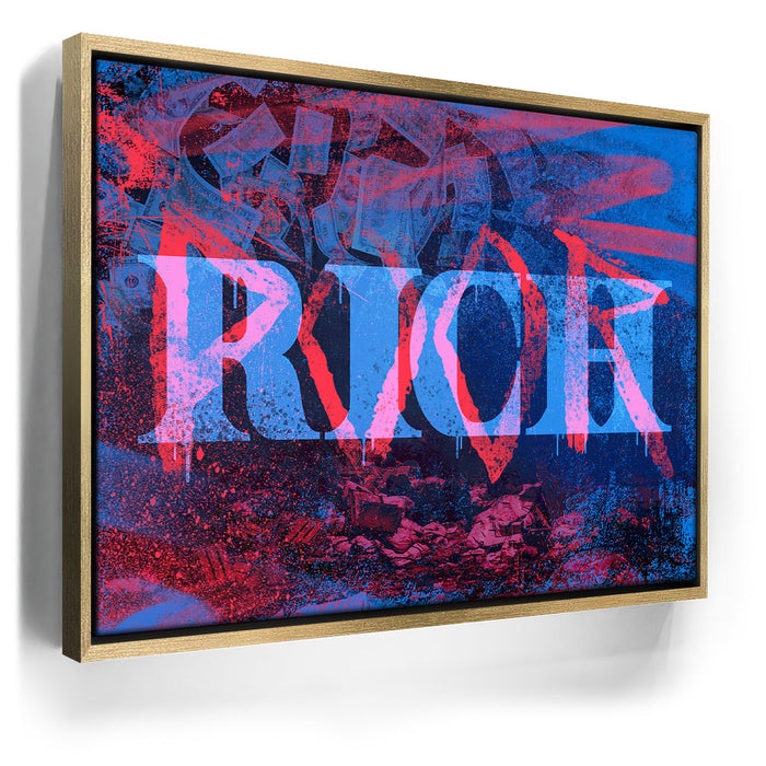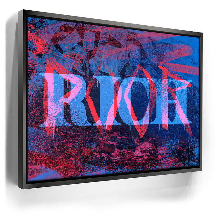 “Rich & Poor - Anaglyphic” is a provocative fusion of color and commentary—blending glitch-style red and blue overlays with imagery of chaos, cash, and collapse. The bold word “RIOT” slices through the center, forcing the viewer to confront inequality, unrest, and societal tension in one jarring visual hit.