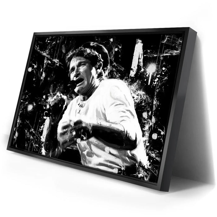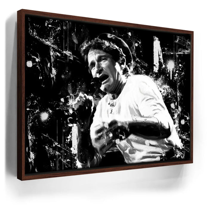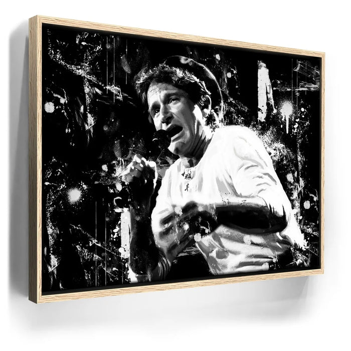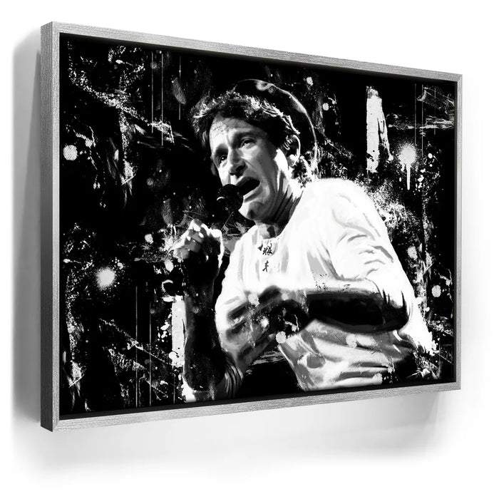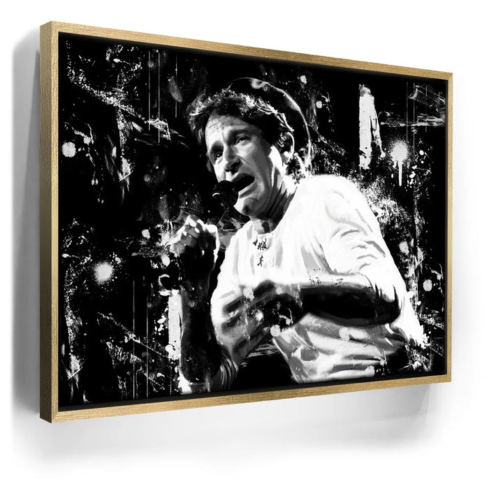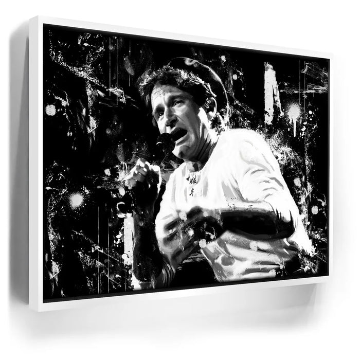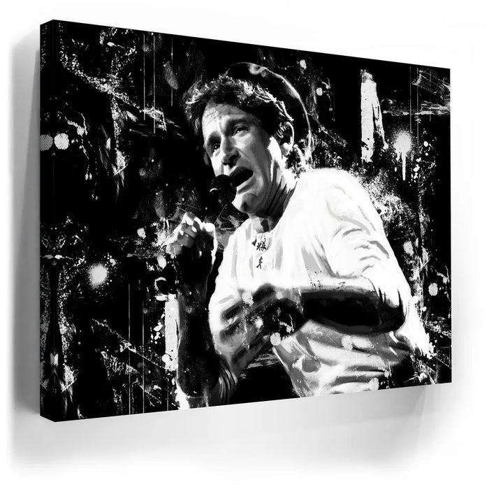Celebrate the brilliance and energy of one of the world’s most beloved comedians with Robin Williams – Standup Wall Art. This striking black-and-white piece captures Robin in his element — full of emotion, wit, and humanity — during one of his unforgettable live performances. The raw, expressive brushwork and splattered textures echo his explosive comedic style, while the monochrome palette highlights his intensity and depth as both a performer and a person.