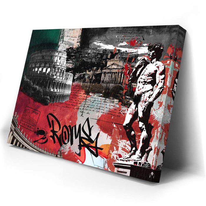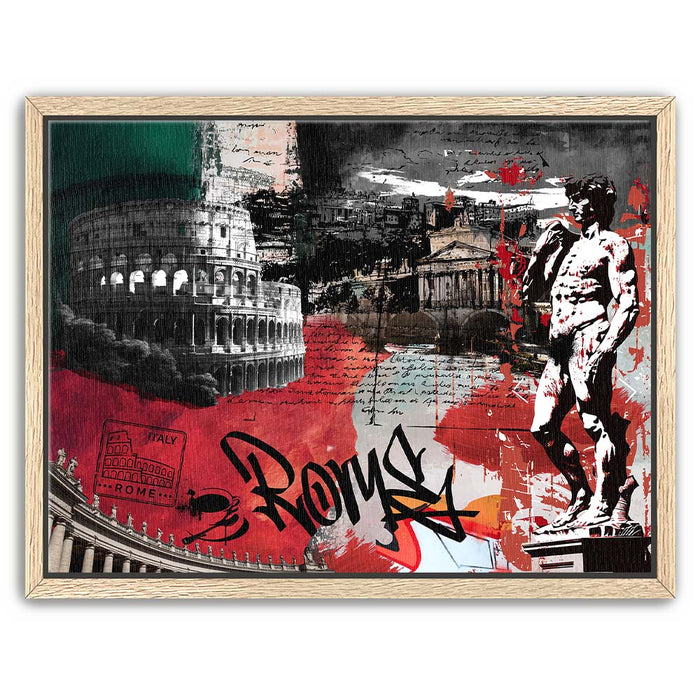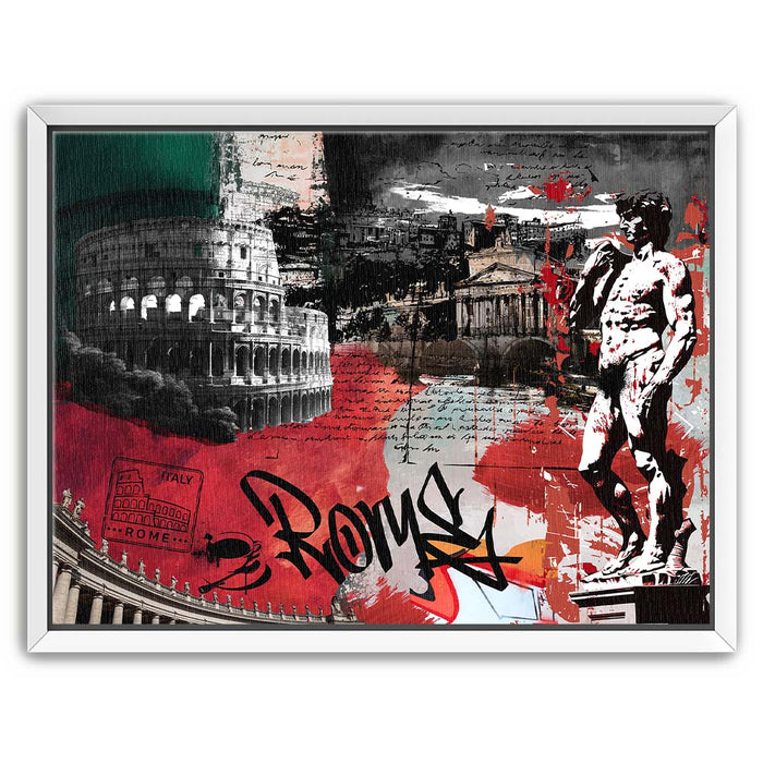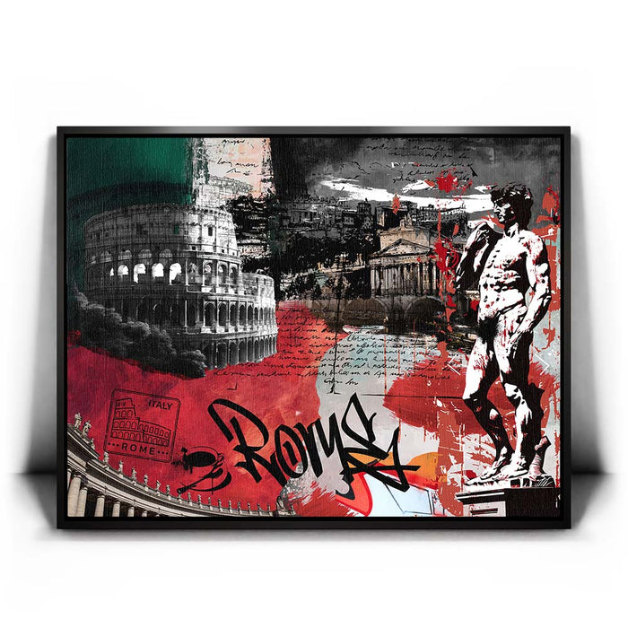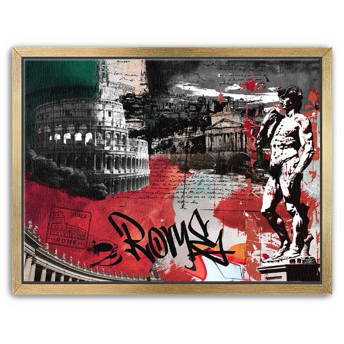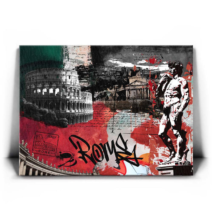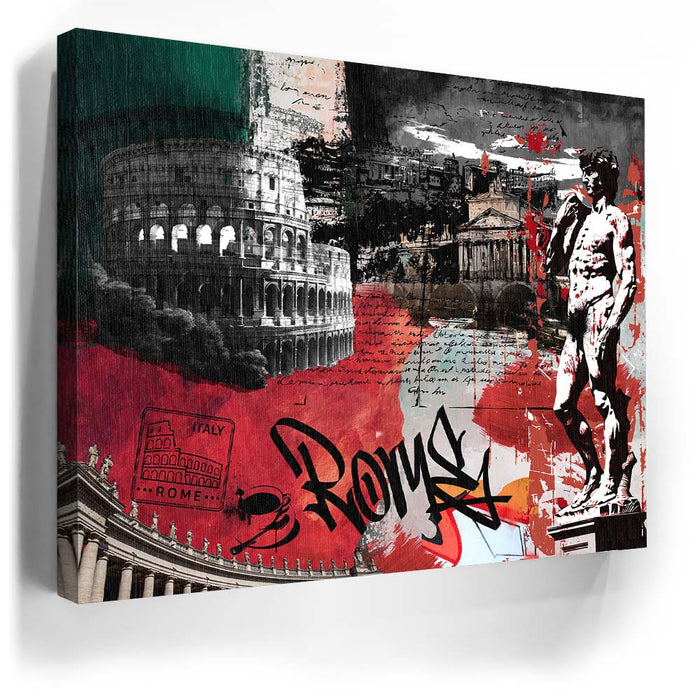 The piece "Rome Collage - Calligraphy" is a vibrant and layered celebration of Roman culture and history. It features iconic landmarks such as the Colosseum, the Pantheon, and Michelangelo's David, integrated with dynamic elements like bold calligraphy spelling "Rome."