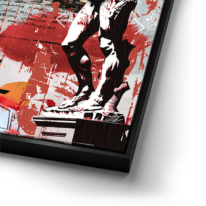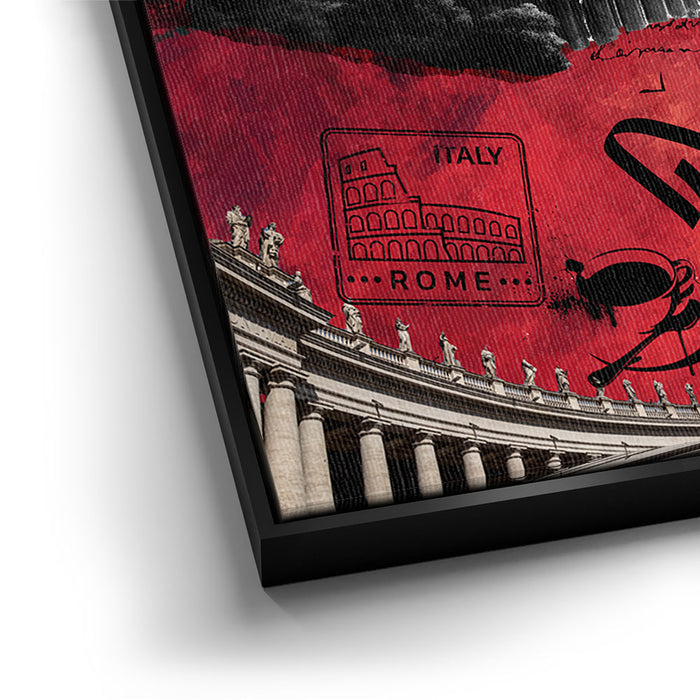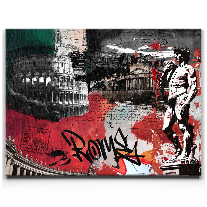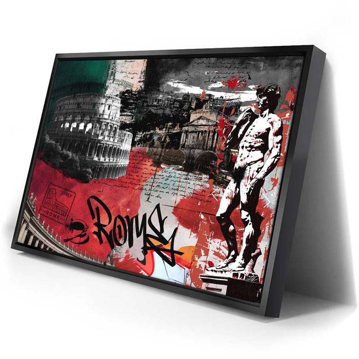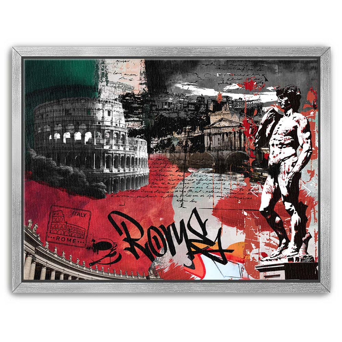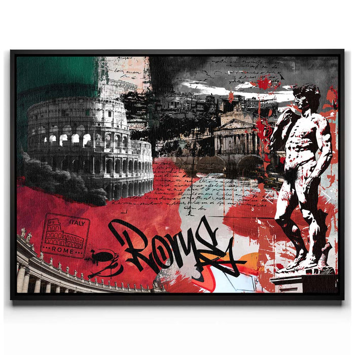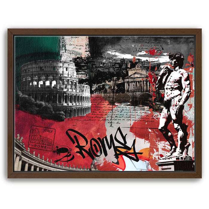The piece "Rome Collage - Calligraphy" is a vibrant and layered celebration of Roman culture and history. It features iconic landmarks such as the Colosseum, the Pantheon, and Michelangelo's David, integrated with dynamic elements like bold calligraphy spelling "Rome."
