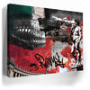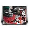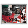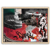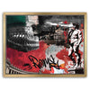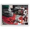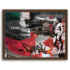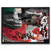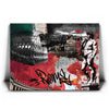 The background combines textured handwritten script, graffiti-inspired graphics, and an evocative color palette of red, black, green, and white, drawing inspiration from the Italian flag. The added calligraphic touch lends the artwork a modern twist, creating a fusion of classical artistry and contemporary urban expression. This piece captures the timeless and evolving spirit of Rome in a compelling and artistic way.