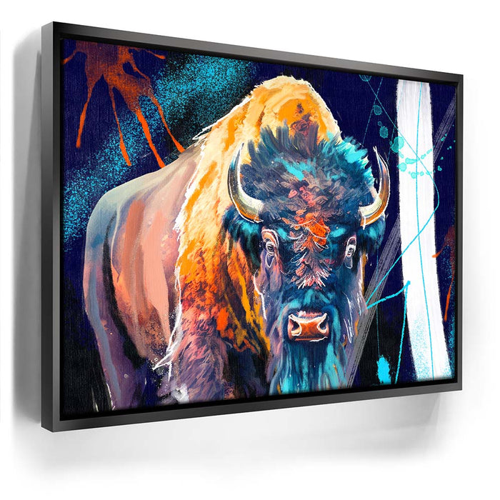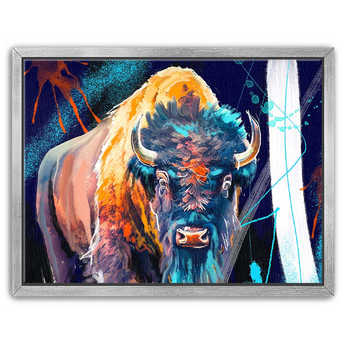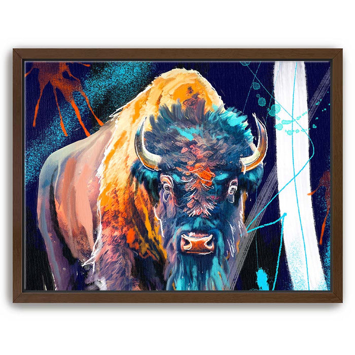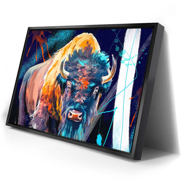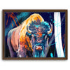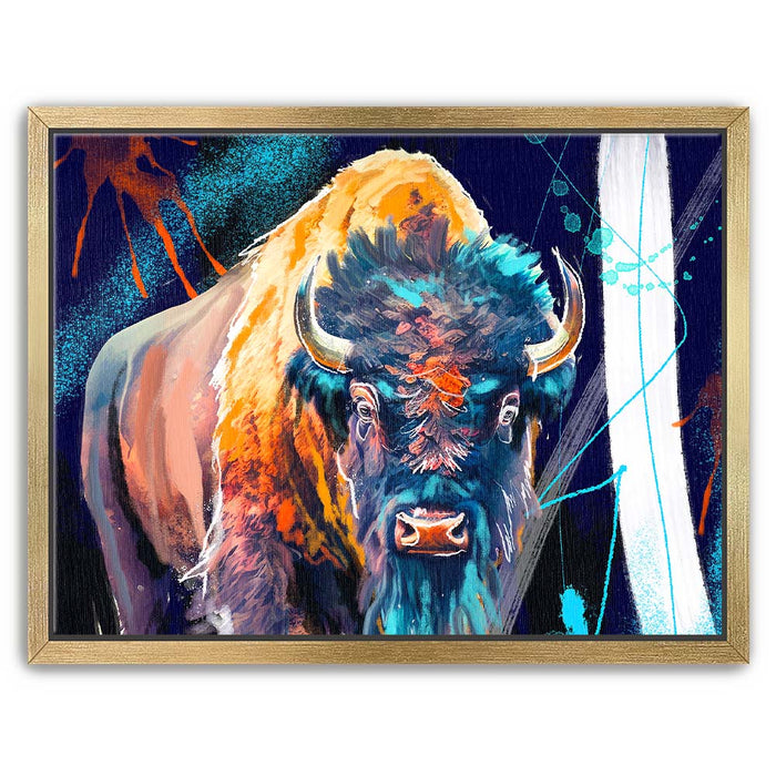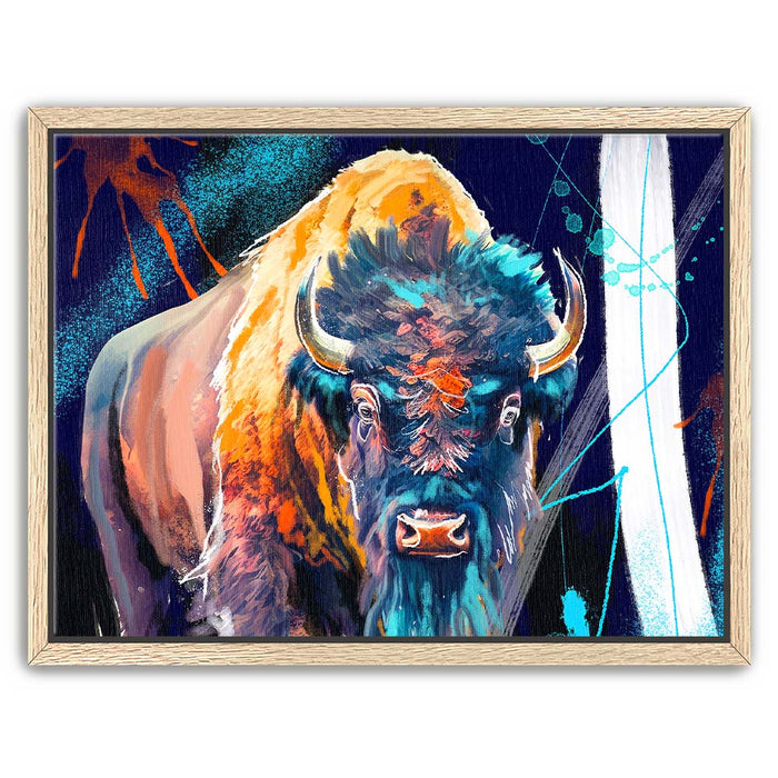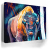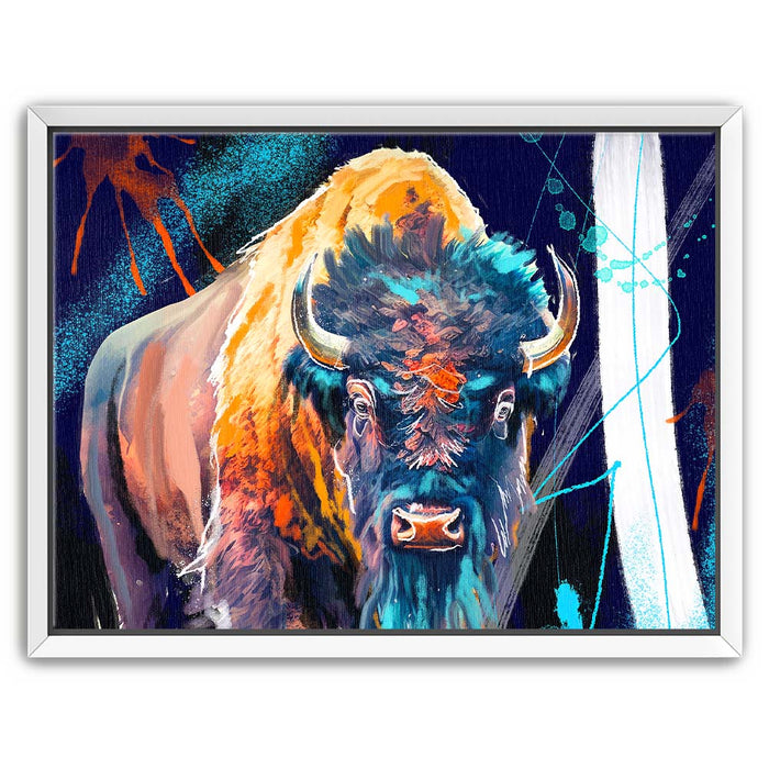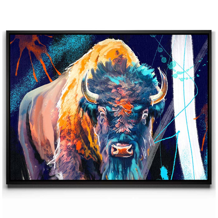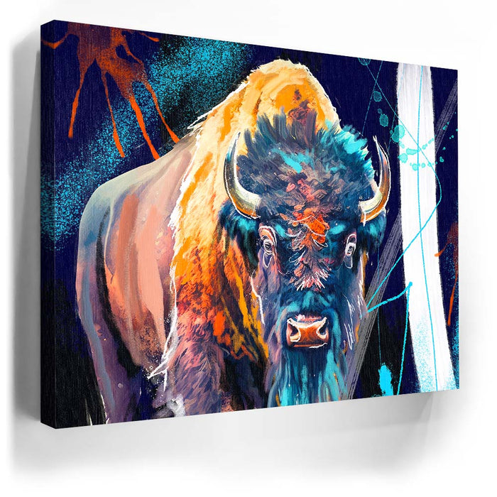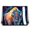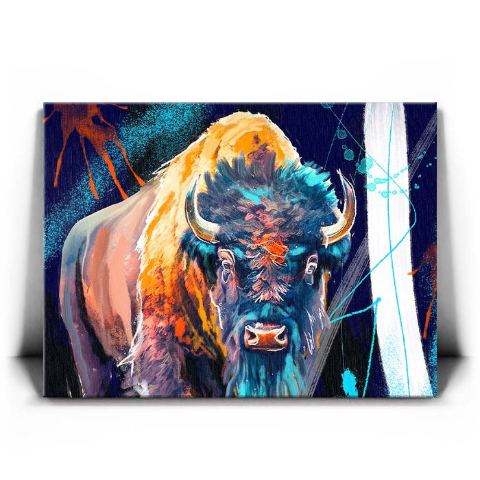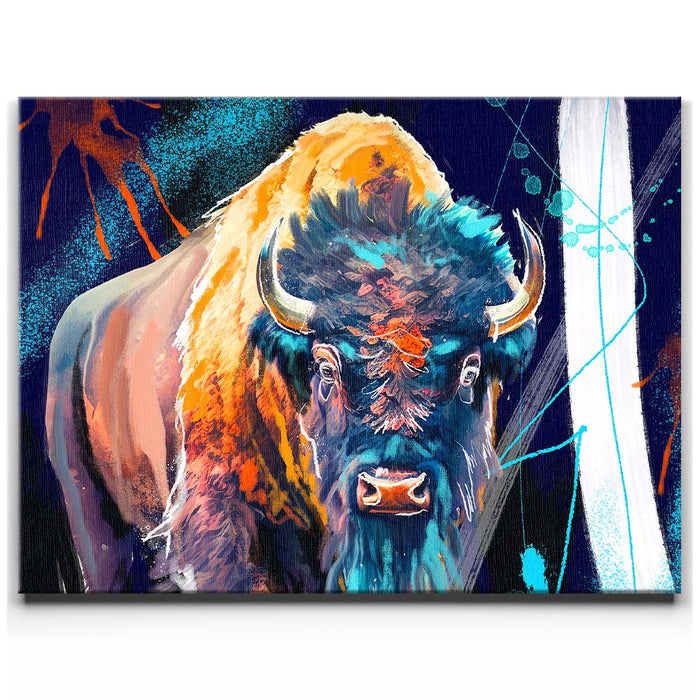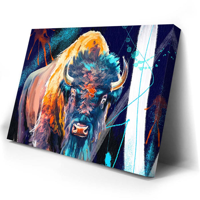 This captivating artwork, titled "Sacred Buffalo," portrays the majestic presence of a buffalo through a vibrant and colorful abstract style. The wild animal is brought to life with bold strokes and a rich palette, blending various colors to emphasize the buffalo's strength and spiritual significance.