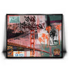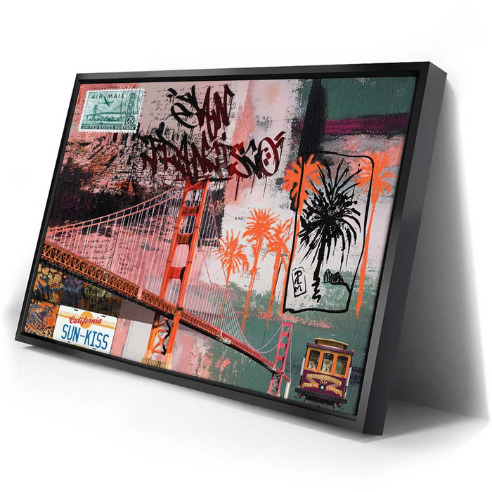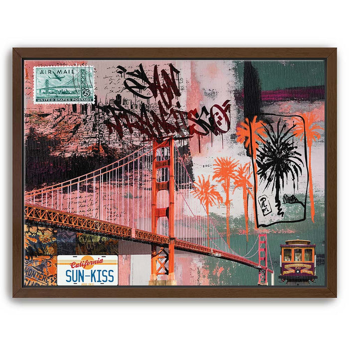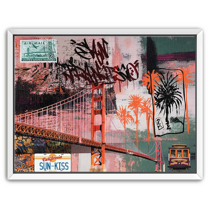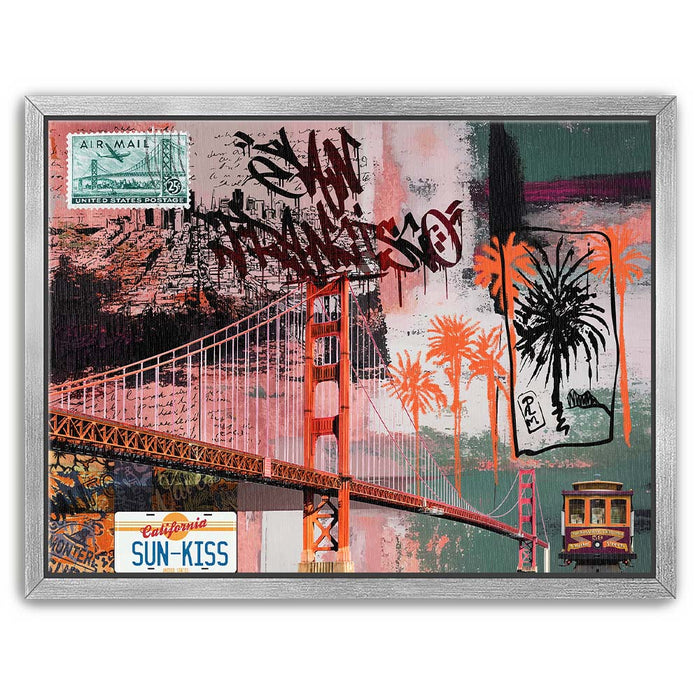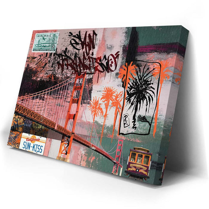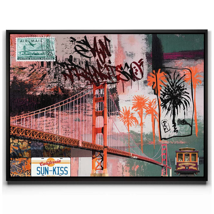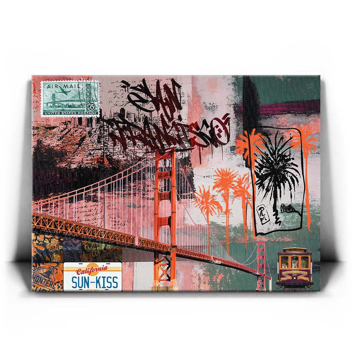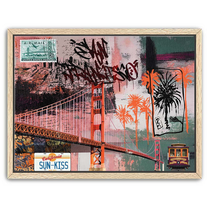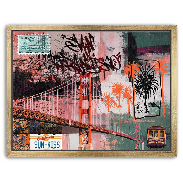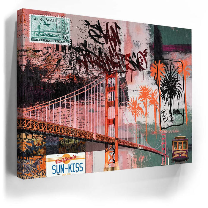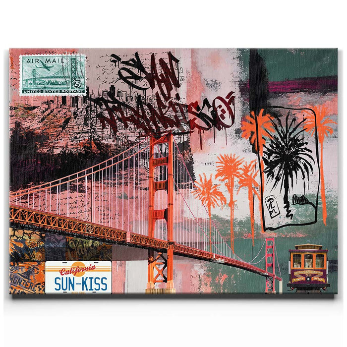 "San Francisco Collage - Calligraphy" is a dynamic and artistic homage to the city’s rich culture and iconic landmarks. This mixed-media piece combines the Golden Gate Bridge, cable cars, and palm trees with bold calligraphy and graffiti-inspired elements. Its layered textures and urban street art vibe perfectly capture the unique essence of San Francisco.