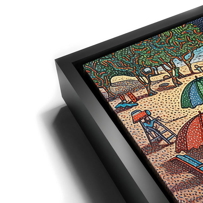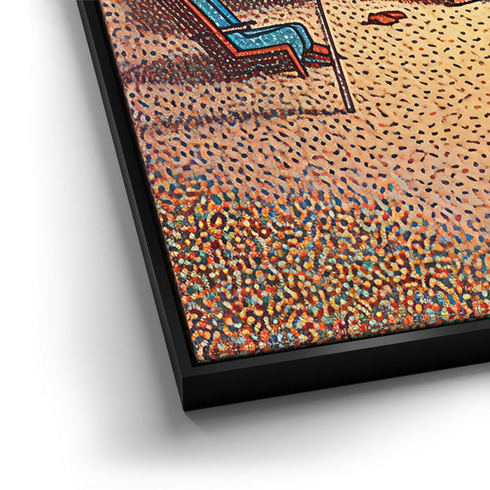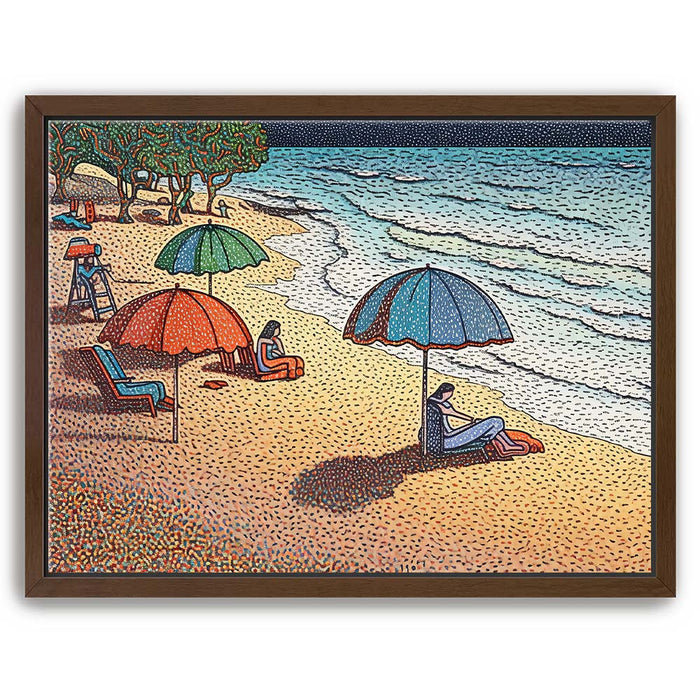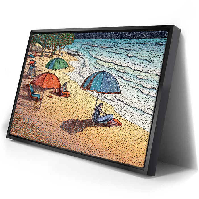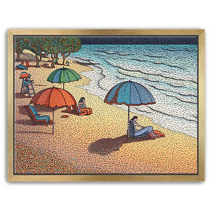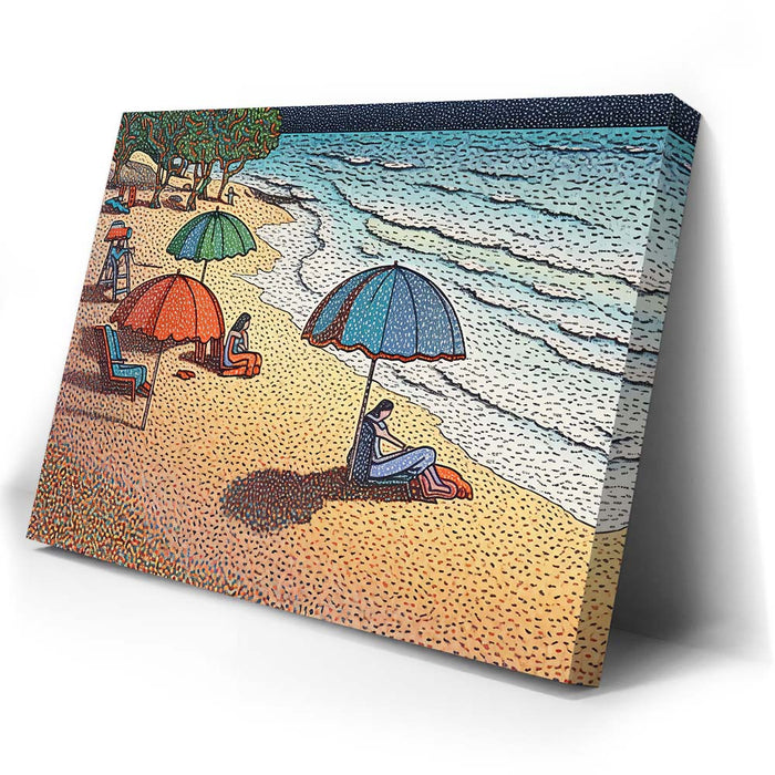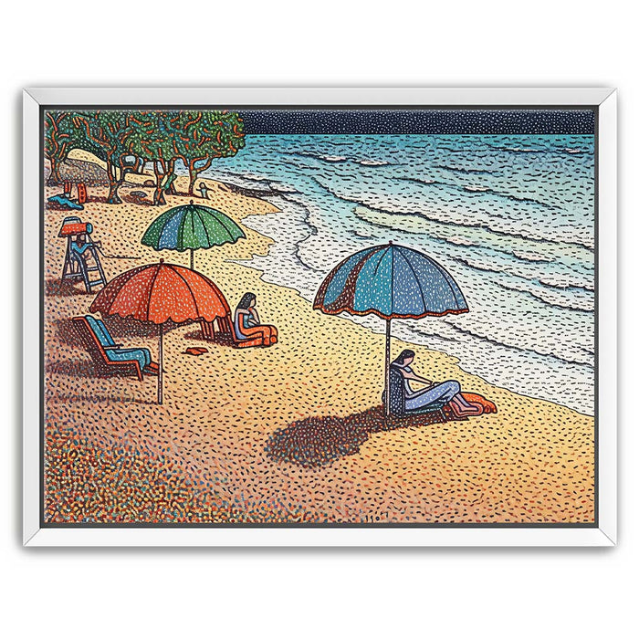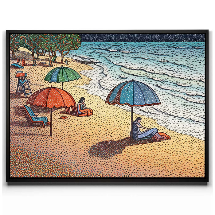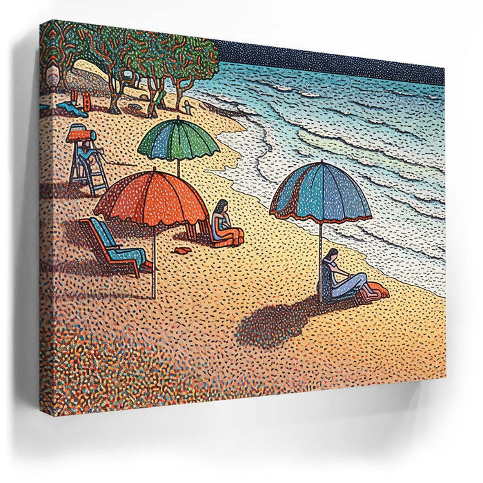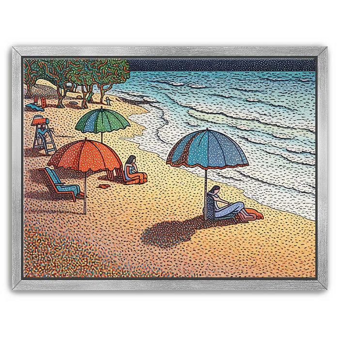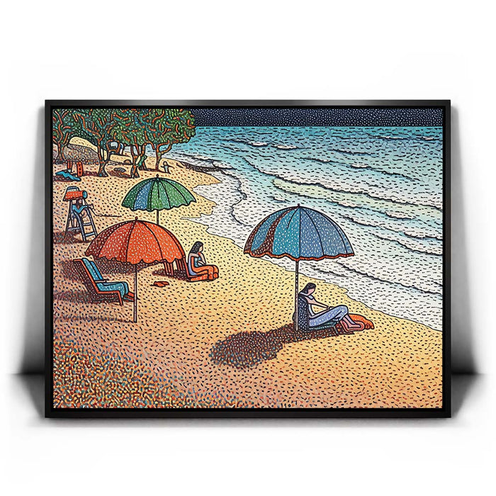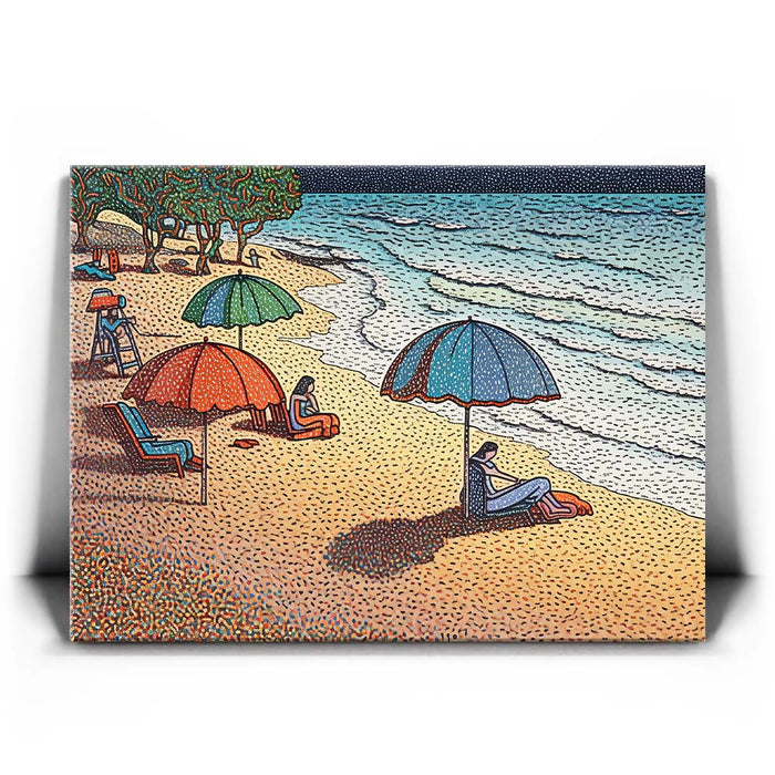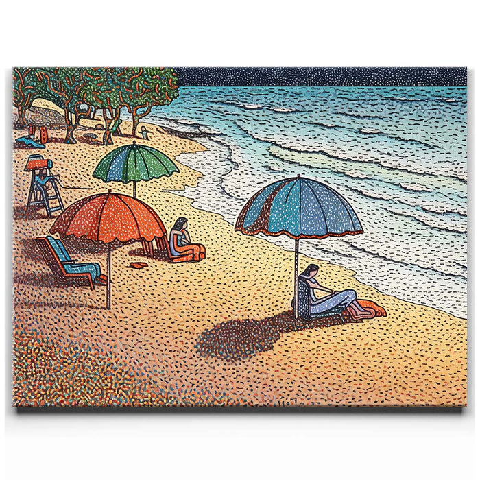 "Sandy Fantasies" by Sean Pearce is a vibrant abstract seascape that captures the beauty of a perfect beach day through the lens of Pointillism. Using colorful dots and rich textures, this oceanscape features a sandy beach, ocean waves, and the dreamy hues of a beach sunset, evoking the peaceful charm of a seaside escape.