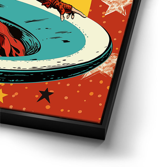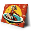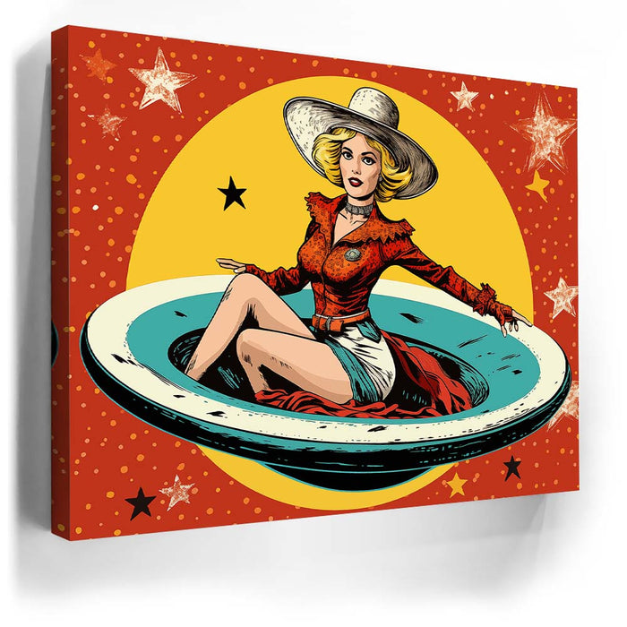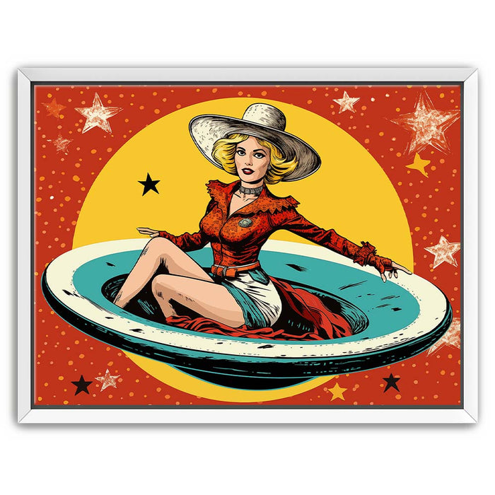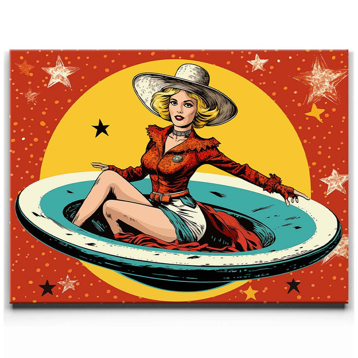 "Sauce Boss" by Sean Pearce is a bold and colorful abstract wall art piece featuring a confident, stylish woman set against a vibrant backdrop of stars. This eye-catching artwork blends elements of country charm with a modern twist, showcasing a beautiful woman in a hat—part cowgirl, part cool icon—holding a bowl of sauce with attitude and flair.