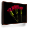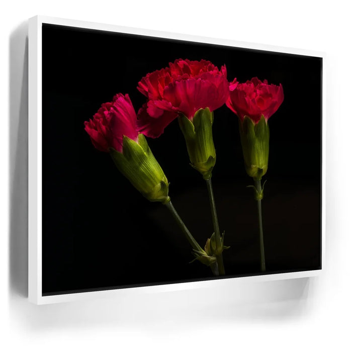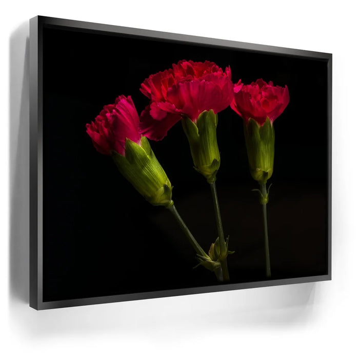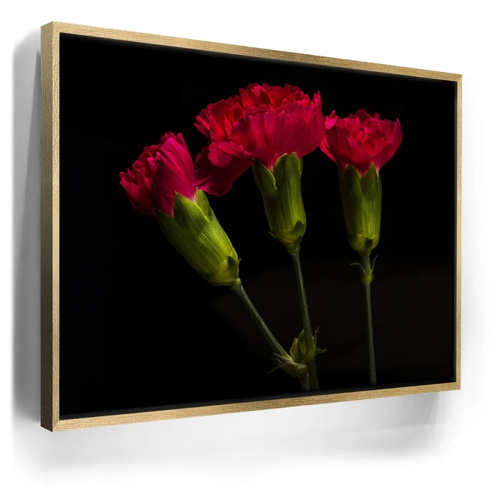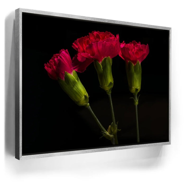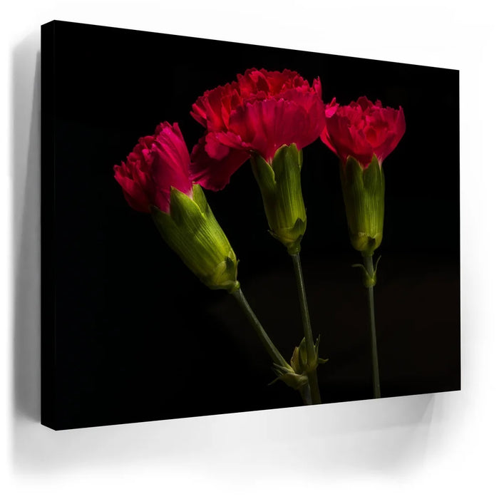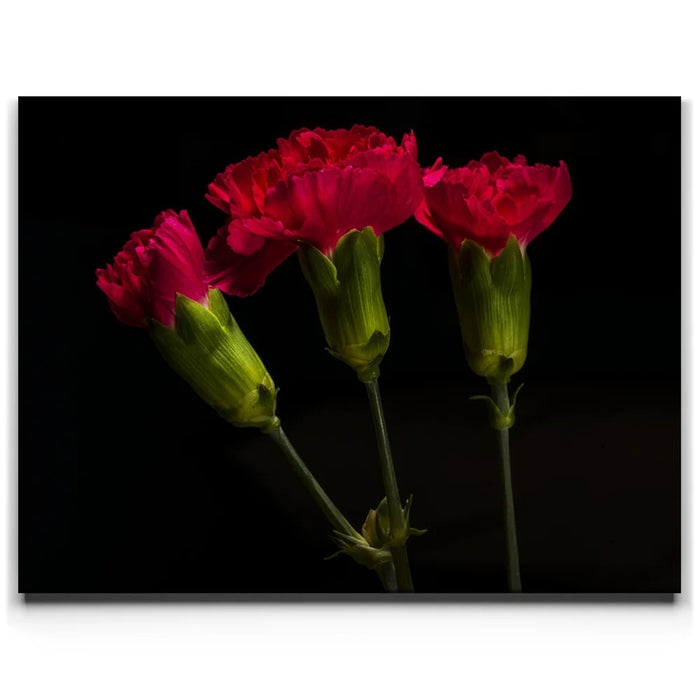"Scarlet Blooms" by Barbarossa captures the elegance and intensity of red carnations illuminated against a deep black background. Each petal glows with quiet strength, revealing the subtle textures and gradients that make the flowers appear almost alive.