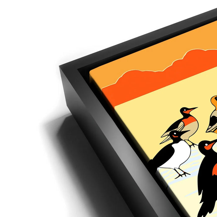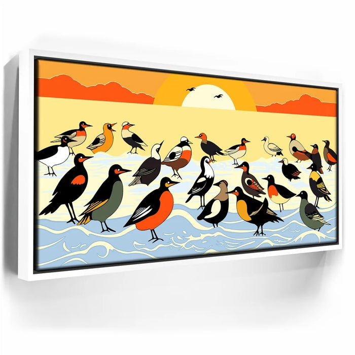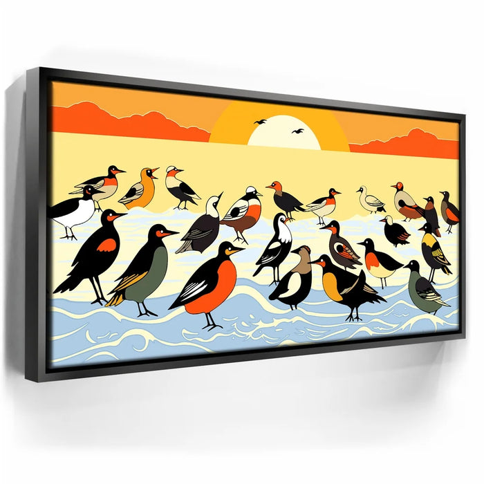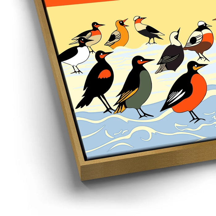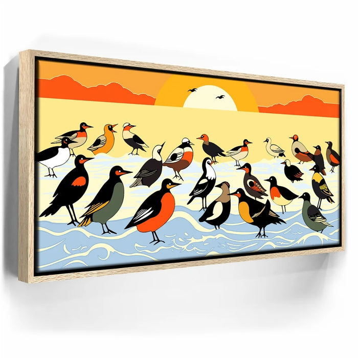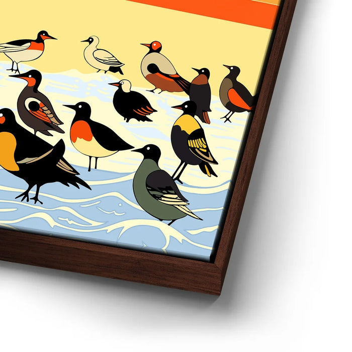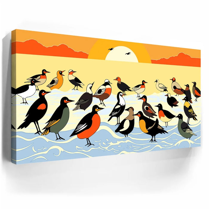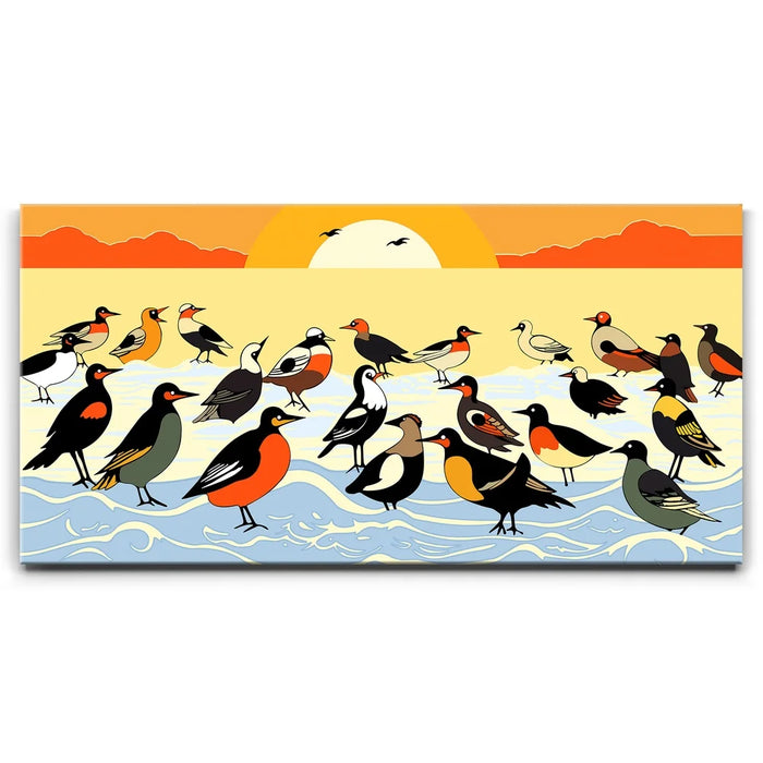 Seaside Birds wall art celebrates the simple beauty of coastal life with a playful, modern illustration of colorful birds gathered by the ocean. Featuring bold shapes, clean lines, and a warm sunrise palette, this piece radiates a sense of calm, balance, and joy. Its vibrant yet minimalist design brings a touch of seaside charm to any home or office.