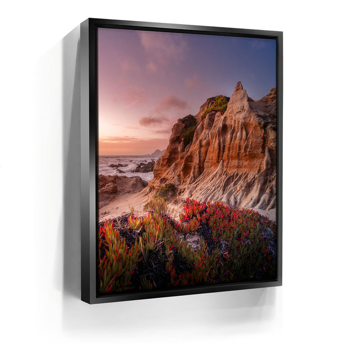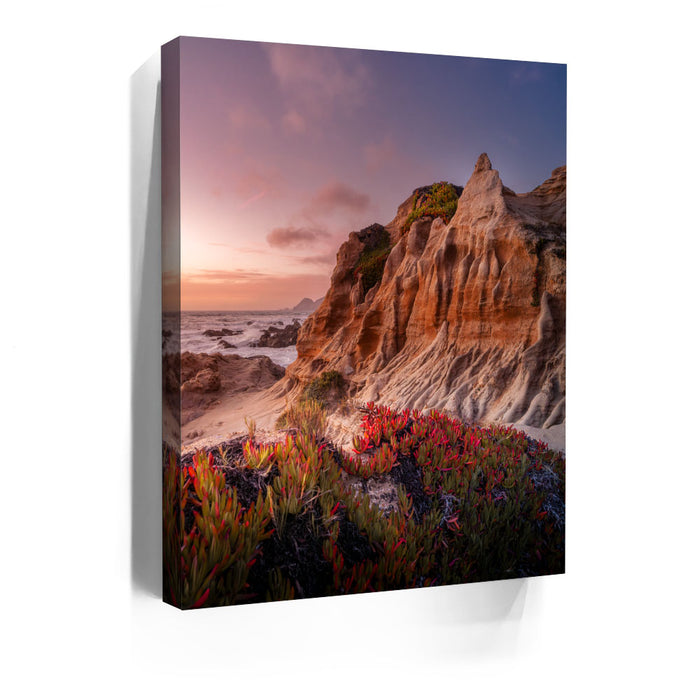“Seaside Escape Portrait” by photographer Daniel Heck captures the breathtaking beauty of a rugged California coastline at golden hour. The sculpted sandstone cliffs, vibrant coastal vegetation, and crashing waves are bathed in soft sunset hues, creating a dramatic and serene natural seascape.
