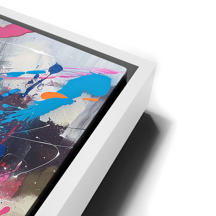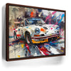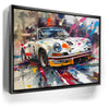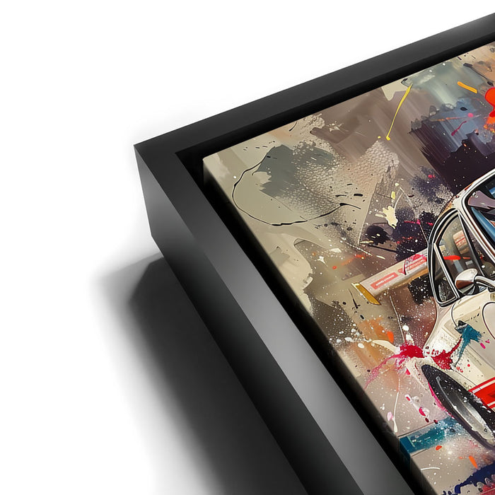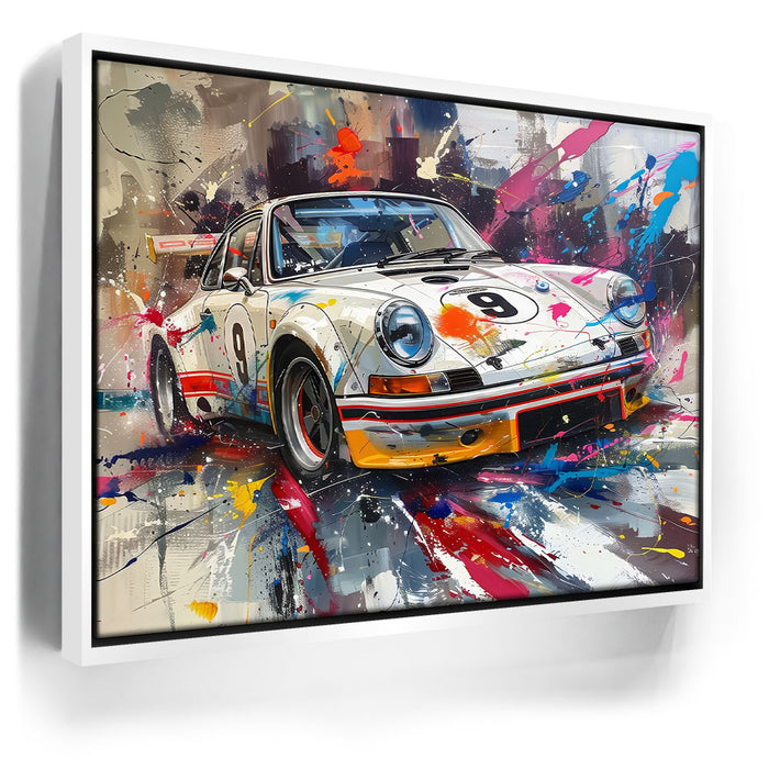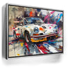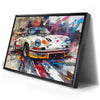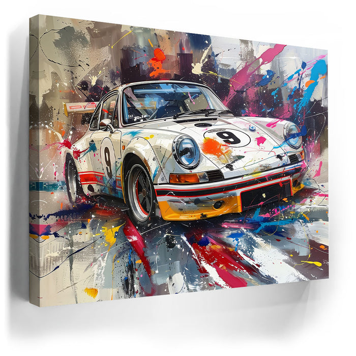 This exhilarating artwork, titled "See You at the Finish," showcases a sleek white race car in full motion, brought to life with vibrant paint splatters and abstract techniques. The dynamic composition captures the essence of speed and power, with the colorful splashes adding a sense of energy and excitement to the scene.