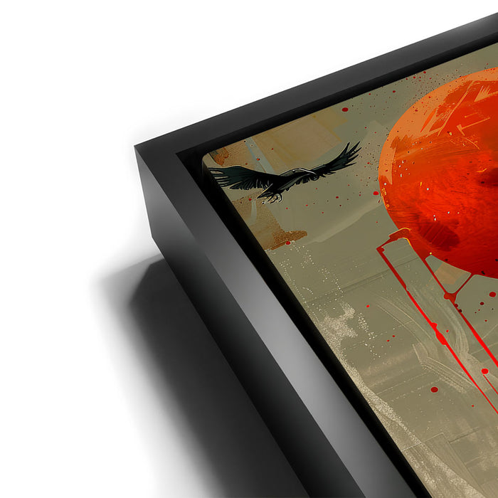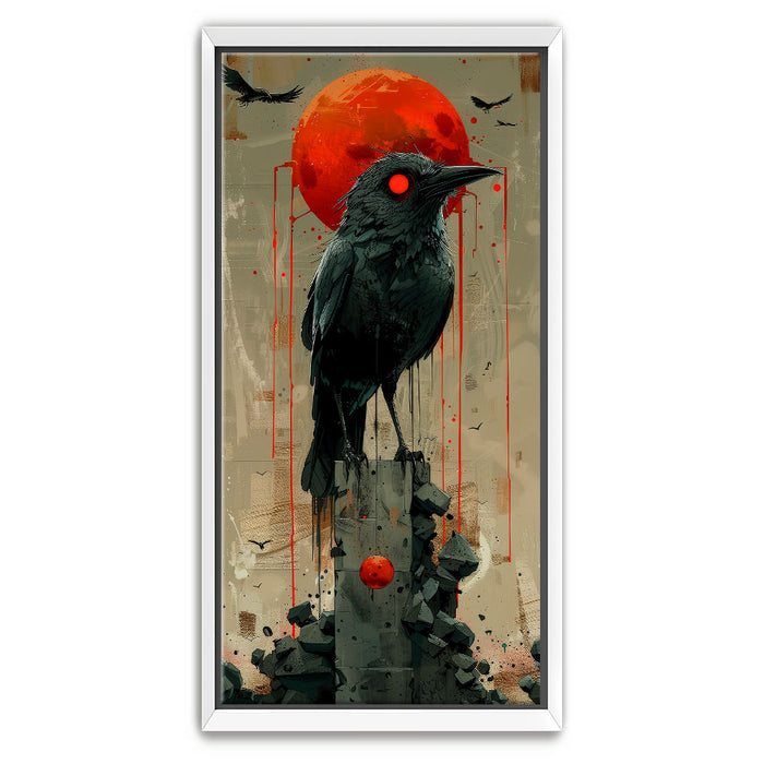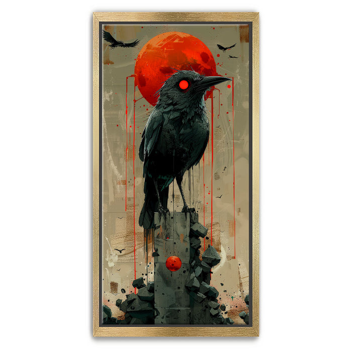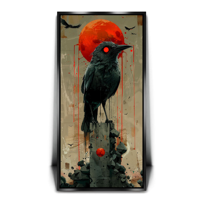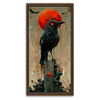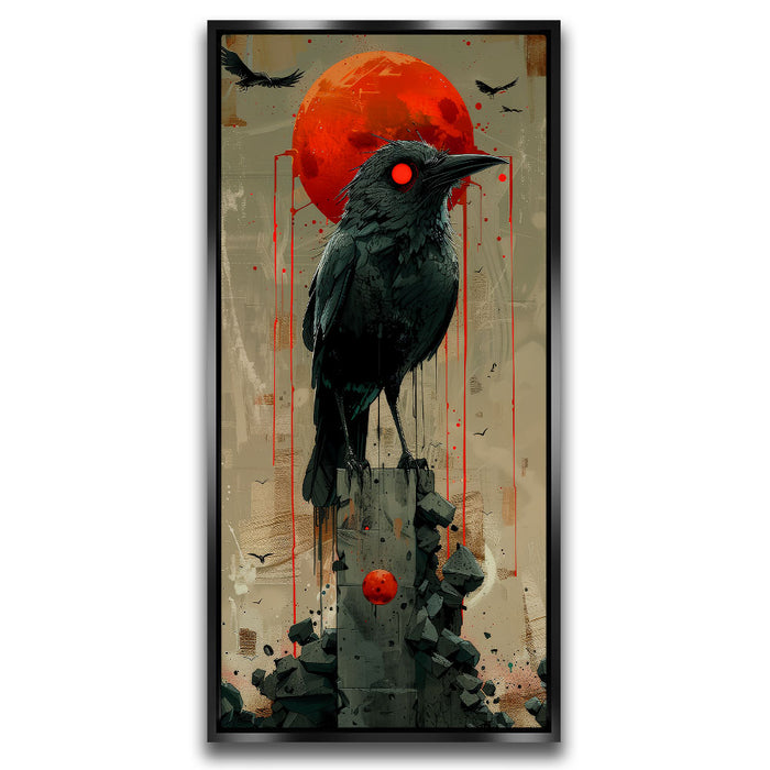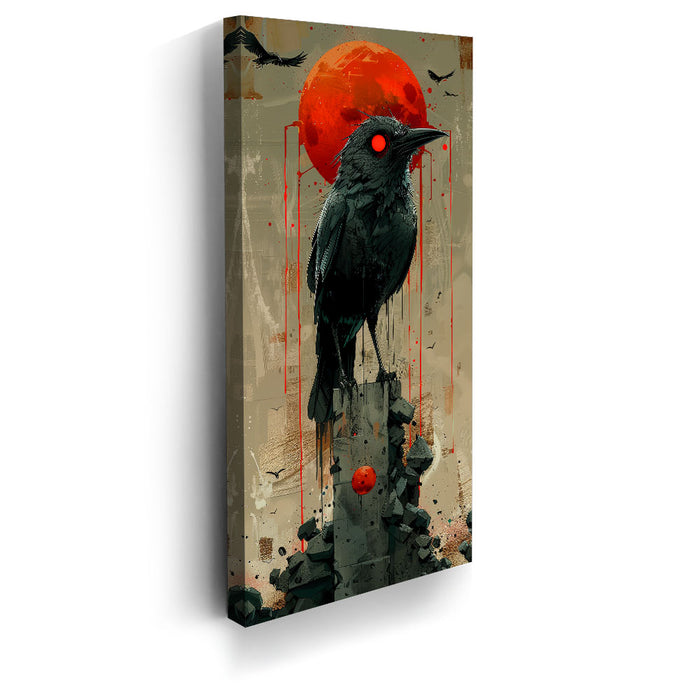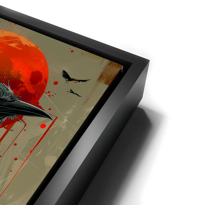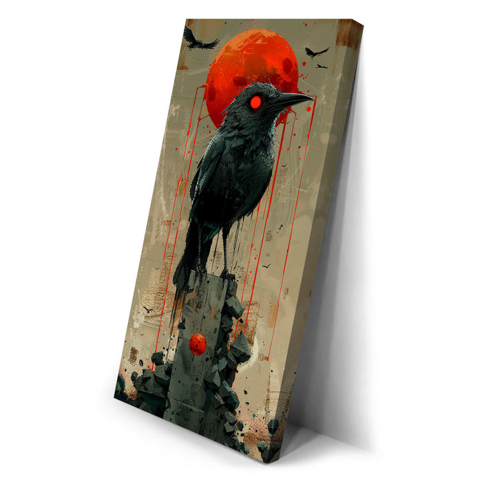 "Sentinel" by Sean Pearce is a striking piece of abstract wall art that merges the mystique of wild animals with the haunting beauty of celestial elements. Featuring a powerful black bird—possibly a crow or raven—under a vivid red sun or blood moon, this artwork evokes themes of watchfulness, nature, and primal instinct.