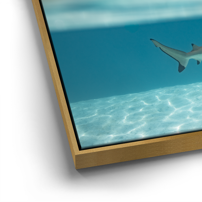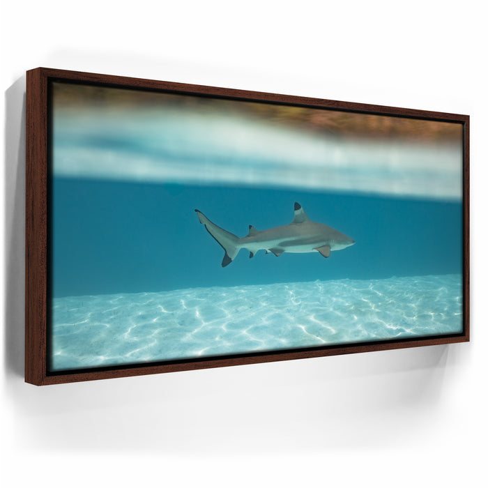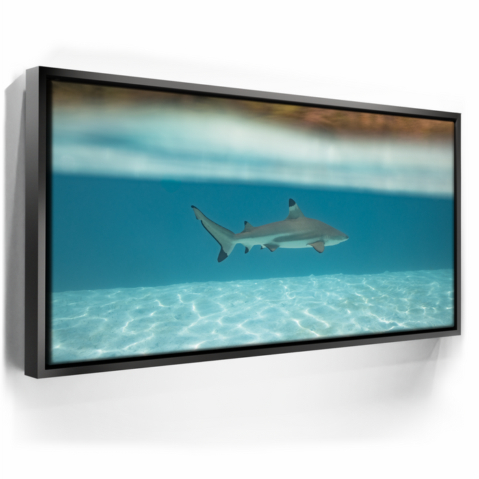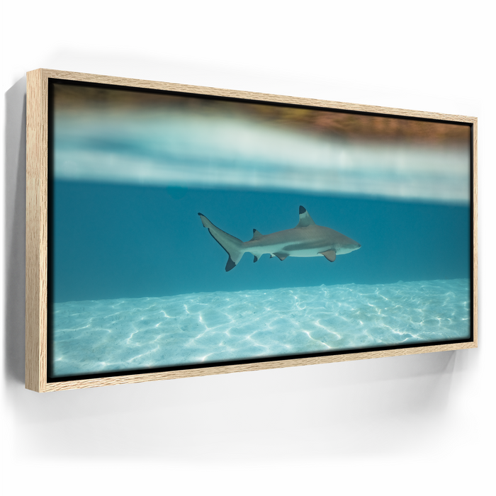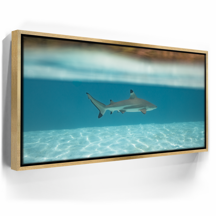 "Shark Cruising - Tahiti" by Thais Mendonca captures a graceful blacktip reef shark swimming through the clear, turquoise waters of French Polynesia. This stunning underwater photograph offers a rare, tranquil perspective of one of the ocean’s most iconic creatures in its natural habitat.