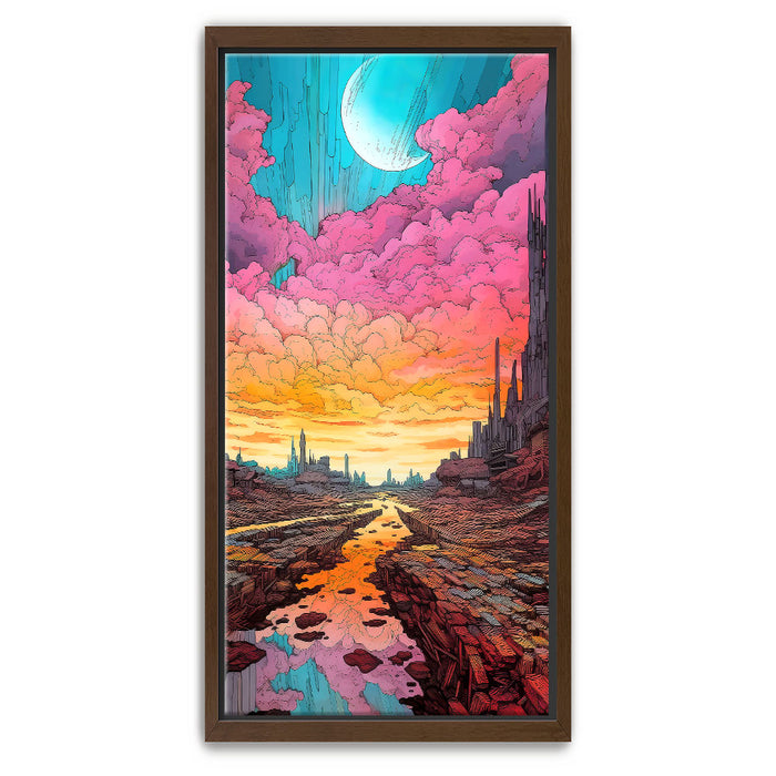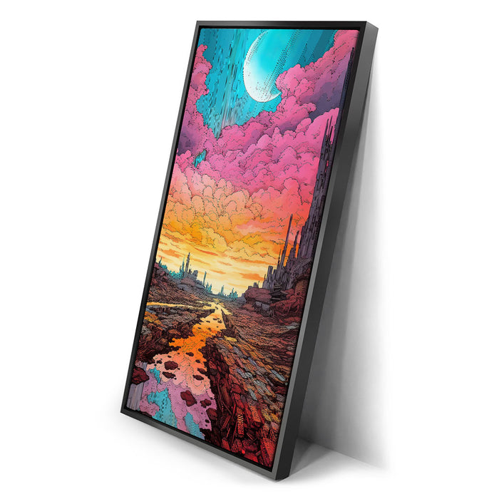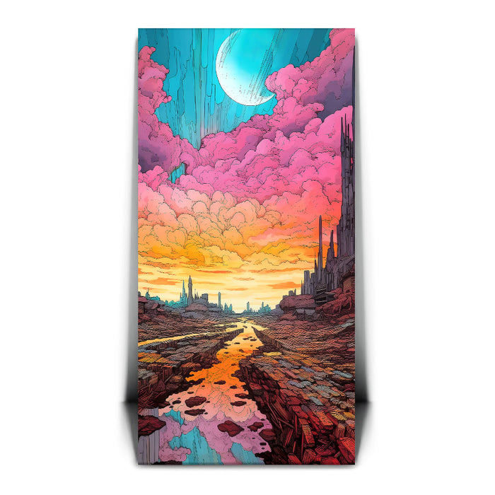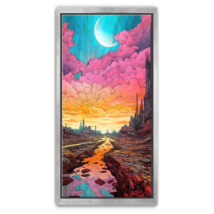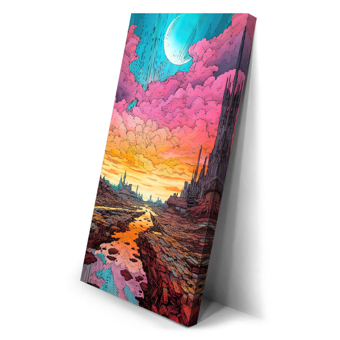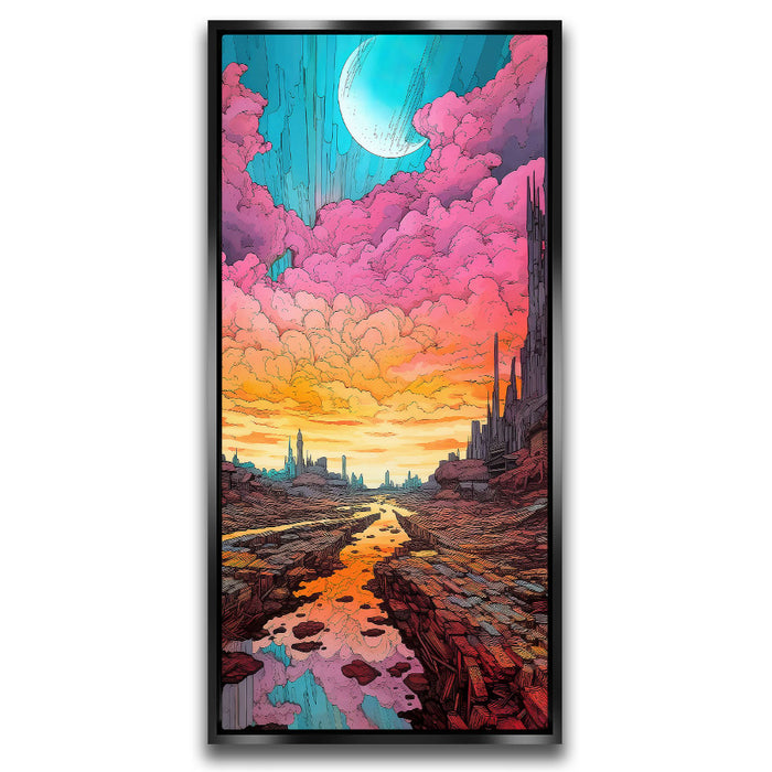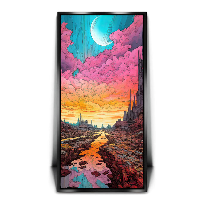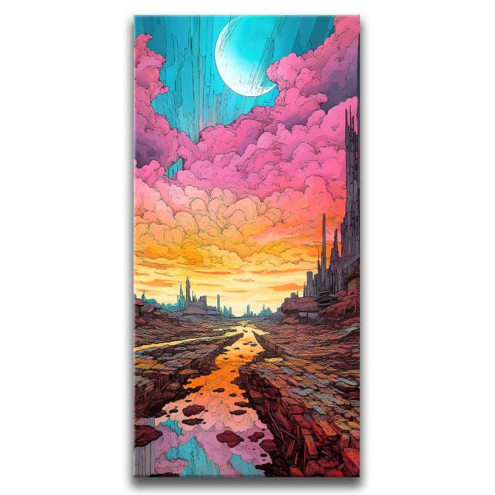 Perfect for fans of science fiction and fantasy landscapes, "Skyfire and Stone" offers a mesmerizing blend of surreal beauty and rugged terrain. This piece captures the imagination, drawing viewers into an epic and vibrant world that feels both distant and awe-inspiring.