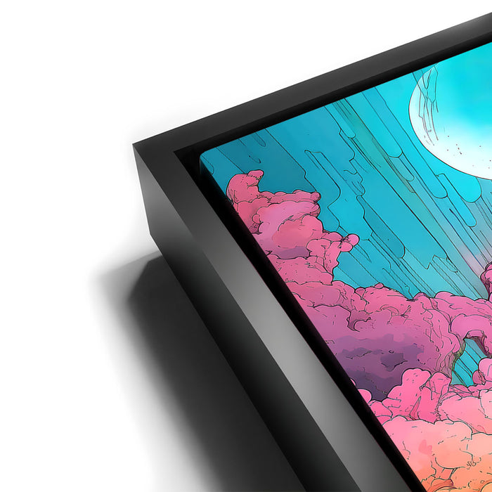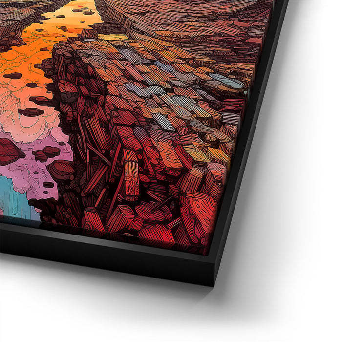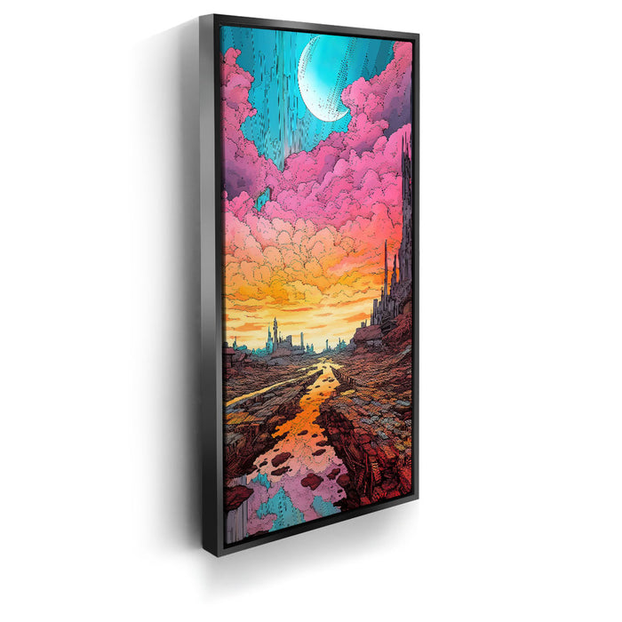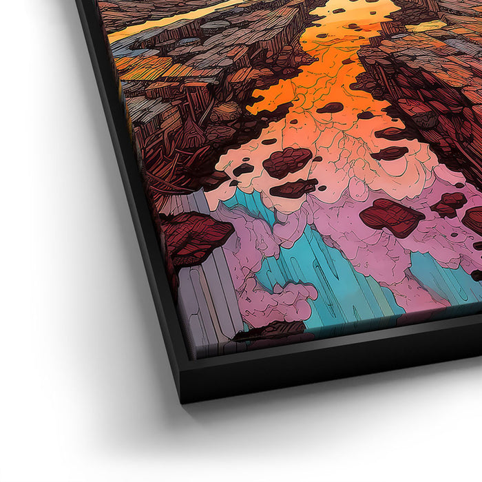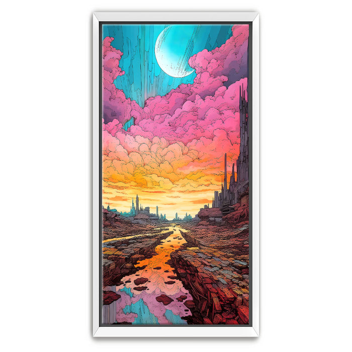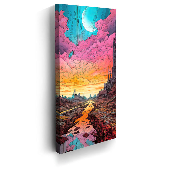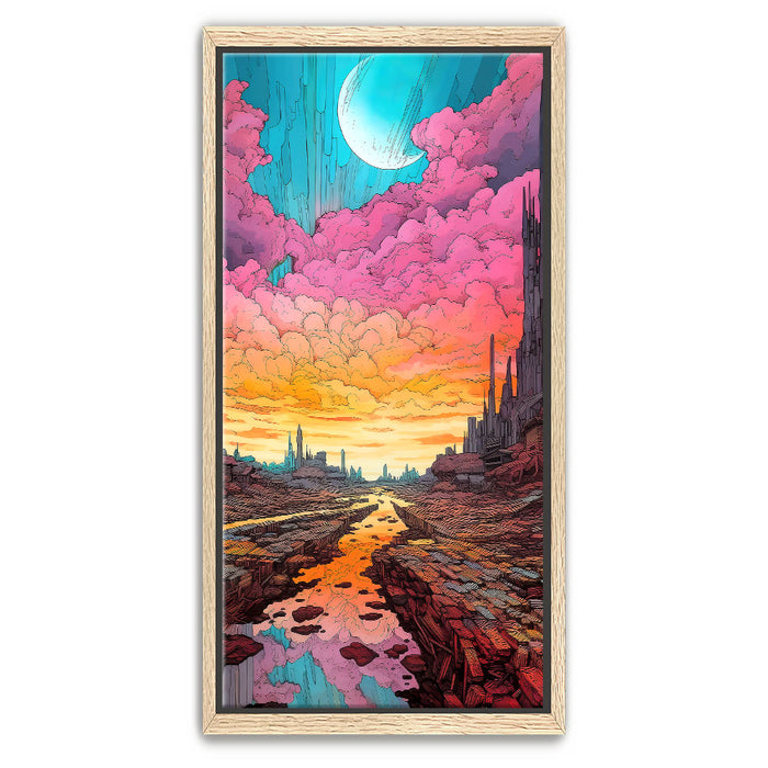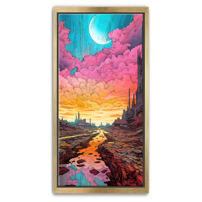 Perfect for fans of science fiction and fantasy landscapes, "Skyfire and Stone" offers a mesmerizing blend of surreal beauty and rugged terrain. This piece captures the imagination, drawing viewers into an epic and vibrant world that feels both distant and awe-inspiring.