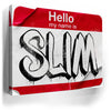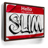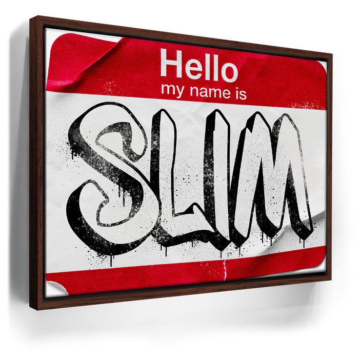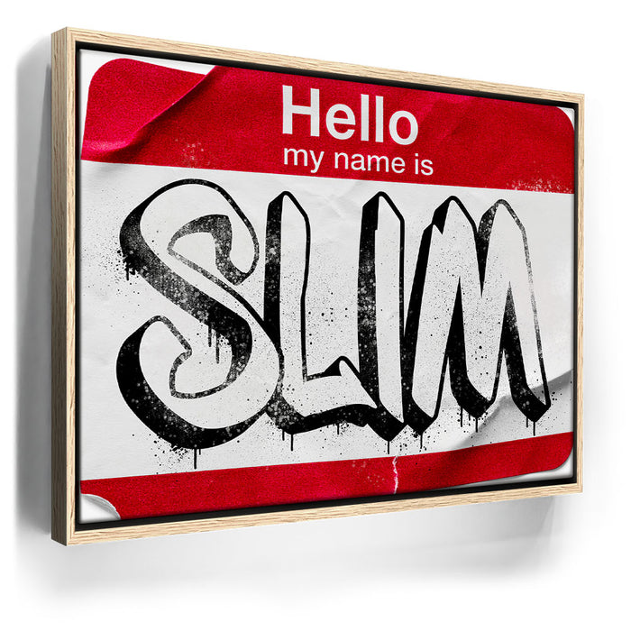 “Slim’s the Name” is a bold graffiti-style artwork inspired by street culture and hip-hop attitude. Designed to mimic a classic “Hello My Name Is” tag, this monochrome piece uses dripping spray textures and thick lettering to create an edgy, high-contrast visual that pops on any wall.