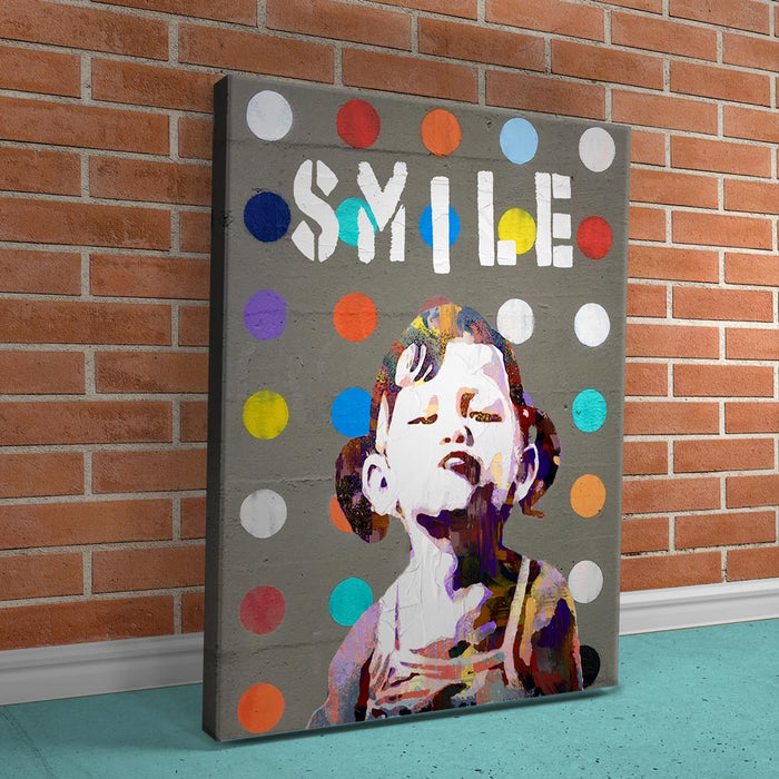 Perfect for fans of contemporary art, graffiti, and pop culture, this piece brings a burst of creativity to any space. Whether for a living room, office, or gallery wall, "Smile Girl - Banksy Warhol Mashup" is an artistic statement that celebrates bold self-expression and the merging of art movements.