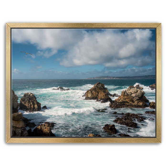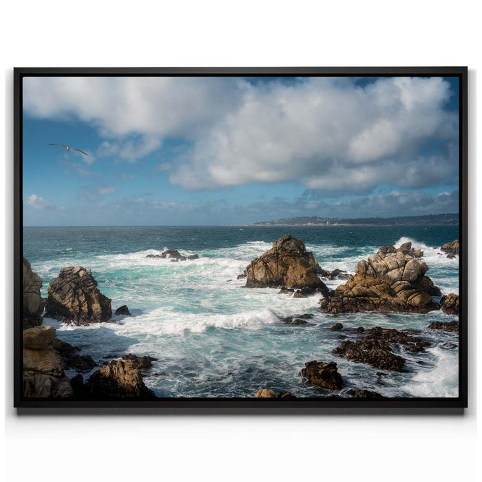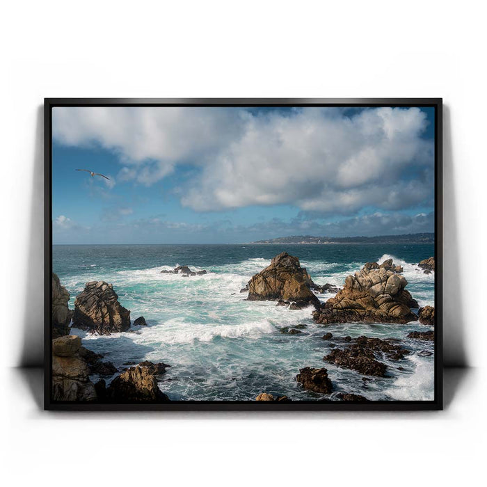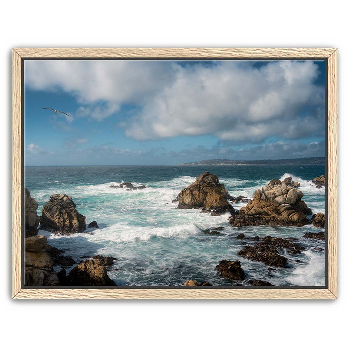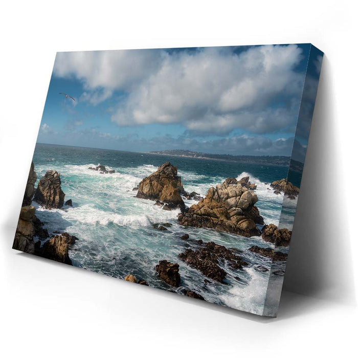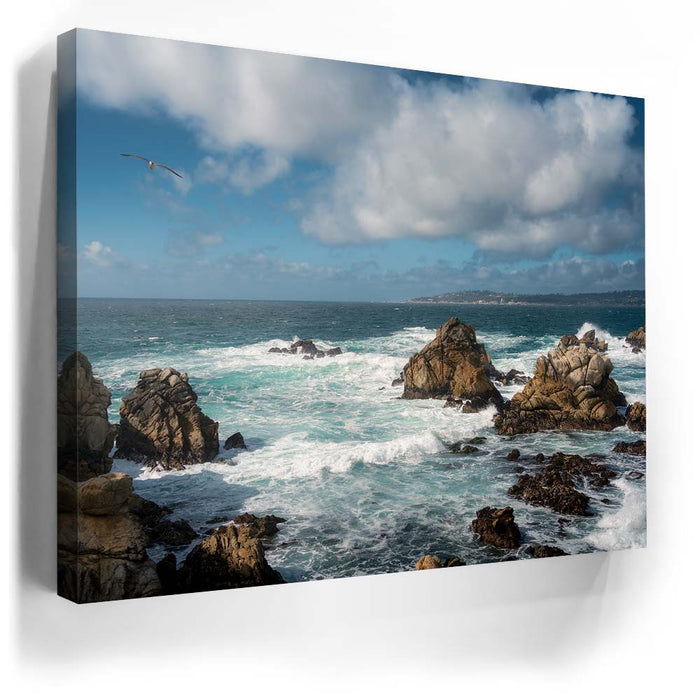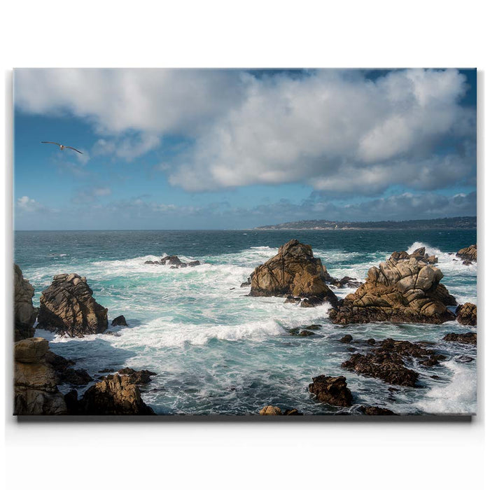The composition is further enhanced by a lone bird soaring over the azure waters, symbolizing freedom and the boundless beauty of nature. This piece perfectly encapsulates the wild elegance of California’s oceanscape, making it an ideal addition to any collection that celebrates natural beauty and coastal charm.