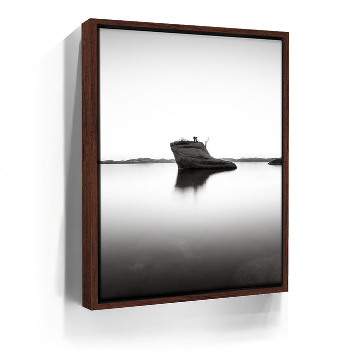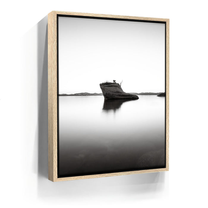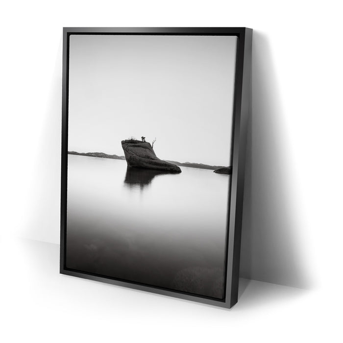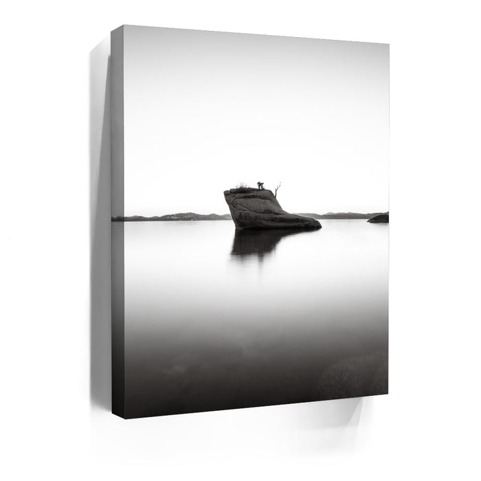“Solitude Point” by Daniel Heck is a striking black and white landscape photograph that captures the quiet stillness of nature. A lone rock formation rises from calm, glasslike waters, its reflection mirrored beneath an endless sky, evoking balance, isolation, and peace.