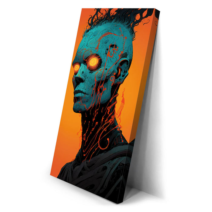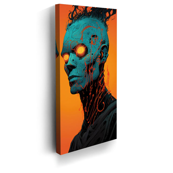 "Soul Ignition" by Midjourney.Man is a striking piece that combines elements of the surreal and cybernetic. The central figure, with glowing orange eyes and a blue-hued, intricately detailed face, appears as though it's channeling energy from within. The swirling lines and patterns that run through the figure’s face and neck give the impression of an internal fire, igniting the soul. The warm orange background enhances the sense of heat and intensity emanating from the character.