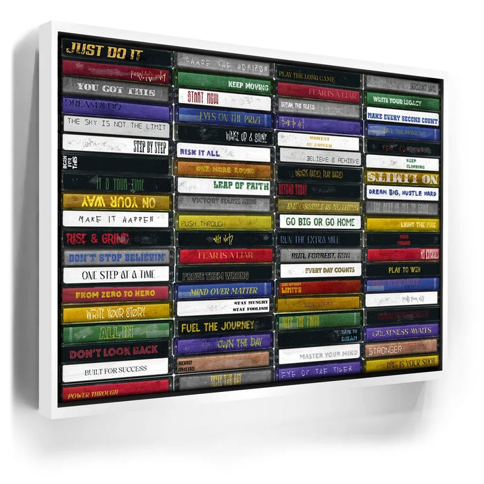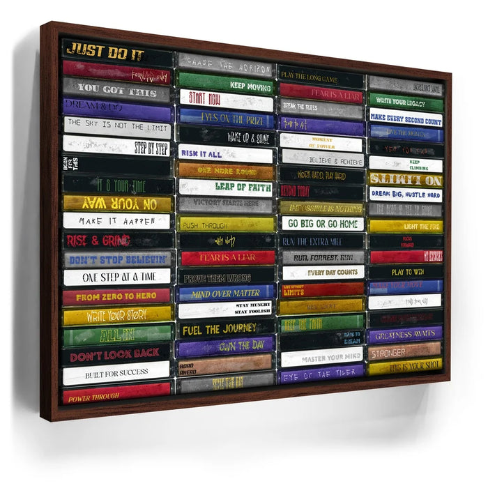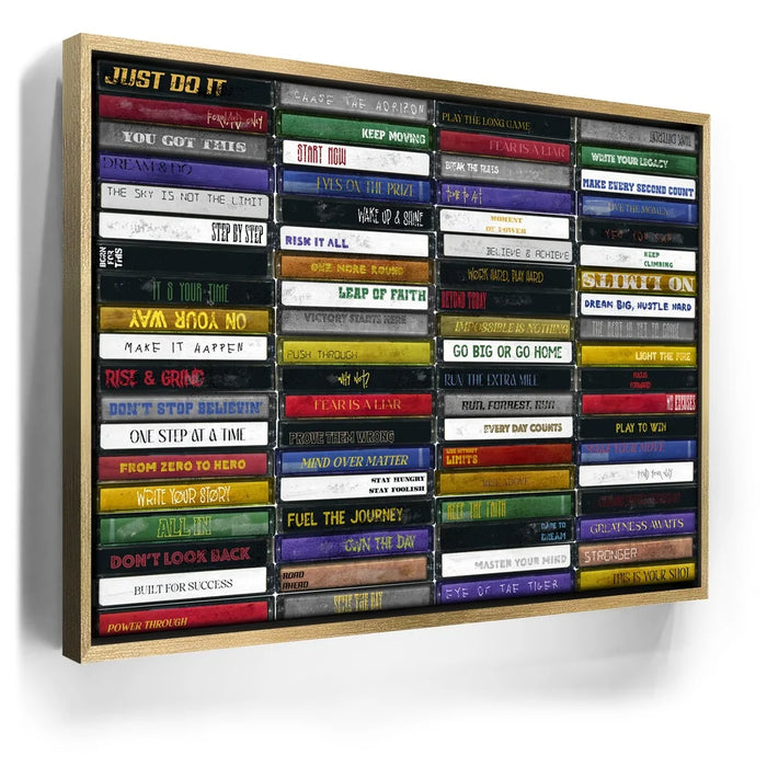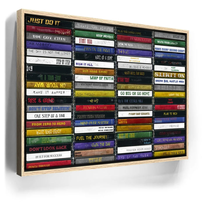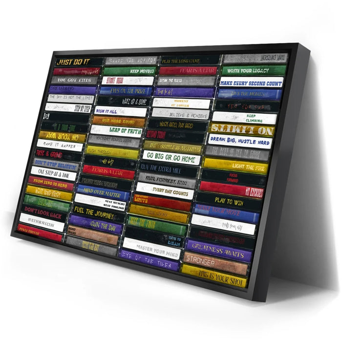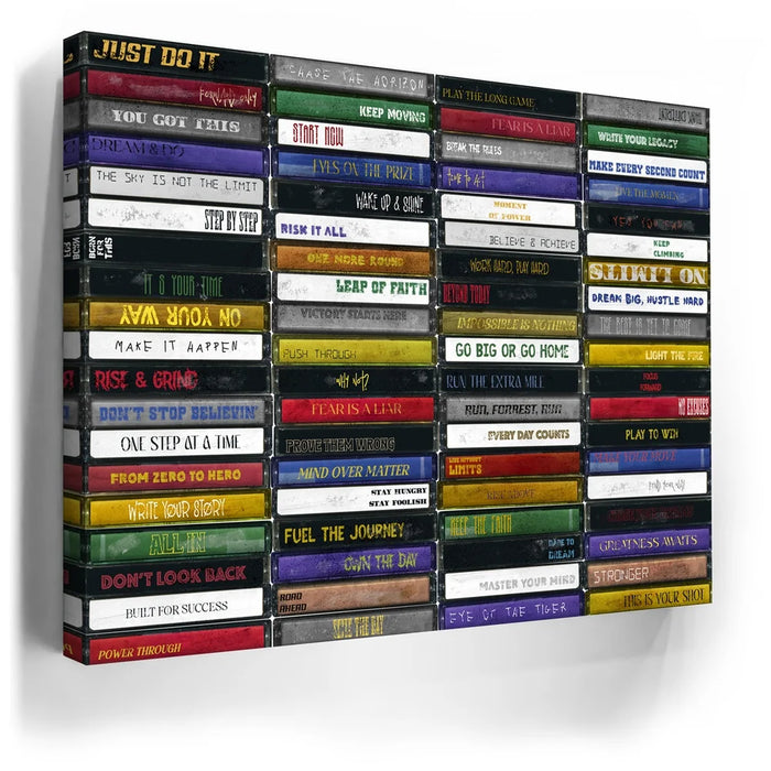 Soundtracks For Success brings nostalgia and motivation together in one powerful piece. Featuring an old-school cassette rack filled with tapes labeled with uplifting and motivational sayings, this artwork pays tribute to the golden age of music while inspiring drive and determination. It’s a perfect blend of vintage charm and positive energy, reminding you that every great journey has its own soundtrack.
