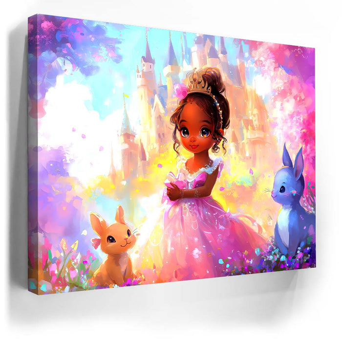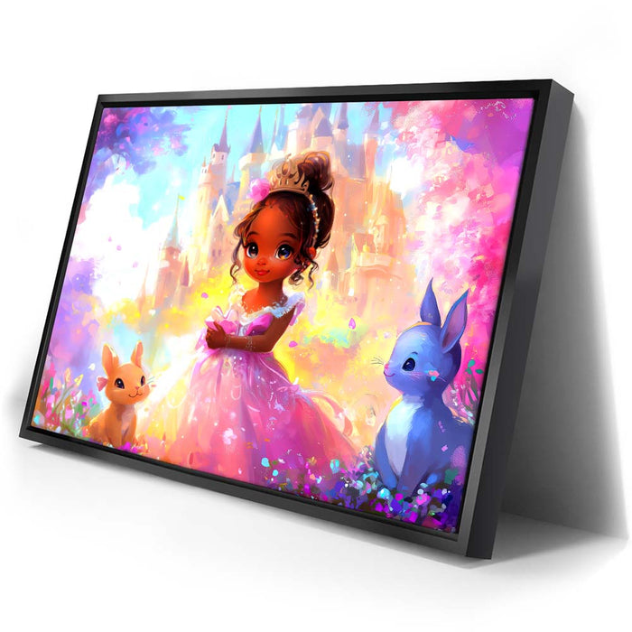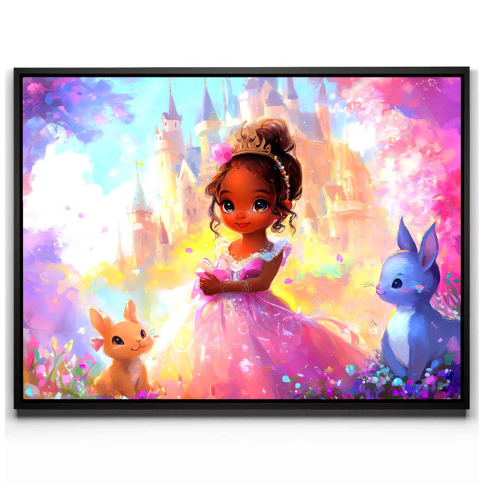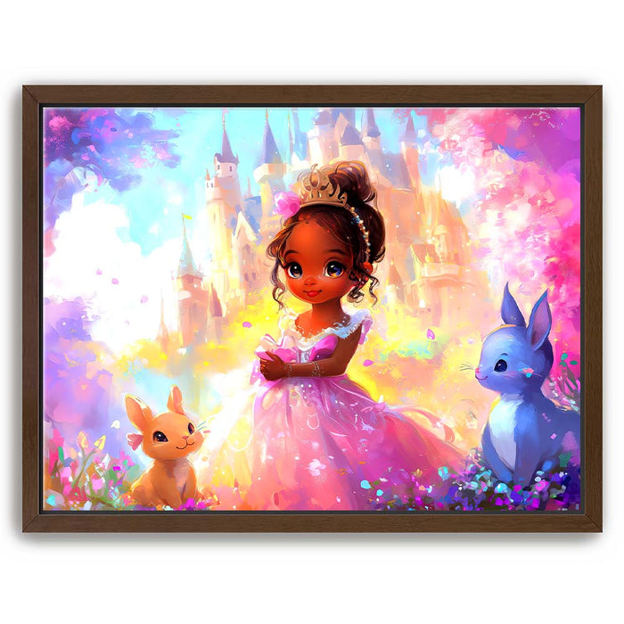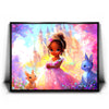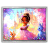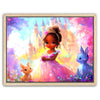 "Sparkle Kingdom" by Kandise King radiates charm and magic, portraying a young princess in a vibrant fairytale setting. Surrounded by whimsical bunnies and set against the backdrop of a shimmering castle, the artwork celebrates childhood wonder and imagination with a vivid palette of pinks, blues, and golds.