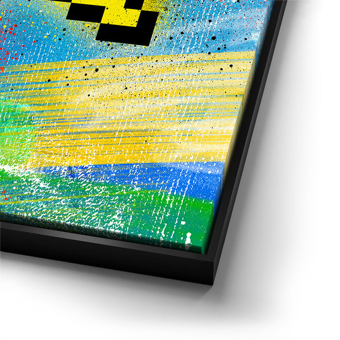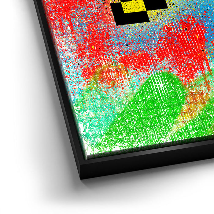 The dynamic background enhances the sense of energy and movement, making it a perfect piece for fans of video games and urban art. Ideal for those who appreciate the fusion of classic gaming icons with contemporary graffiti, this artwork brings a playful yet powerful presence to any space.