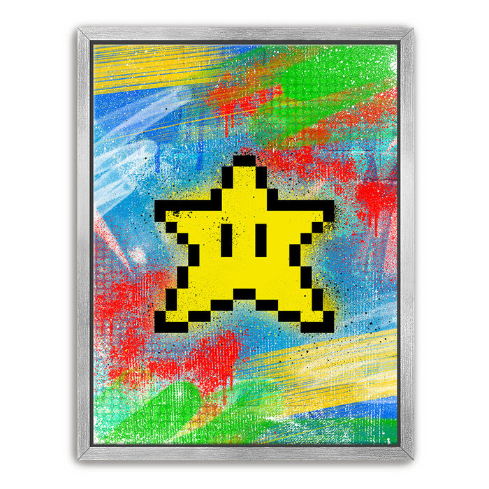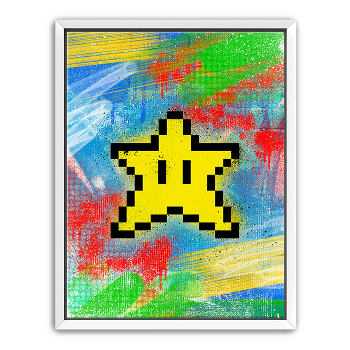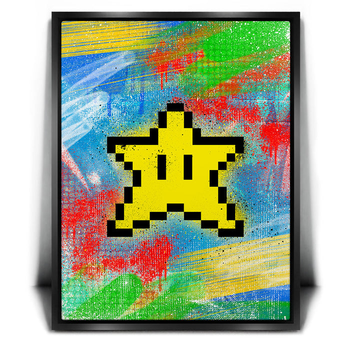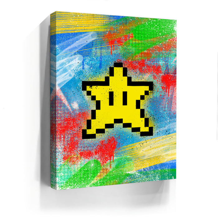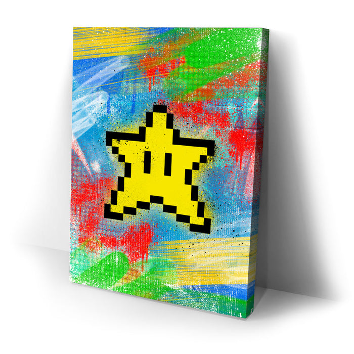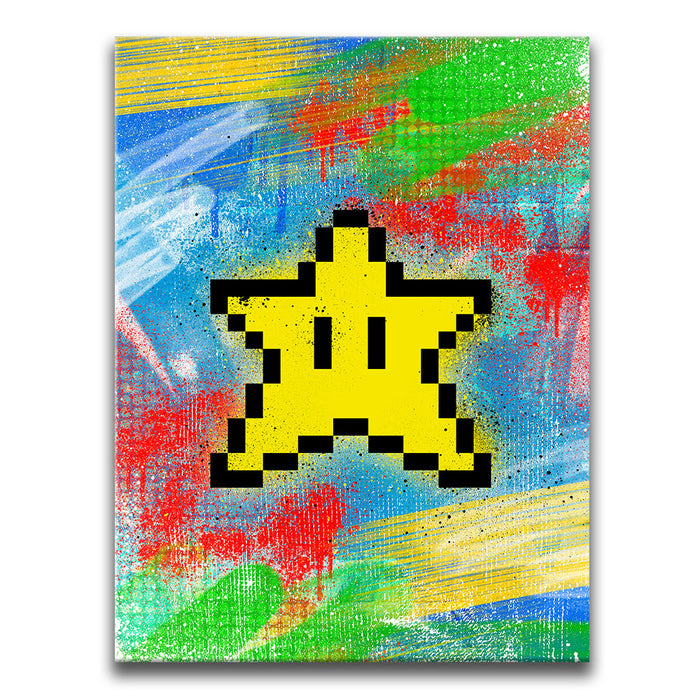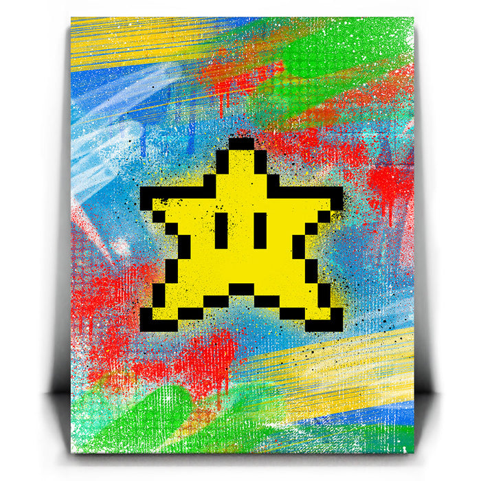 This vibrant artwork, titled "Star Power - Graffiti," merges the nostalgic charm of video games with the bold expression of street art. Featuring the iconic star from Super Mario Bros, the piece is rendered in a colorful, graffiti-style composition, blending bright splashes of color with the pixelated design.