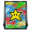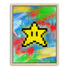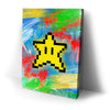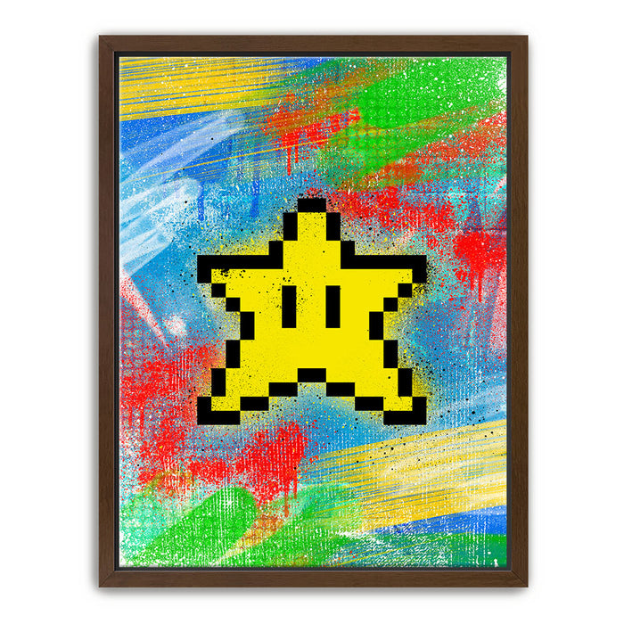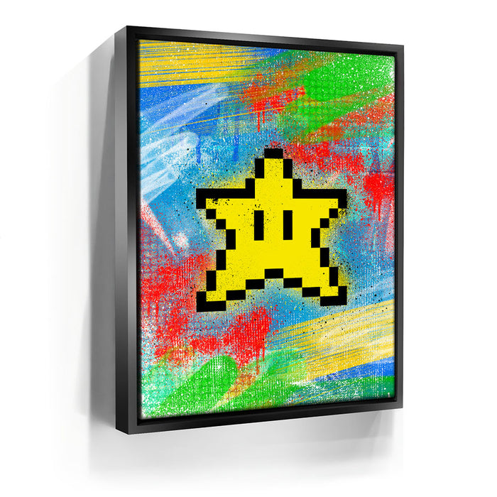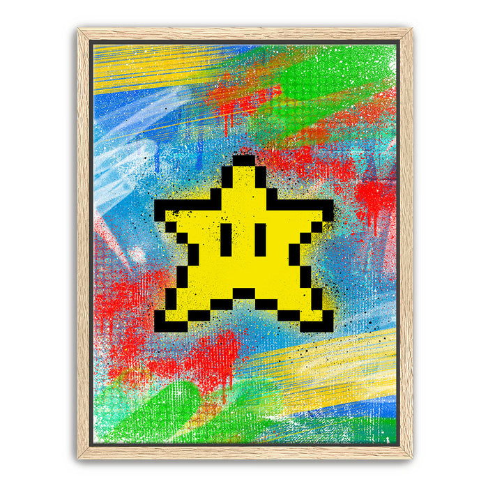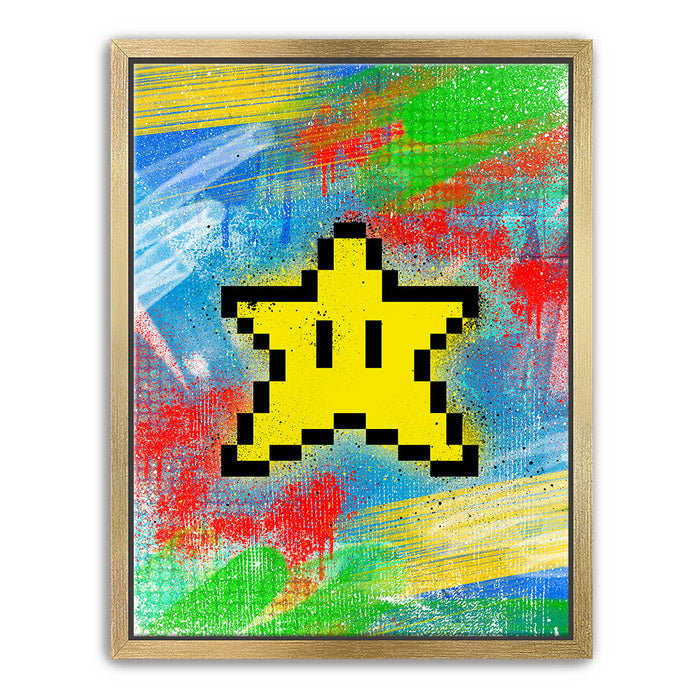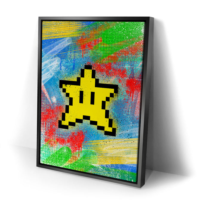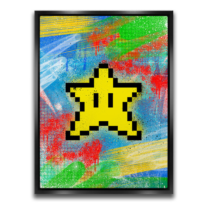 This vibrant artwork, titled "Star Power - Graffiti," merges the nostalgic charm of video games with the bold expression of street art. Featuring the iconic star from Super Mario Bros, the piece is rendered in a colorful, graffiti-style composition, blending bright splashes of color with the pixelated design.