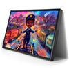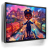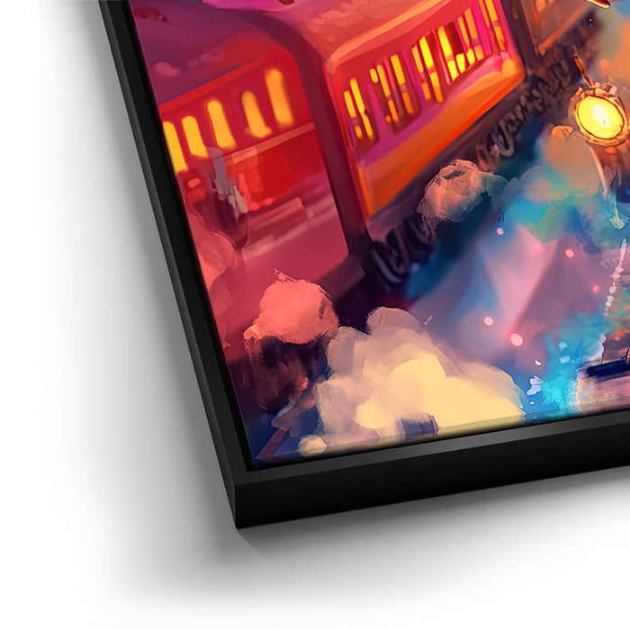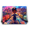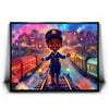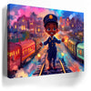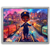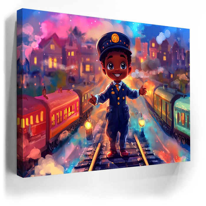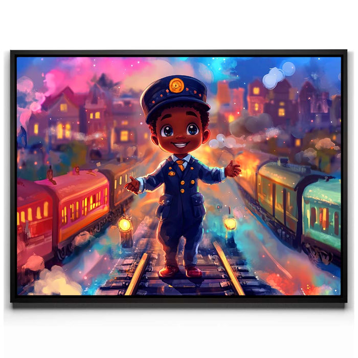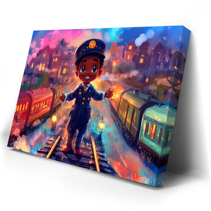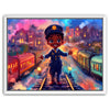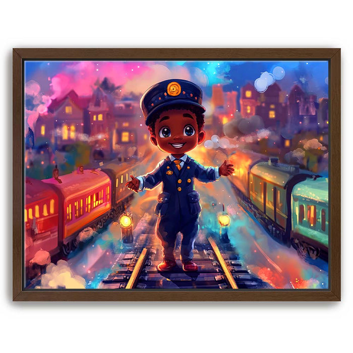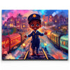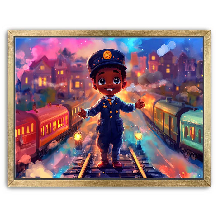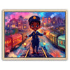 "Starlight Station" by Kandise King is a vibrant celebration of imagination and adventure. Featuring a young train conductor beaming with joy, the artwork captures a magical evening scene illuminated by glowing trains and a whimsical townscape. The captivating blend of rich blues, glowing lights, and soft pastel hues evokes nostalgia and wonder.