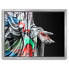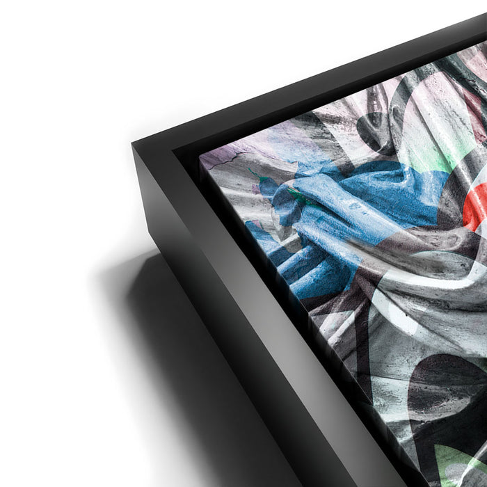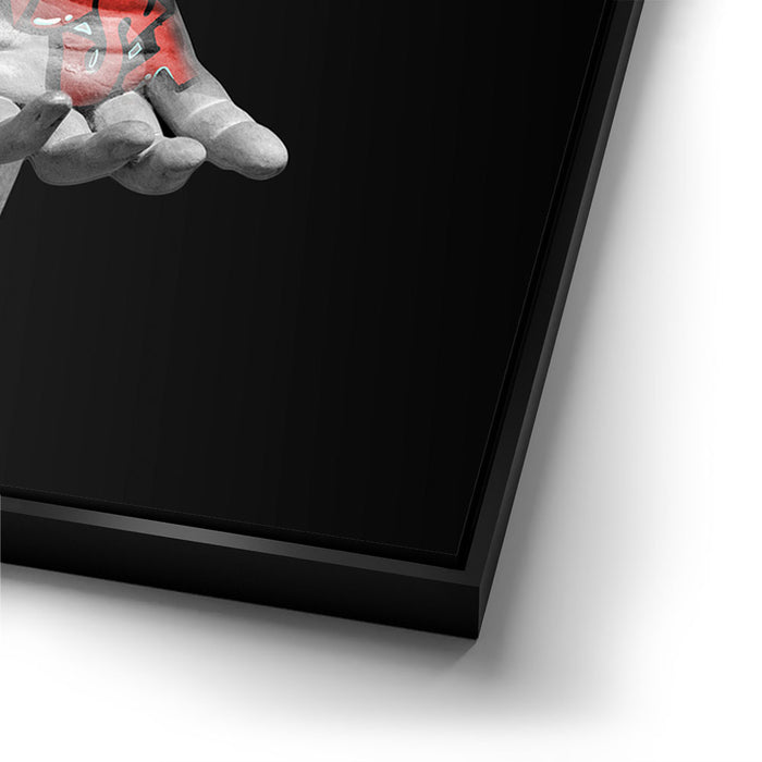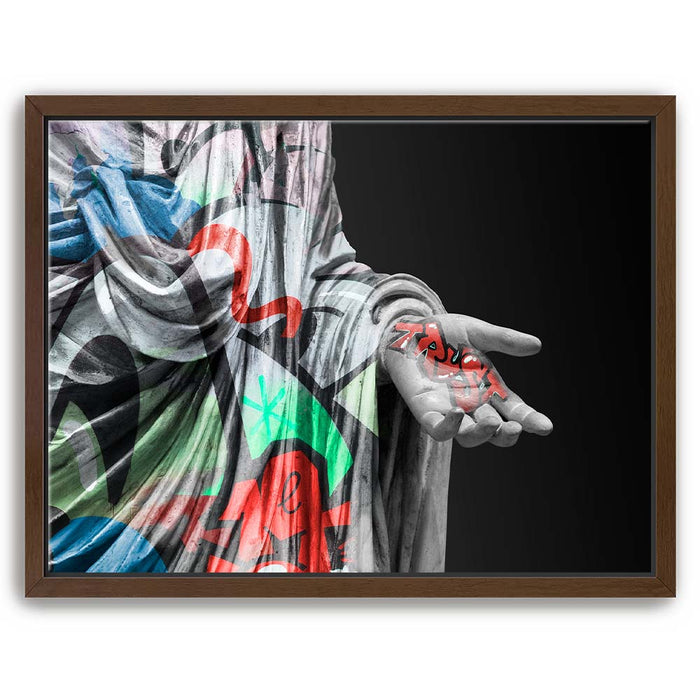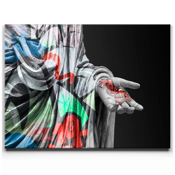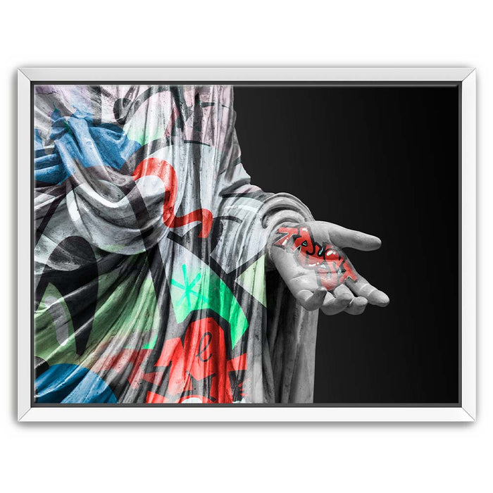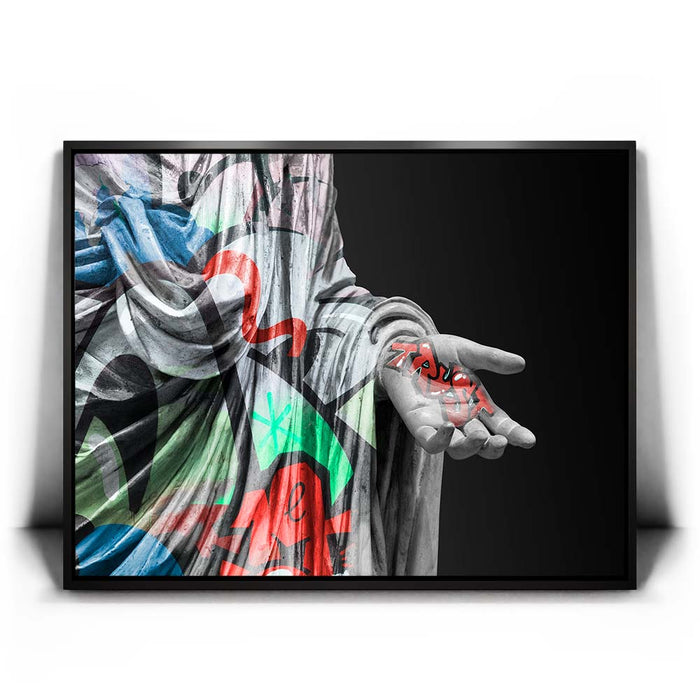 The juxtaposition of the ancient form with modern graffiti elements creates a powerful visual statement on trust and faith in contemporary society. Perfect for those who appreciate the fusion of traditional art with urban street culture, this piece brings a dynamic and colorful twist to the classic concept of sculpture, making it a unique addition to any collection.