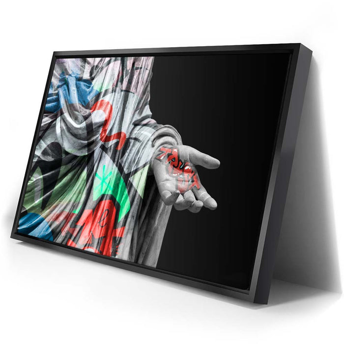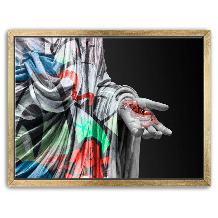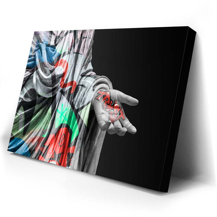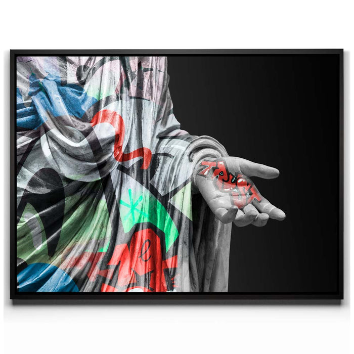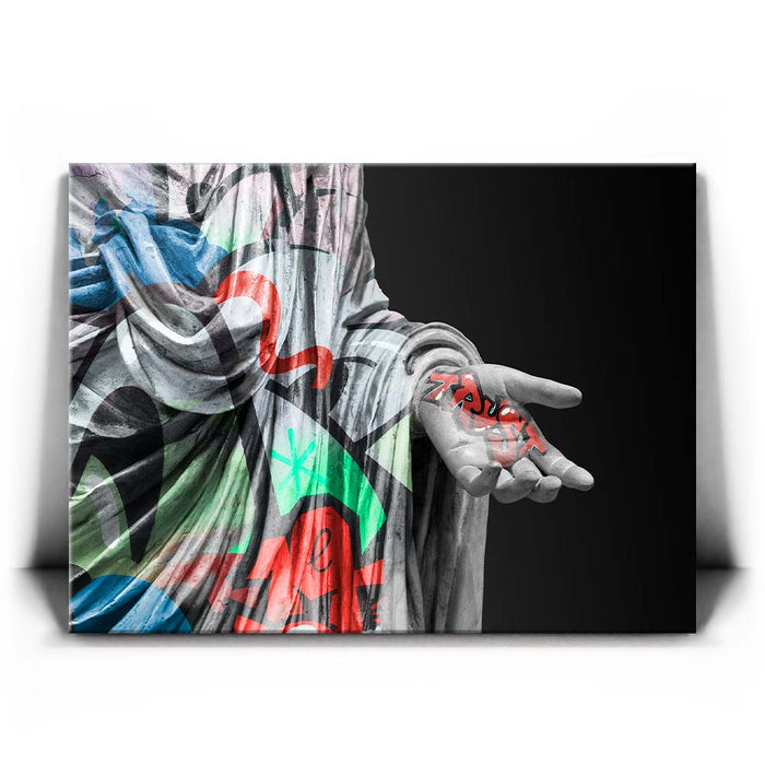 This striking piece, titled "Statue of Trust - Graffiti," combines the elegance of classical sculpture with the edgy vibrancy of graffiti. The statue, draped in colorful street art patterns, holds the word "Trust" boldly inscribed in graffiti-style typography on its outstretched hand.
