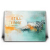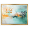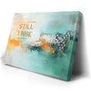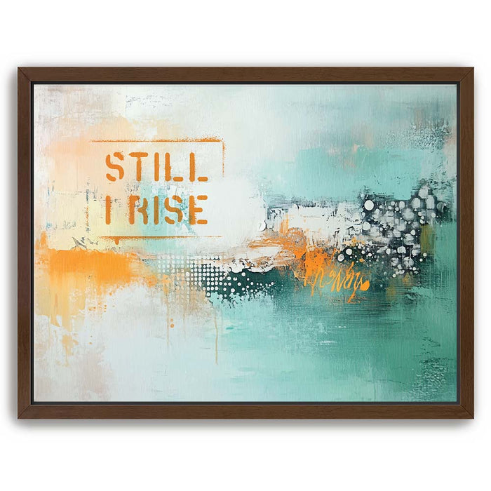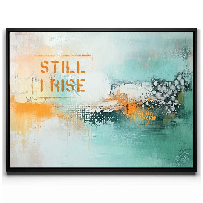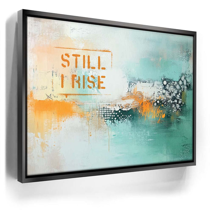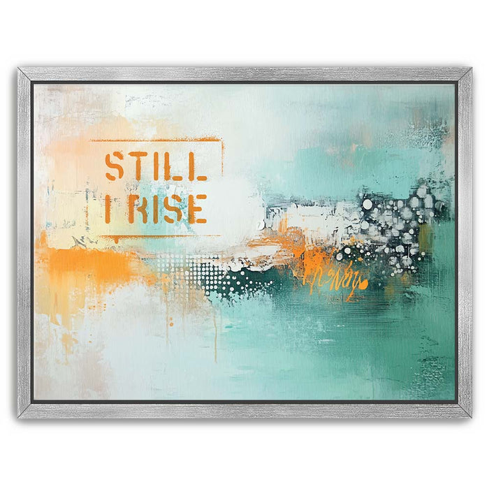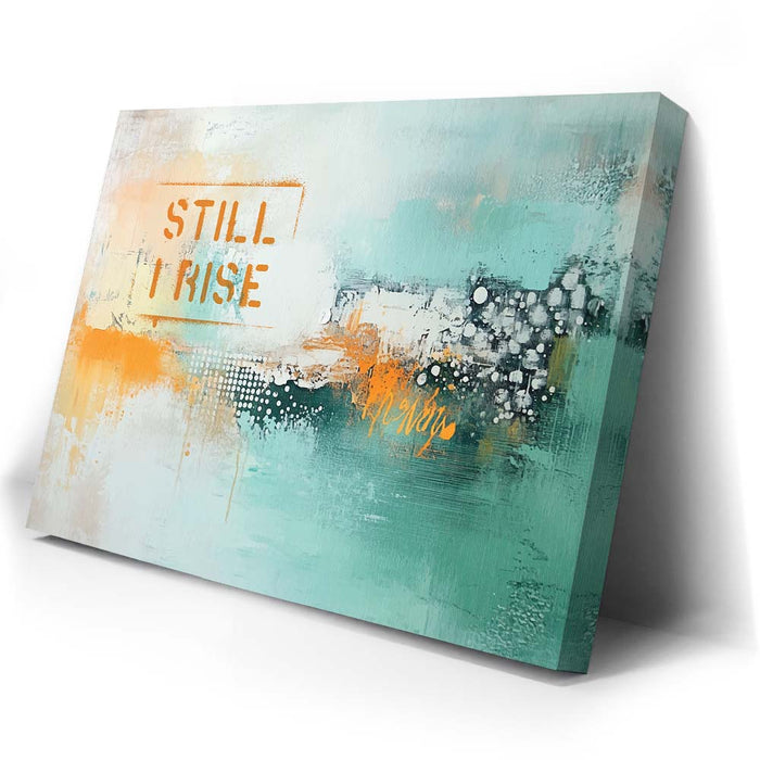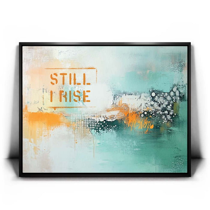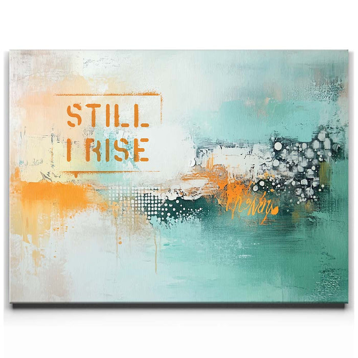 "Still I Rise - I" is a captivating abstract artwork inspired by resilience and empowerment. The piece features a harmonious blend of pastel greens, whites, and pops of orange, symbolizing hope and determination. The stenciled phrase "Still I Rise" boldly anchors the artwork, evoking strength and perseverance in the face of challenges.