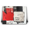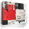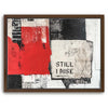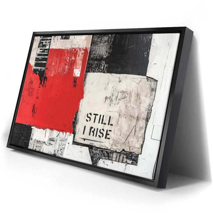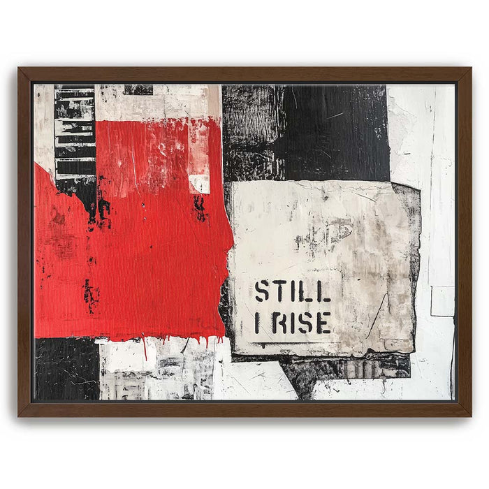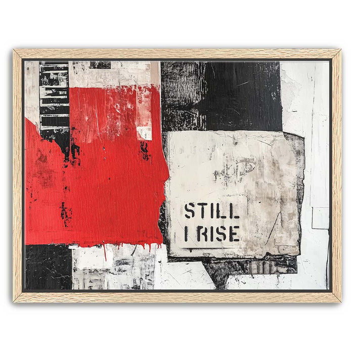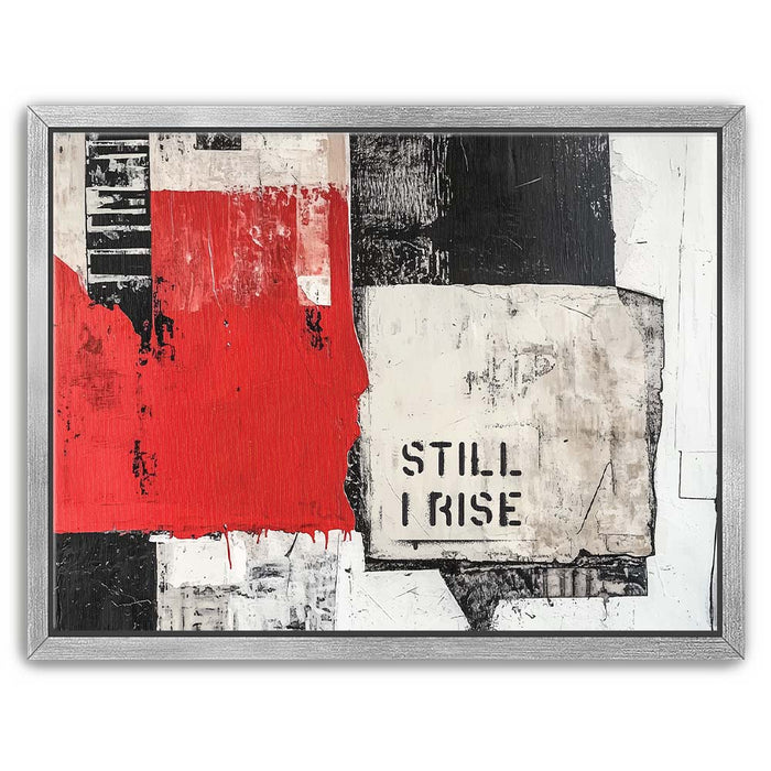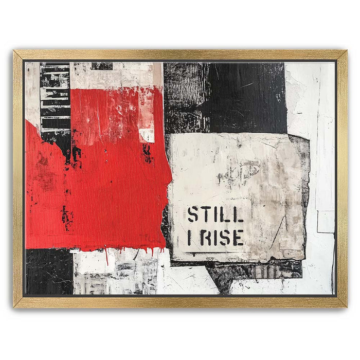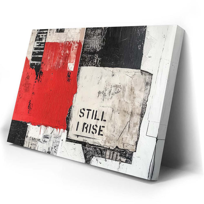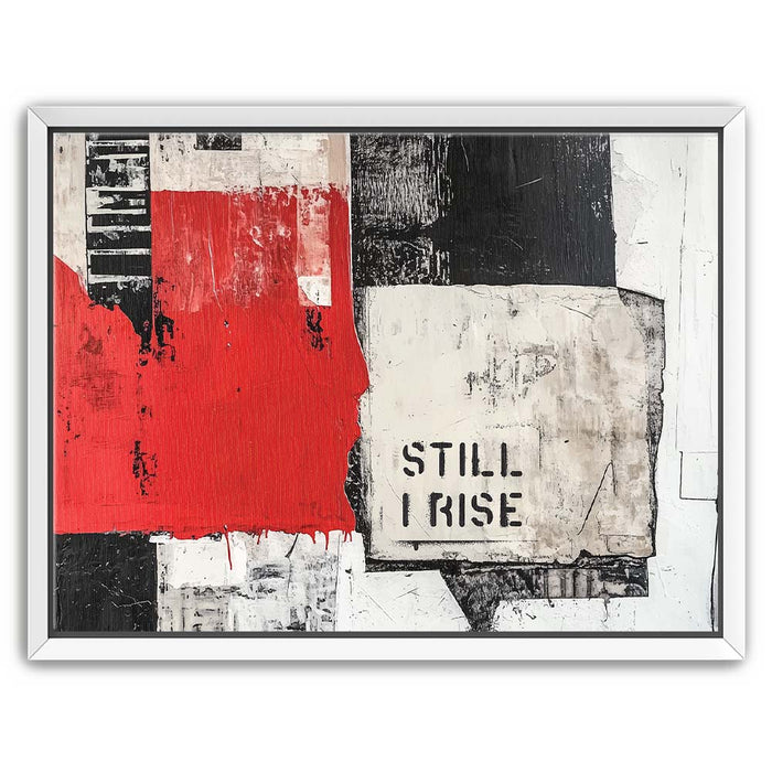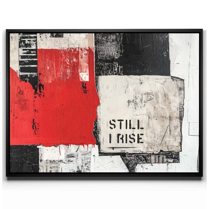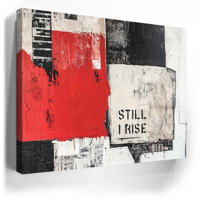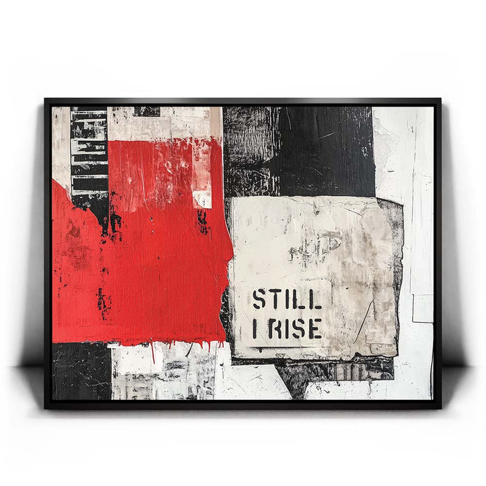 "Still I Rise - II" is a striking piece that fuses bold, monochromatic tones with a pop of red. The fragmented black and white textures combined with the powerful "Still I Rise" stencil create a visual narrative of strength and persistence. This artwork draws inspiration from abstract expressionism, utilizing layers and bold lines to evoke emotions of resilience and empowerment.