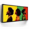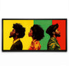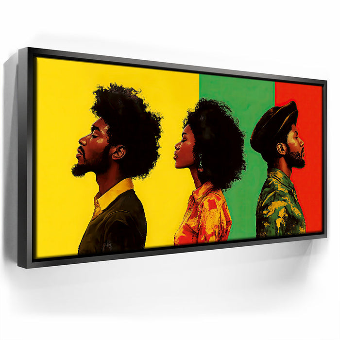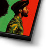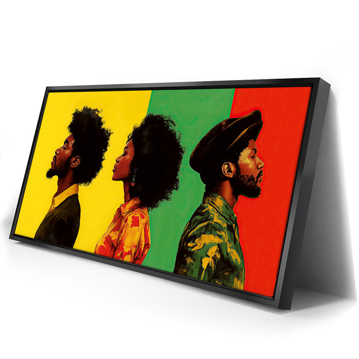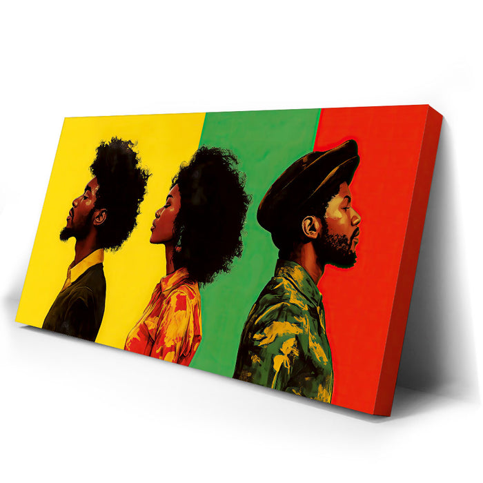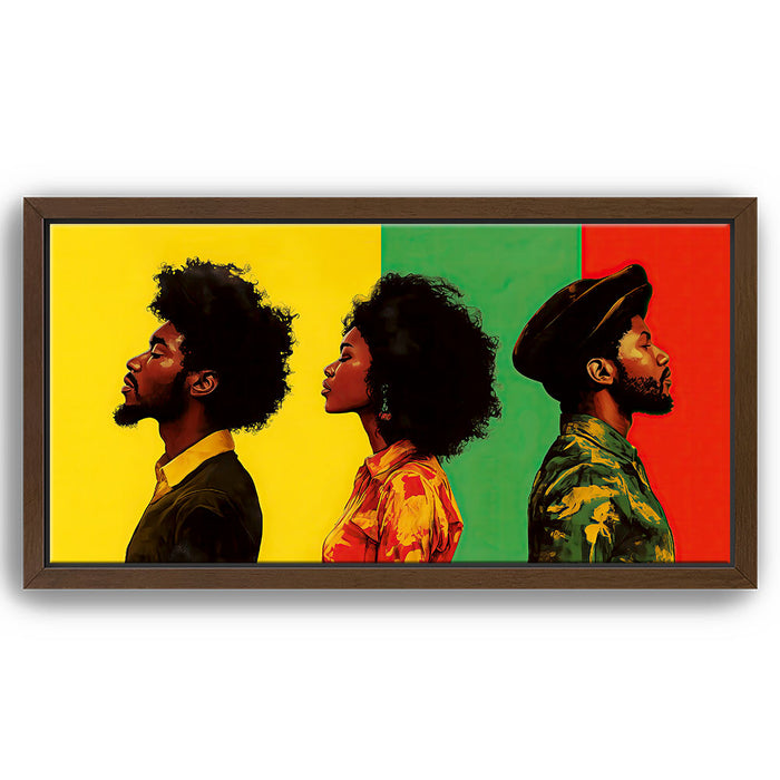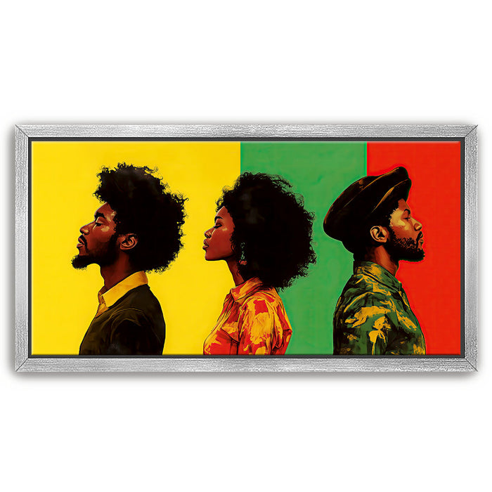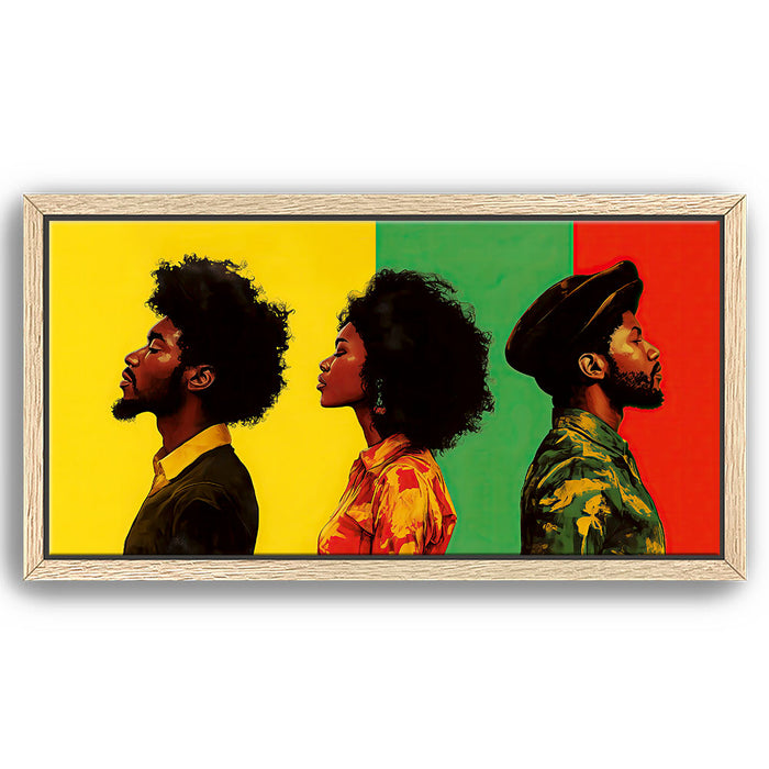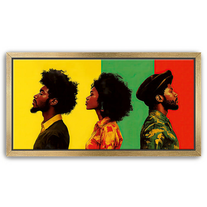 "Strength in Freedom" by Kandise King is a bold and evocative portrayal of cultural pride and resilience. Featuring three figures in profile against a vibrant tricolor backdrop, the artwork celebrates unity, individuality, and the strength found in heritage. The rich colors and expressive composition pay homage to empowerment and liberation.