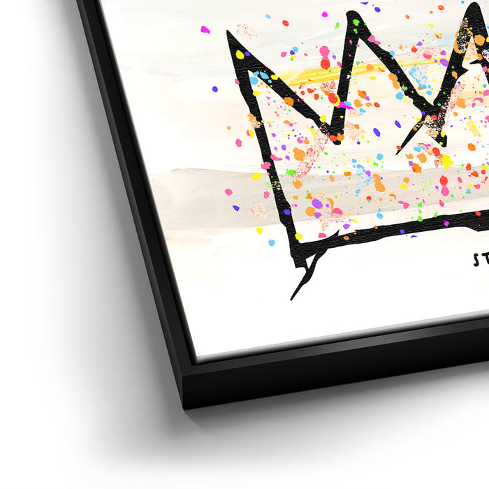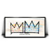 "Stronger Together I - Basquiat Inspired" is a bold and motivational street art piece that channels the energy and style of Jean-Michel Basquiat. Featuring powerful imagery like crowns and vibrant graffiti elements, this artwork emphasizes the strength of unity and the power of inspiration. The piece combines dynamic colors and raw expression to deliver a message of perseverance and collaboration.