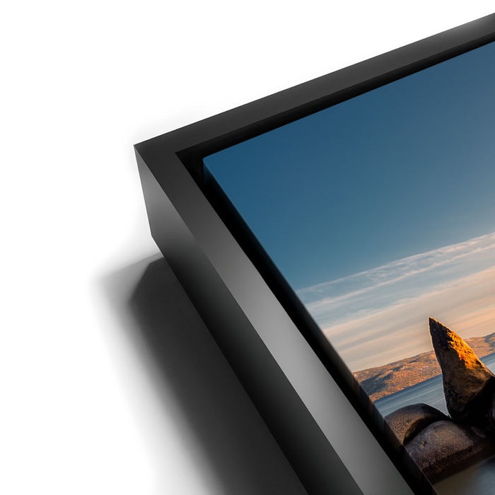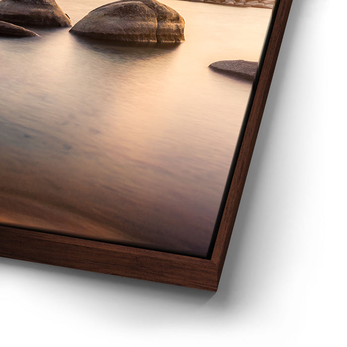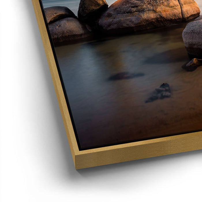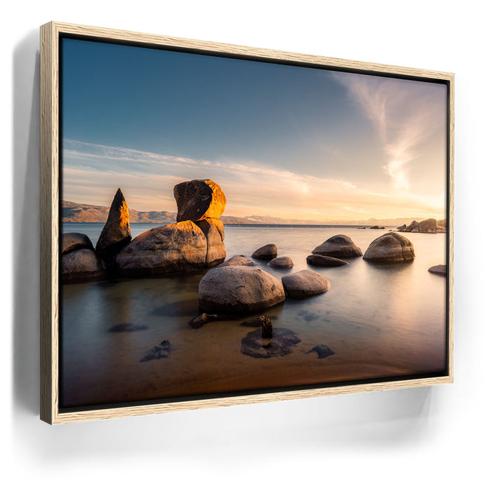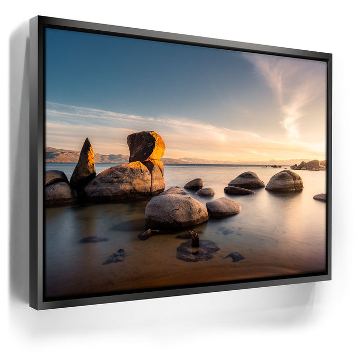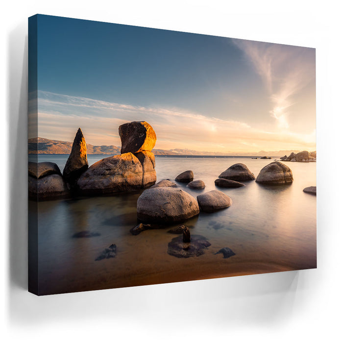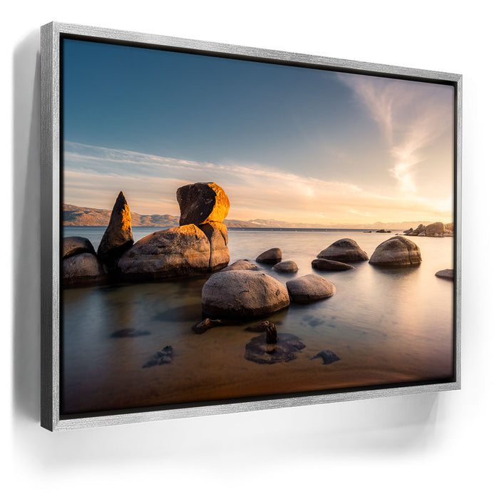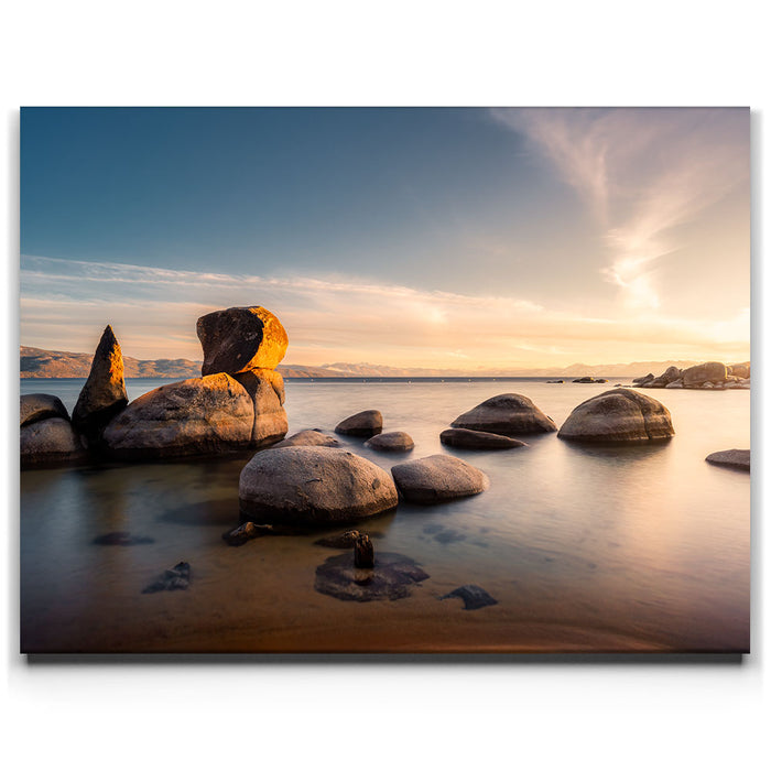 “Sunset Sculptures” by Daniel Heck captures the golden light of evening washing over the smooth granite boulders of Lake Tahoe. The sunlit rocks stand like natural sculptures along the shoreline, reflecting warm tones against the clear alpine waters beneath a peaceful sky.