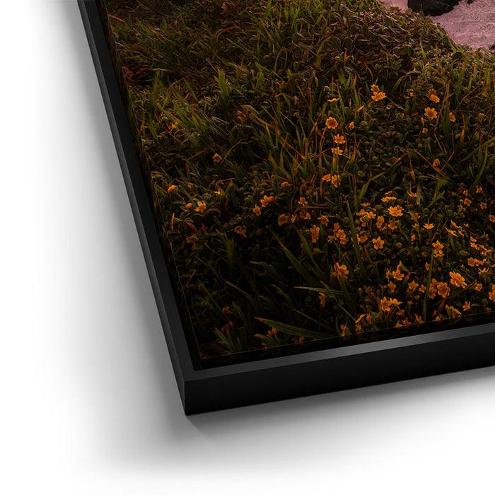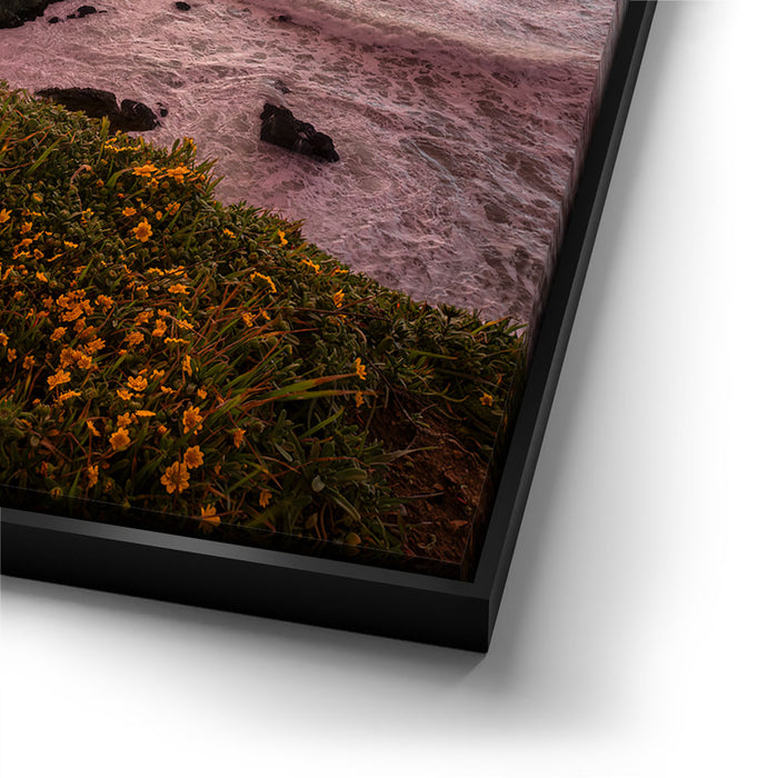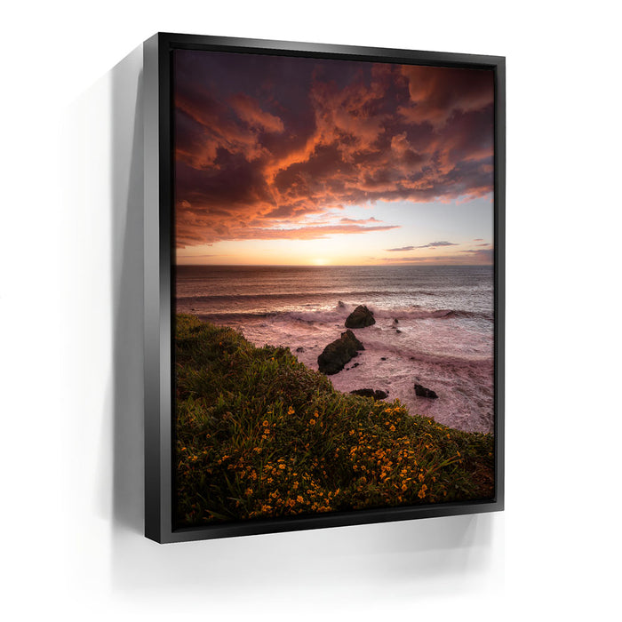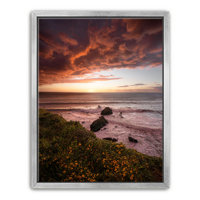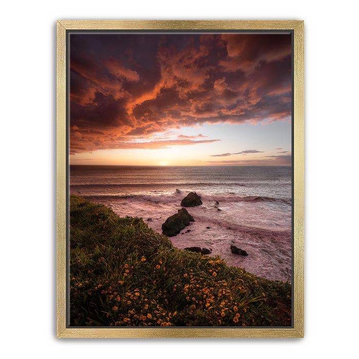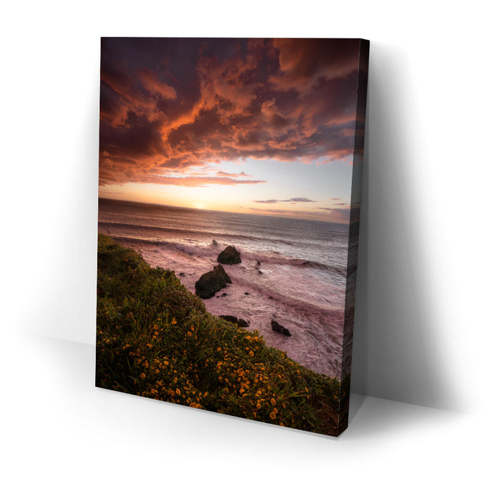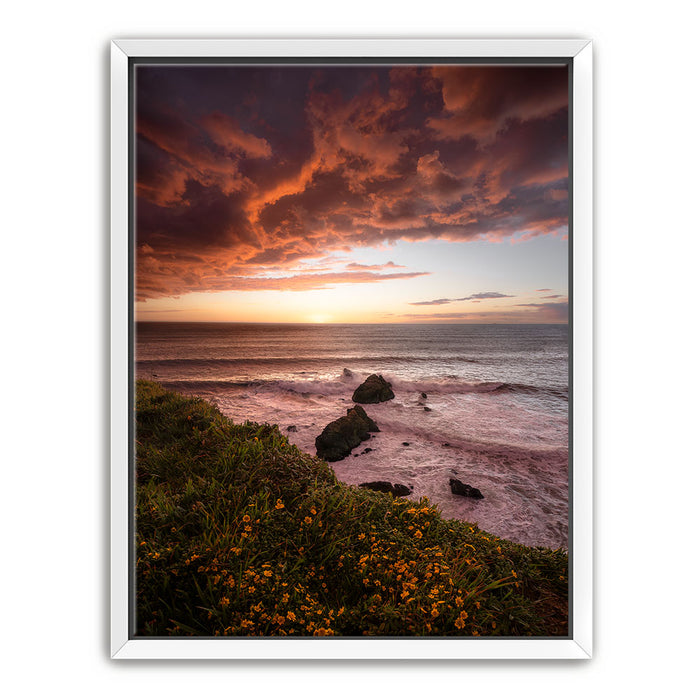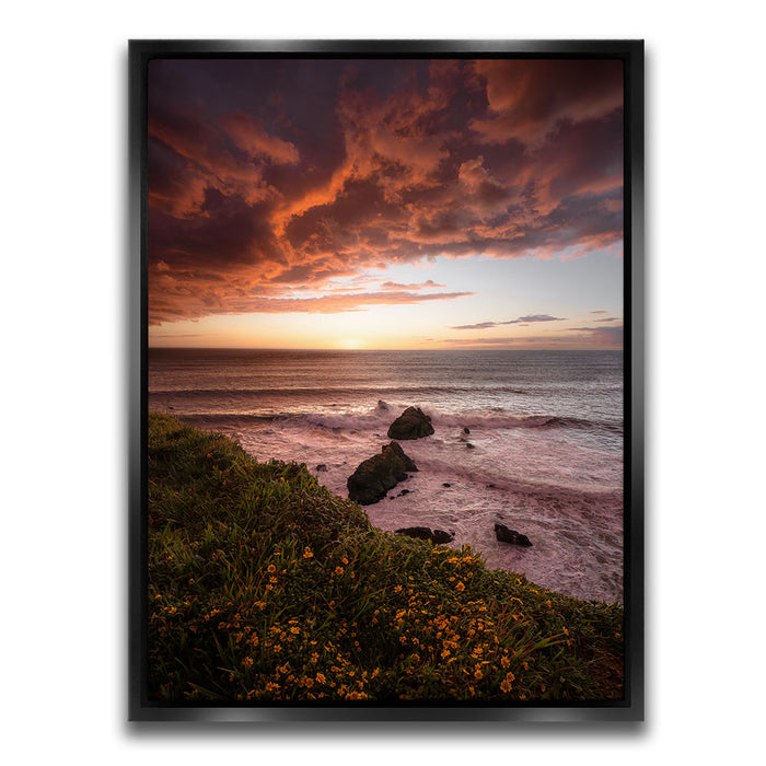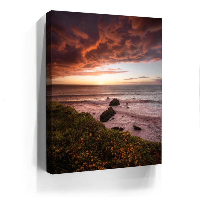 Immerse yourself in the breathtaking beauty of "Sunset Symphony" by Daniel Heck. This stunning photograph captures the vibrant colors of the sunset as they dance across a cloud-filled sky, casting a warm glow over the ocean and wildflowers below. The dramatic interplay of light and clouds creates a mesmerizing scene, perfect for those who appreciate the serene beauty of nature.