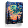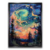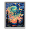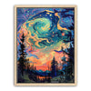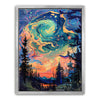 "Swirly Aurora Sunset Fantasy" by Stella Ygris is a mesmerizing blend of surrealism and vibrant color, showcasing a swirling aurora across a fantastical sunset sky. The painting bursts with dynamic energy, featuring swirling patterns of green, orange, pink, and blue that dance above a serene landscape of silhouetted trees and distant mountain peaks. The piece captures the magic of a dreamlike moment where the natural world and imagination collide.