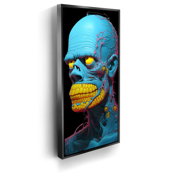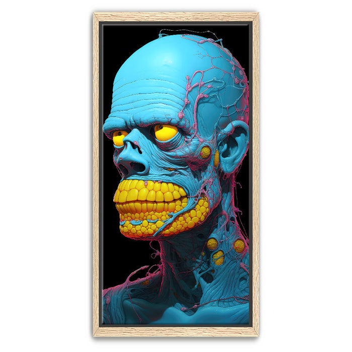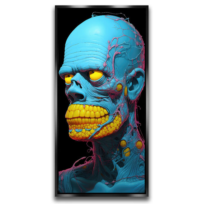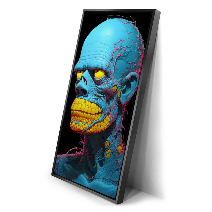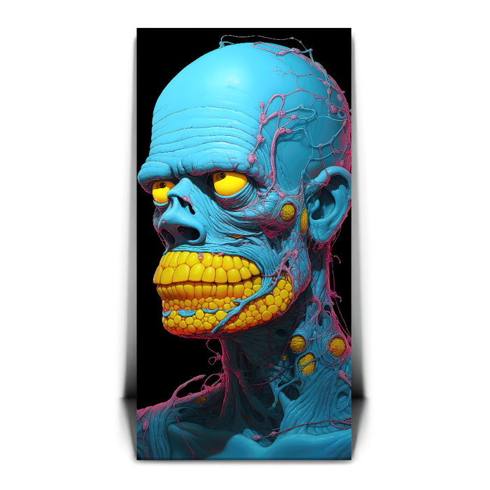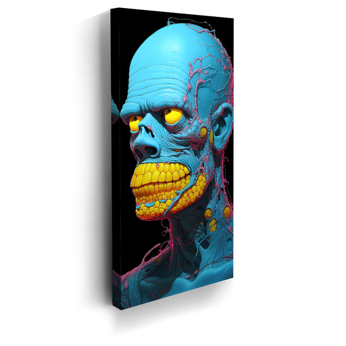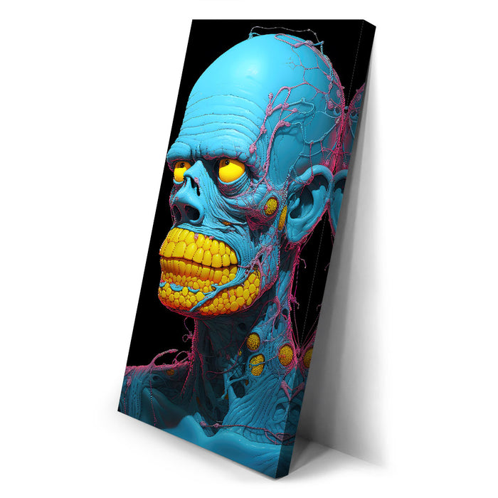 "Synthetic Anomaly" by Midjourney.Man is a bold and futuristic portrayal of a humanoid figure that pushes the boundaries of artificial life. The character’s vibrant blue skin and exaggerated, yellow teeth create a surreal, almost robotic appearance, while the intricate pink and yellow veins and nodules running through its form emphasize its synthetic, non-human nature. The bright, contrasting colors and intricate detailing evoke a sense of technological complexity mixed with biological elements.