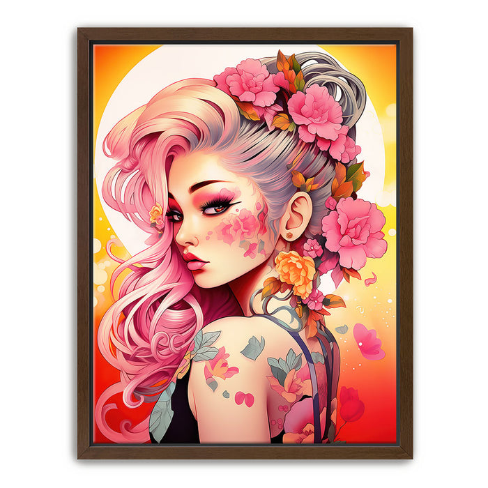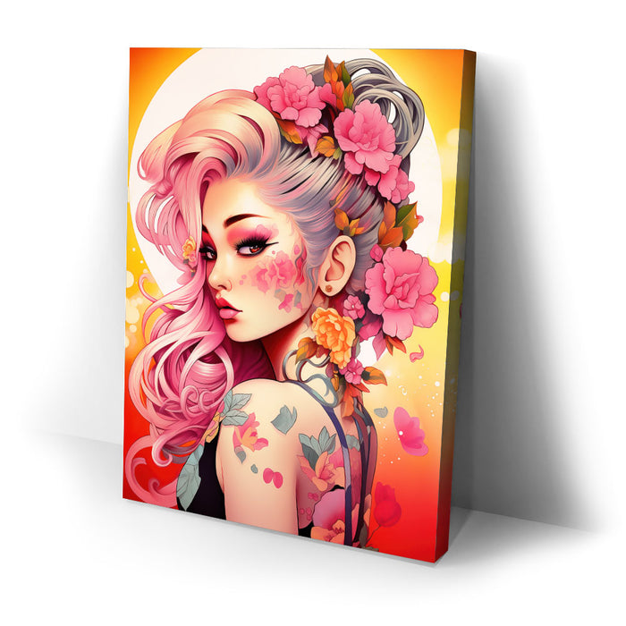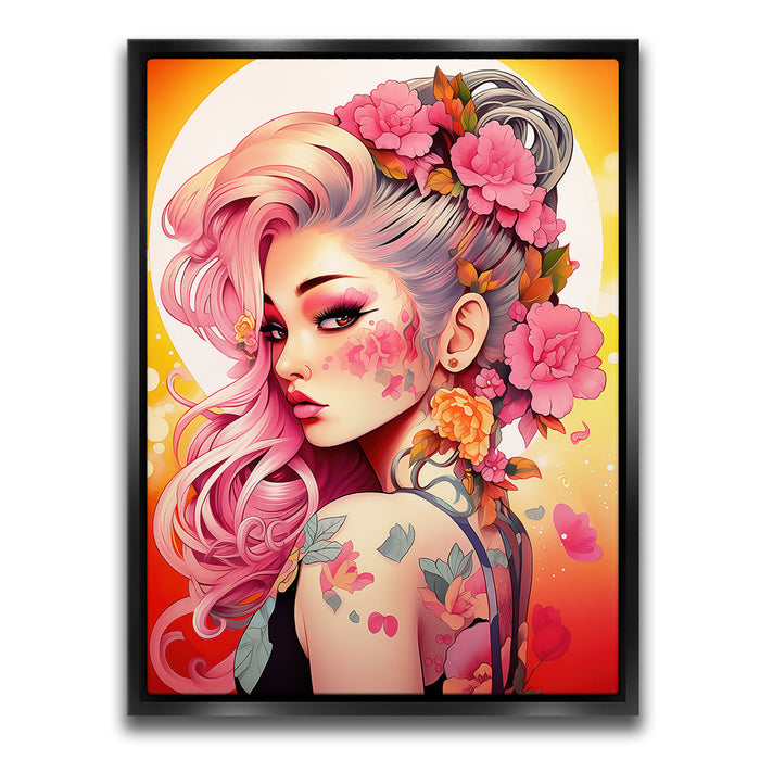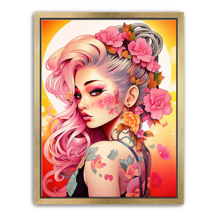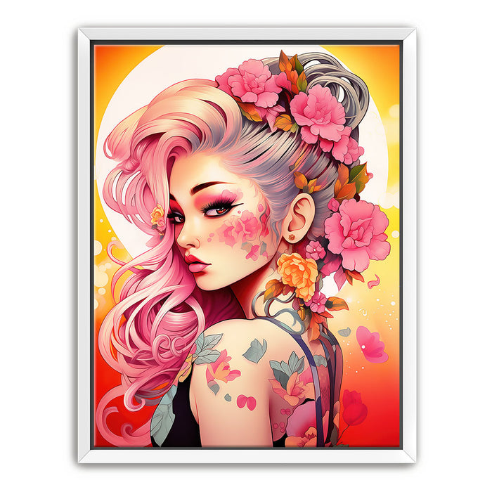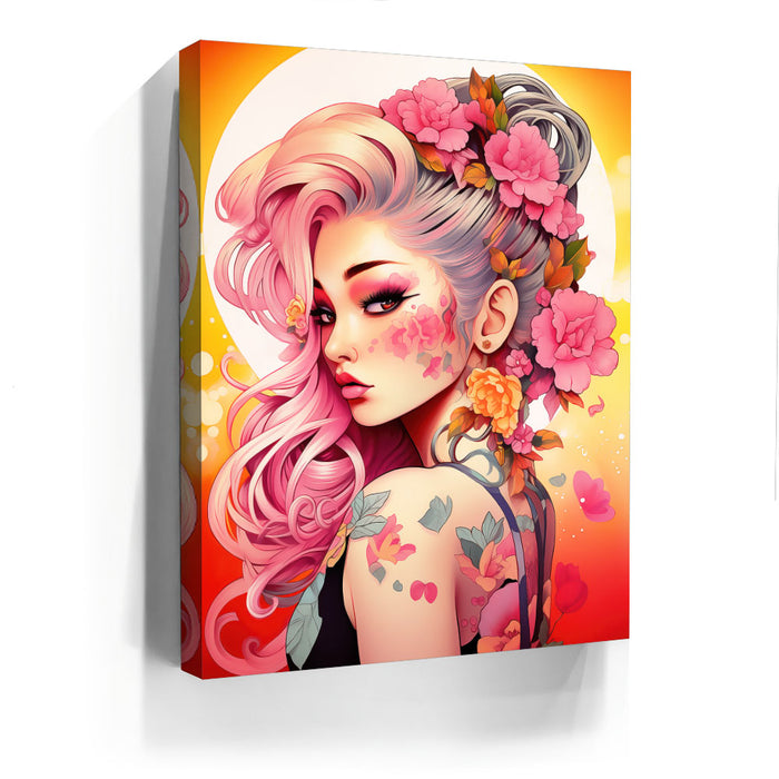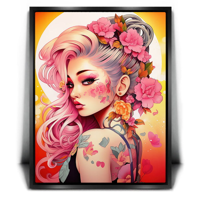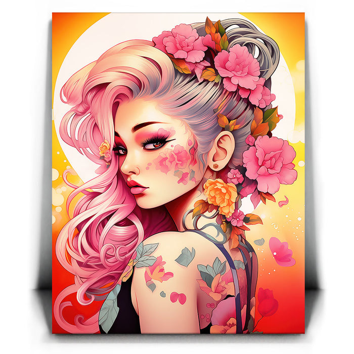 "Tattooed Blossoms" by Stella Ygris is a mesmerizing celebration of beauty, individuality, and artistry. This vibrant piece showcases a striking figure adorned with intricate floral tattoos that seamlessly blend with her flowing pink hair and vivid blossoms, creating a harmonious fusion of nature and personal expression.