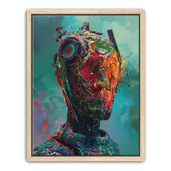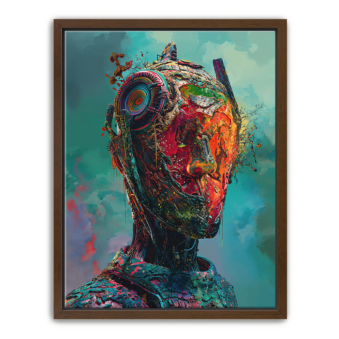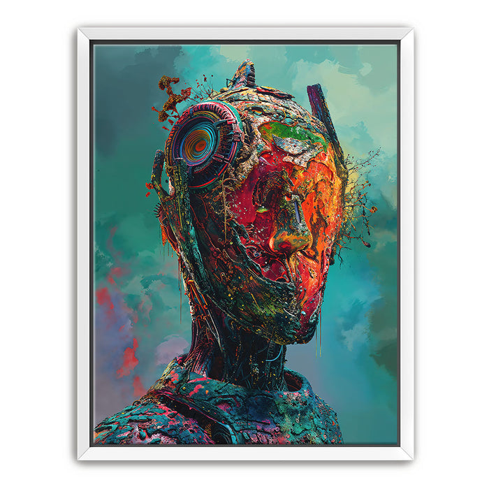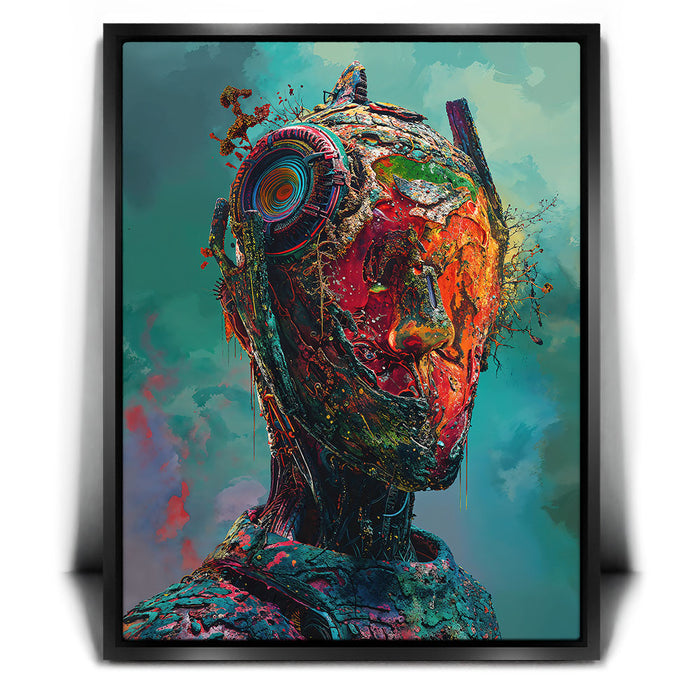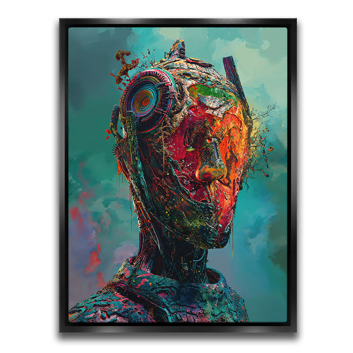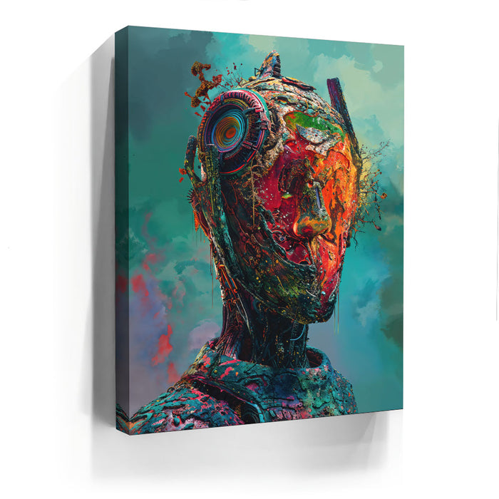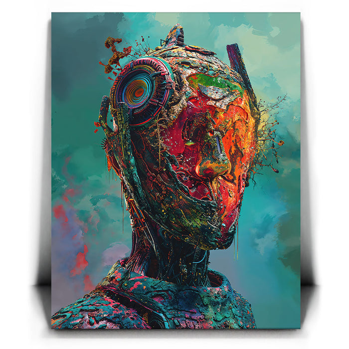 "The Beauty of Decay" by Midjourney.Man is a stunning fusion of life and decay, presenting a humanoid figure adorned with organic textures, vibrant colors, and intricate mechanical details. This artwork explores the transformative cycle of nature and technology, highlighting the elegance found in imperfection and breakdown.