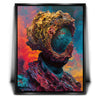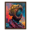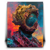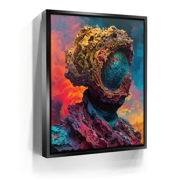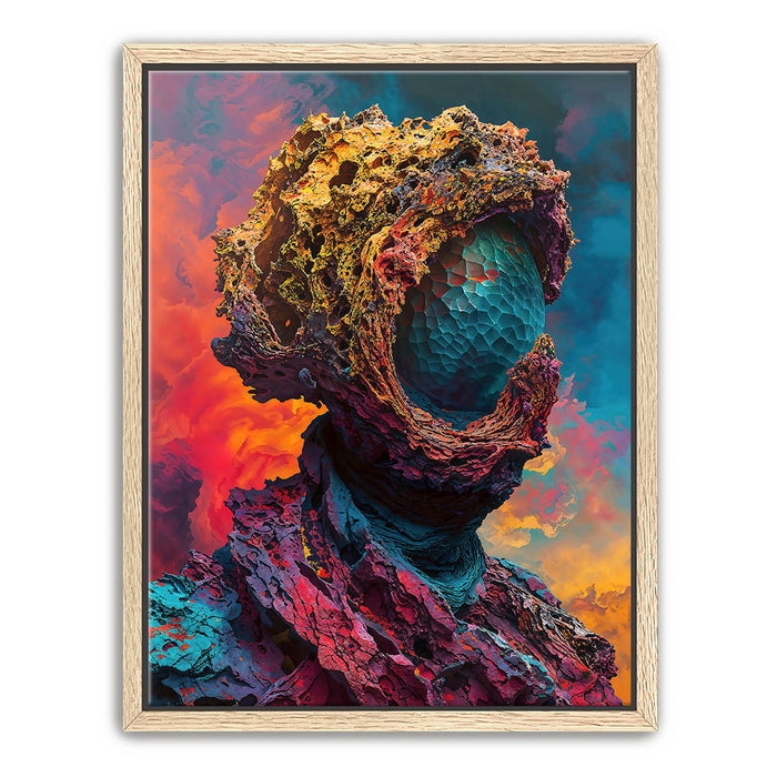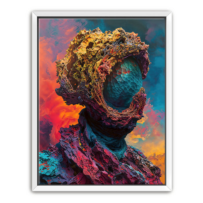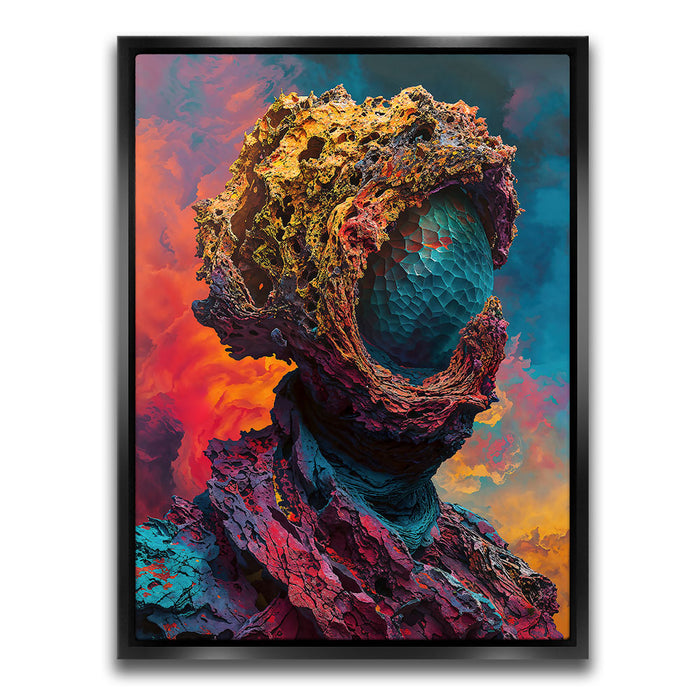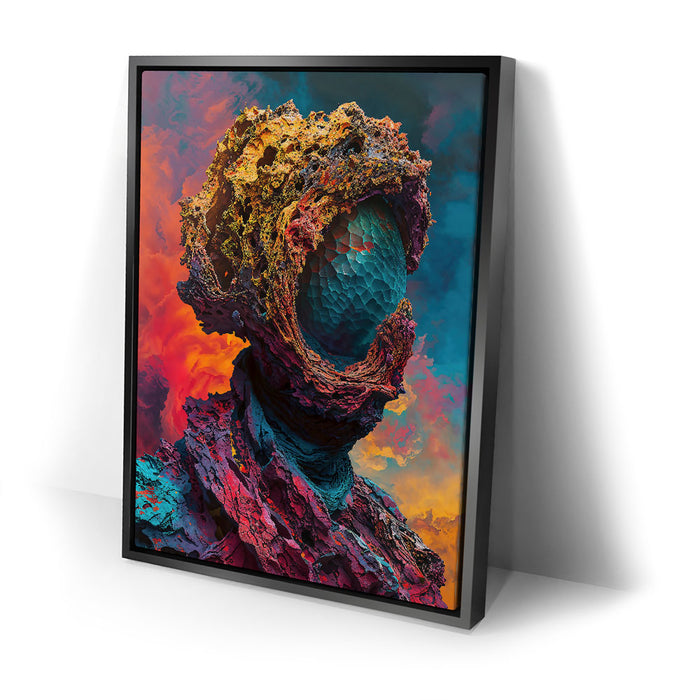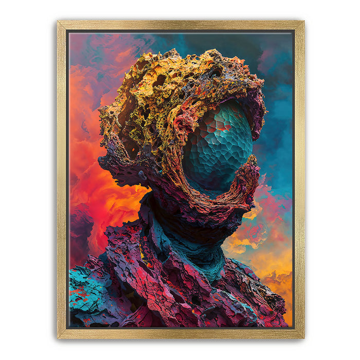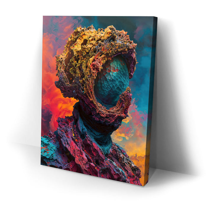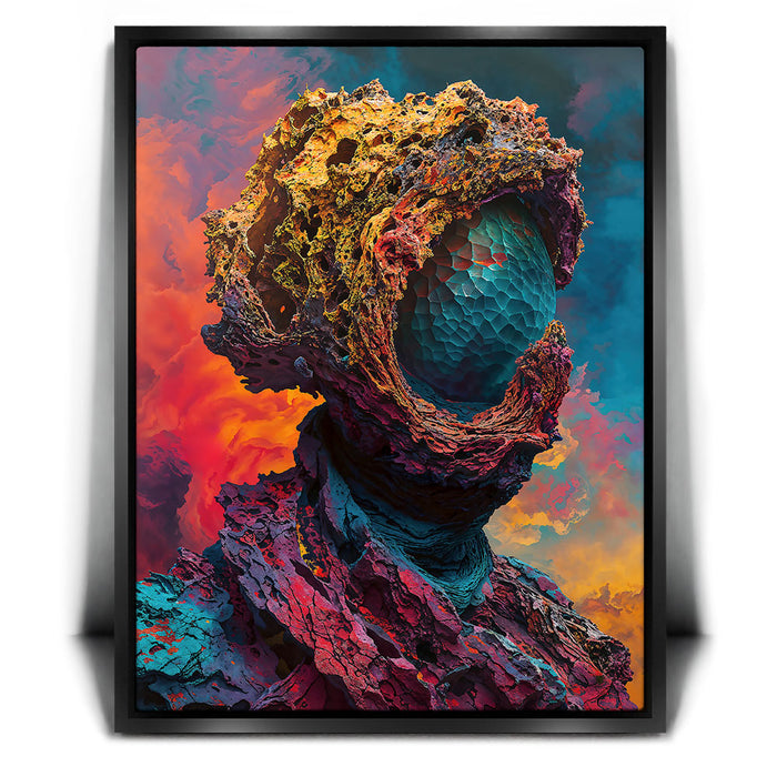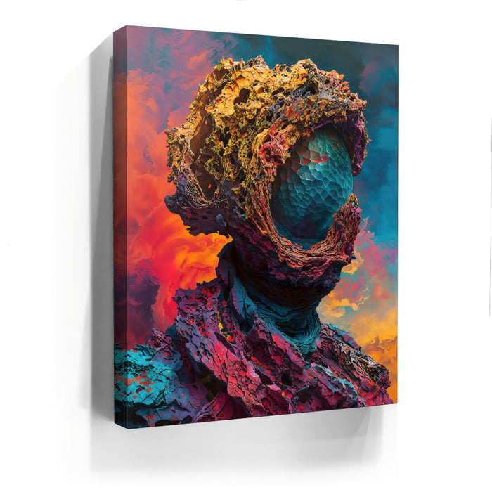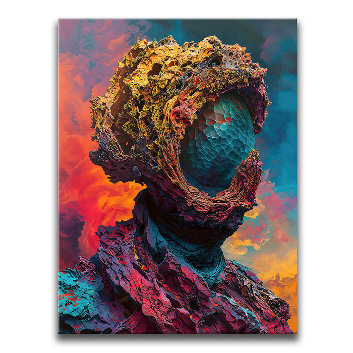 "The Hive Within" by Midjourney.Man is a surreal exploration of form and texture, featuring an otherworldly figure with a honeycomb-like core encased in layers of organic, weathered material. The vibrant interplay of colors—ranging from fiery reds and oranges to serene blues—creates a dramatic visual contrast that captivates the viewer.