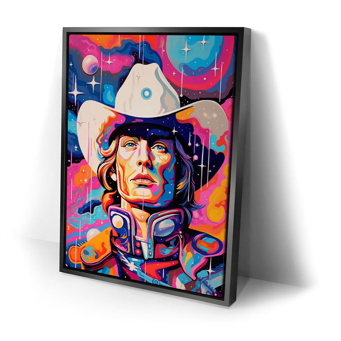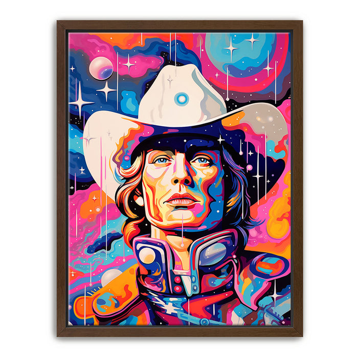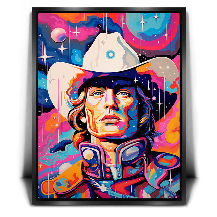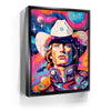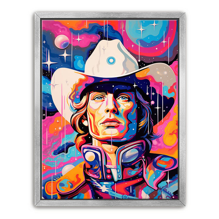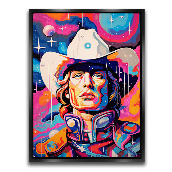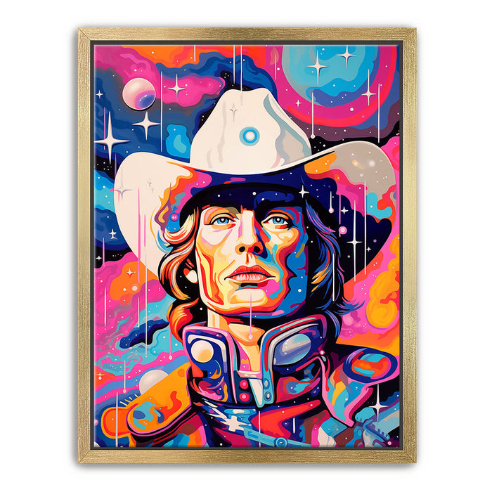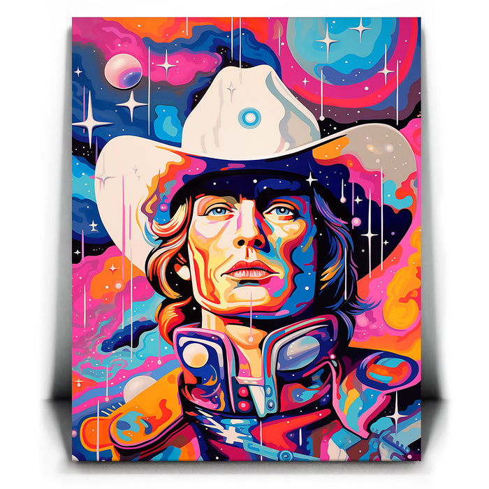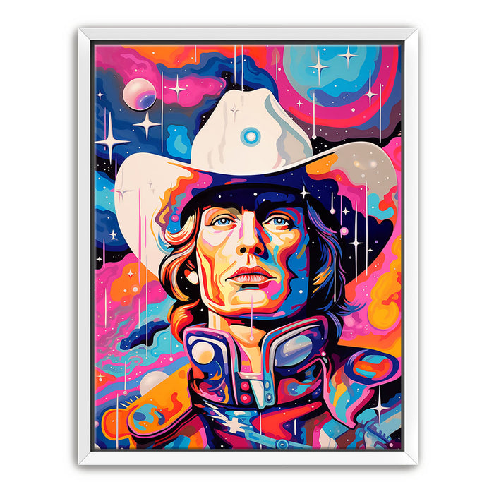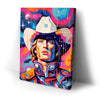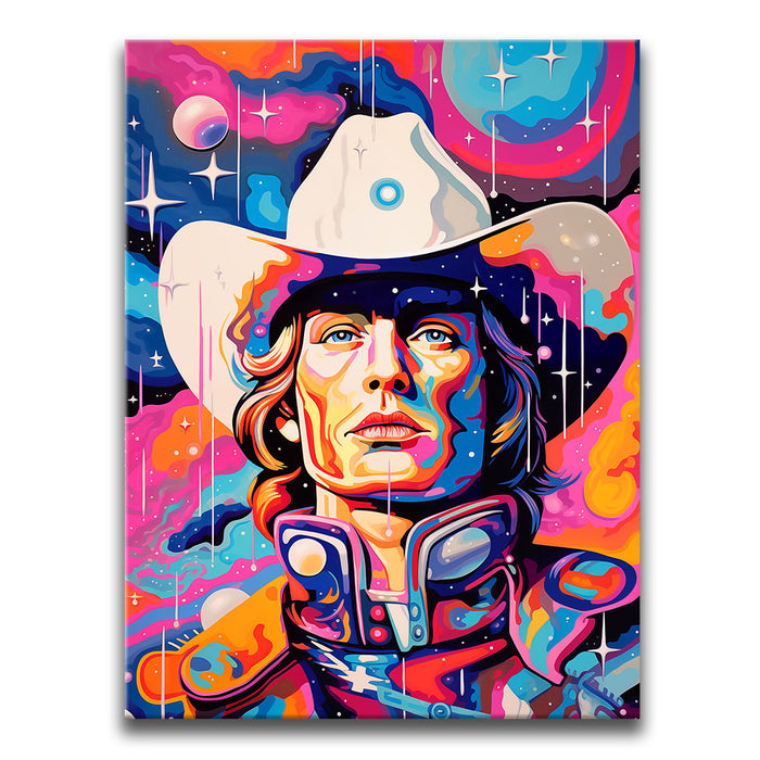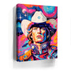 The Jolly Rancher by Sean Pearce is a vibrant abstract portrait that captures the spirit of the Wild West. Featuring a colorful cowboy in a wide-brimmed hat set against a starry backdrop, this artwork blends bold colors and expressive shapes to evoke the rugged charm of cowboy life.