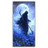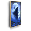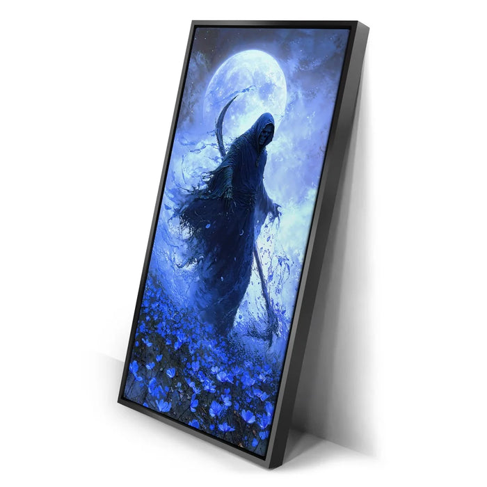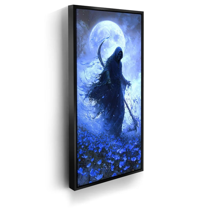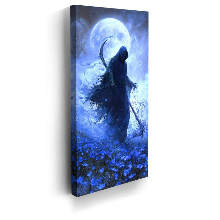 The Last Bloom wall art blends haunting beauty with serene mystery, portraying the Grim Reaper cloaked in icy blue light as he walks among delicate flowers beneath a luminous moon. This powerful piece captures the fragile balance between life and death, with breathtaking detail that evokes peace, reflection, and strength.
