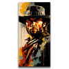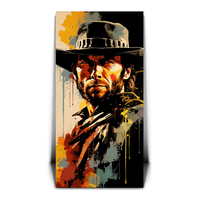 This striking piece, titled "The Man With No Name FillScale," captures the iconic character portrayed by Clint Eastwood in the classic Dollars Trilogy. Rendered in an abstract style by Sean Pearce, the artwork features bold splashes of color and dramatic contrasts that emphasize the rugged, mysterious essence of the nameless gunslinger. The drips of paint add a dynamic, almost chaotic energy to the piece, reflecting the tension and grit of the Western genre.